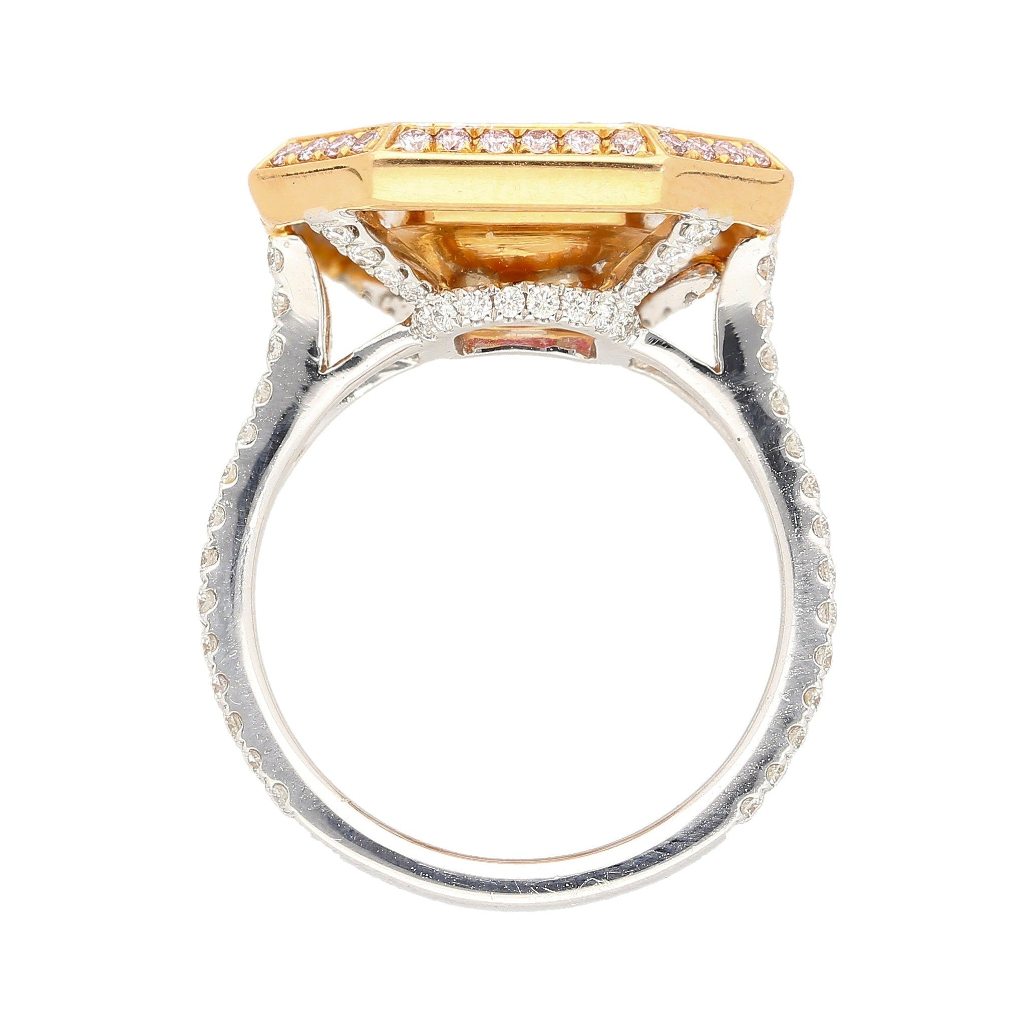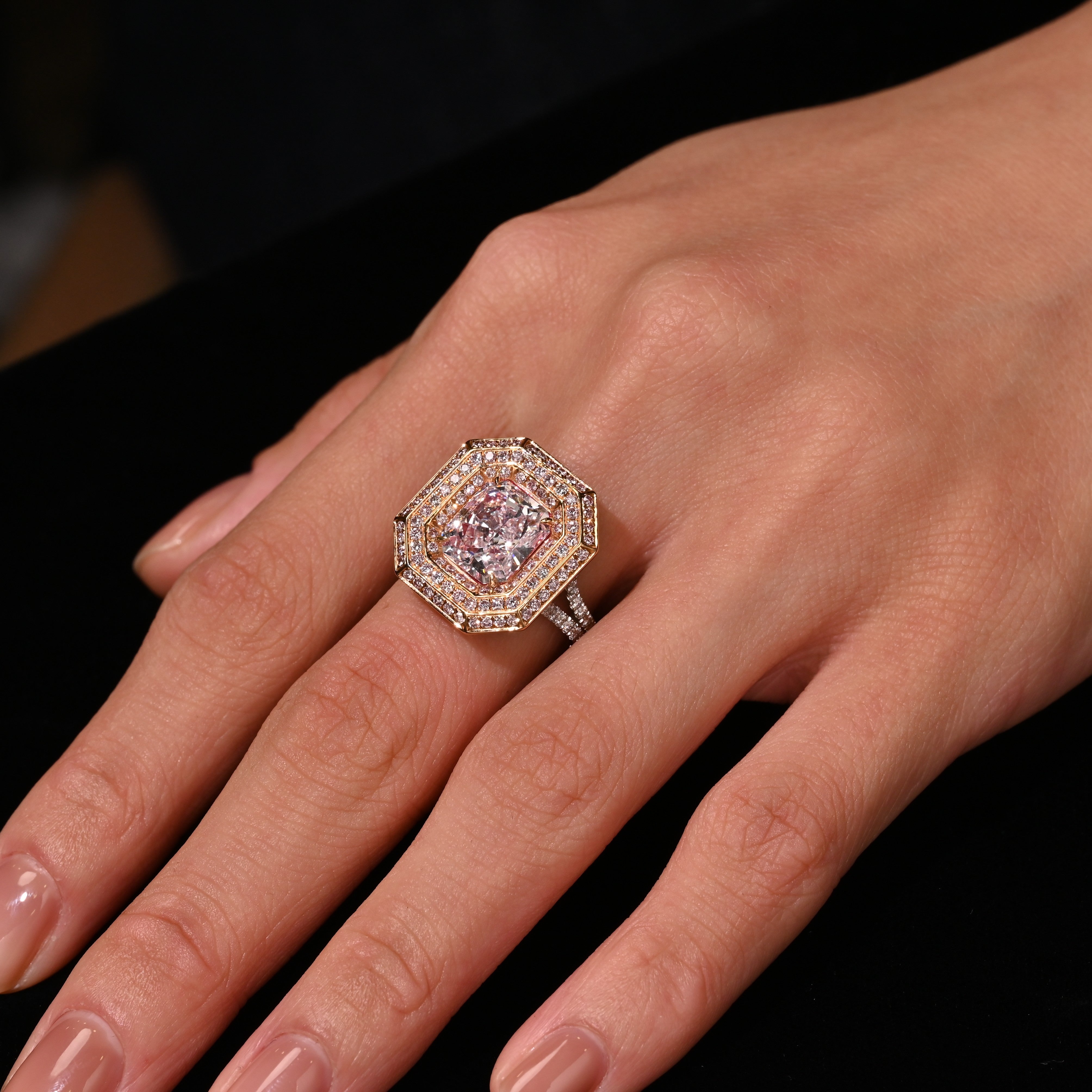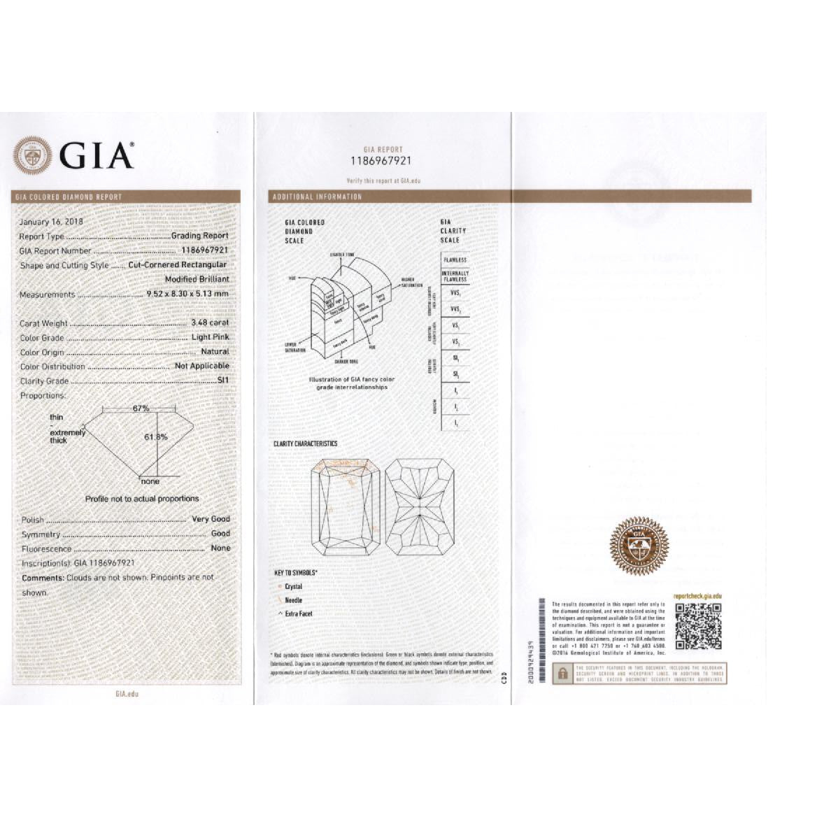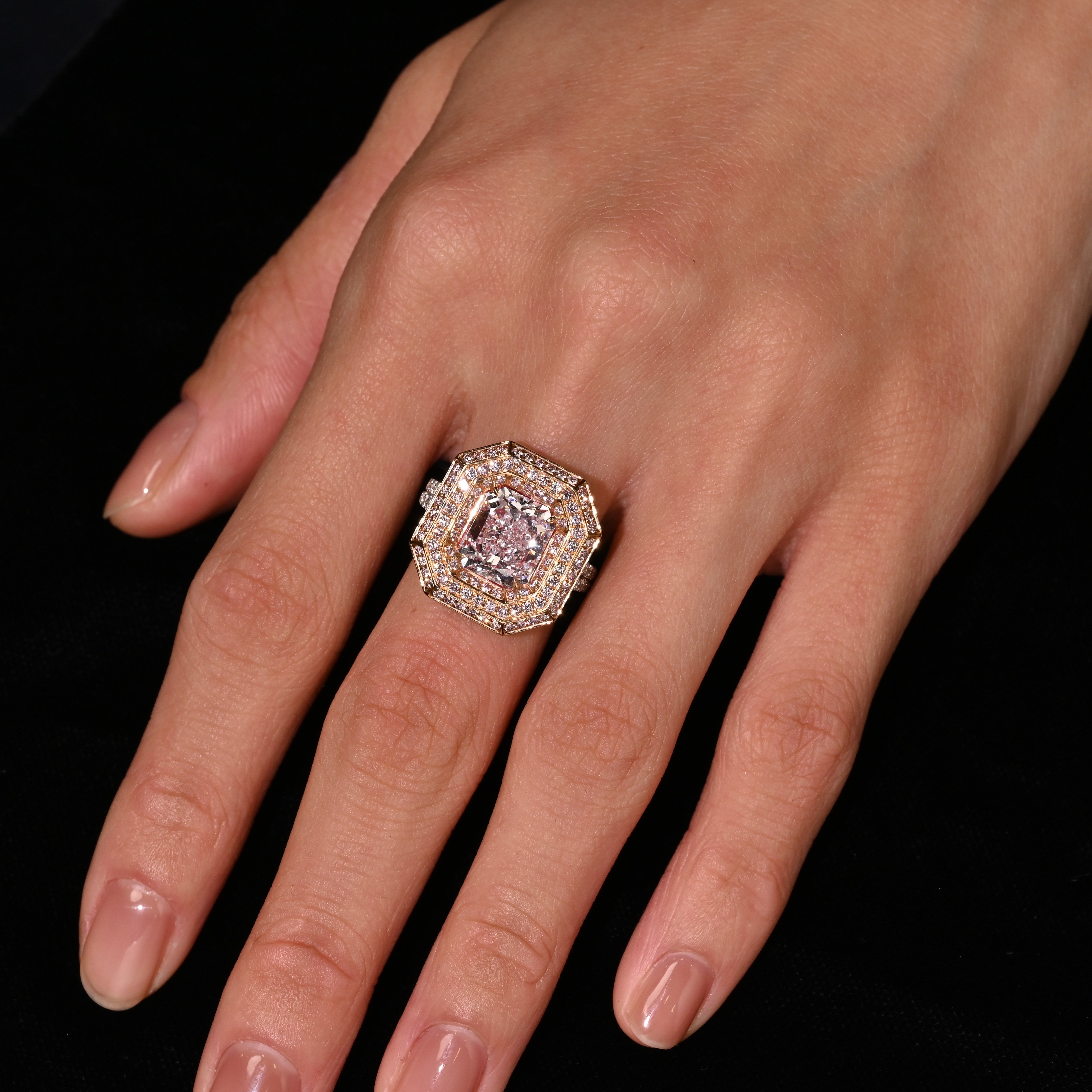 GIA Certified natural 3.48 carat light pink radiant cut SI1 clarity diamond ring. Set in 18k white and rose gold with a triple halo of round brilliant-cut pink diamonds. Wide frame with a cathedral and split shank of pave set white diamonds.
