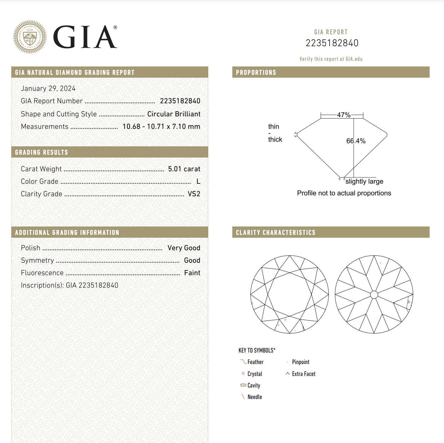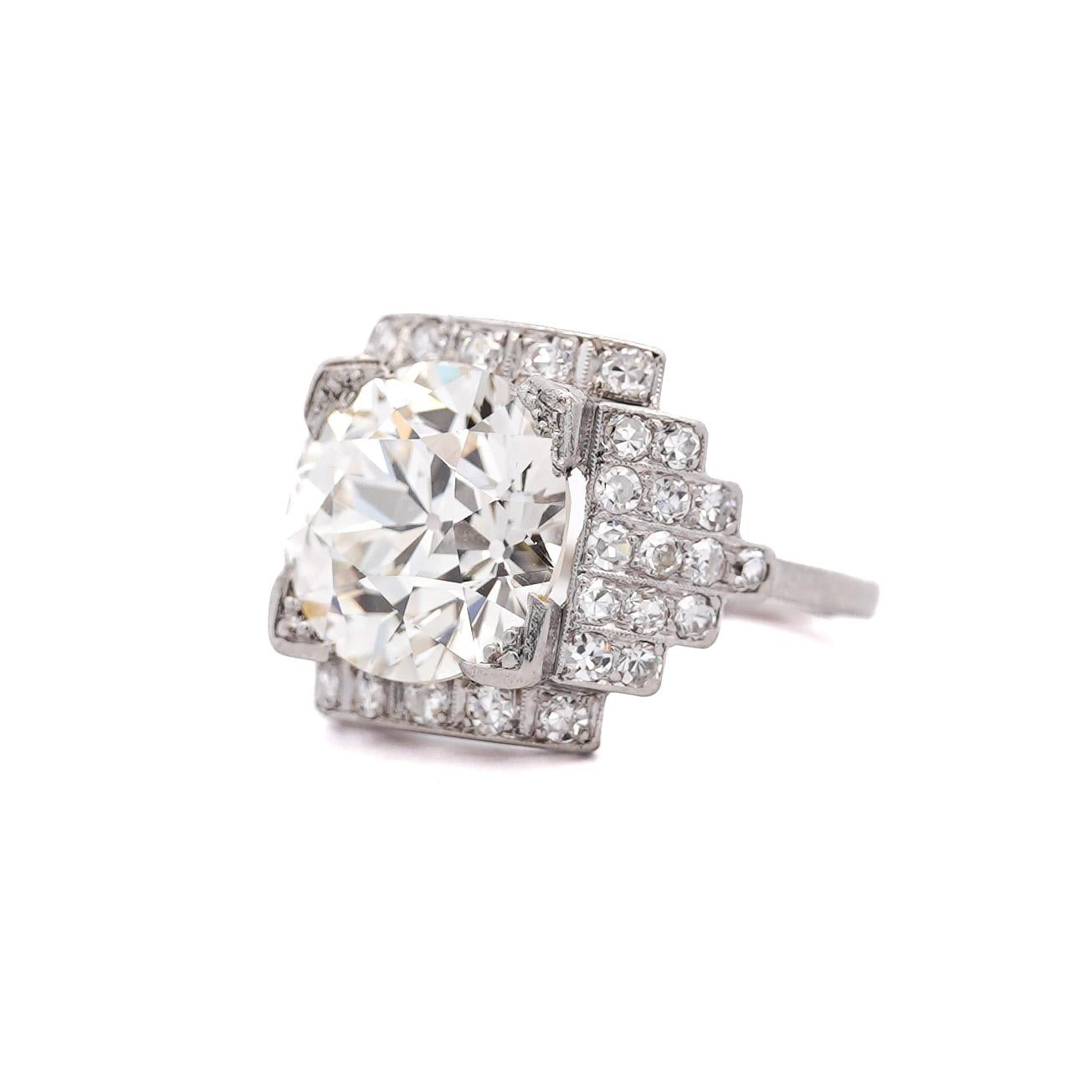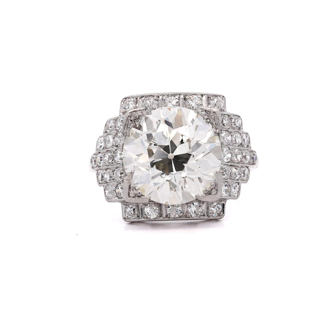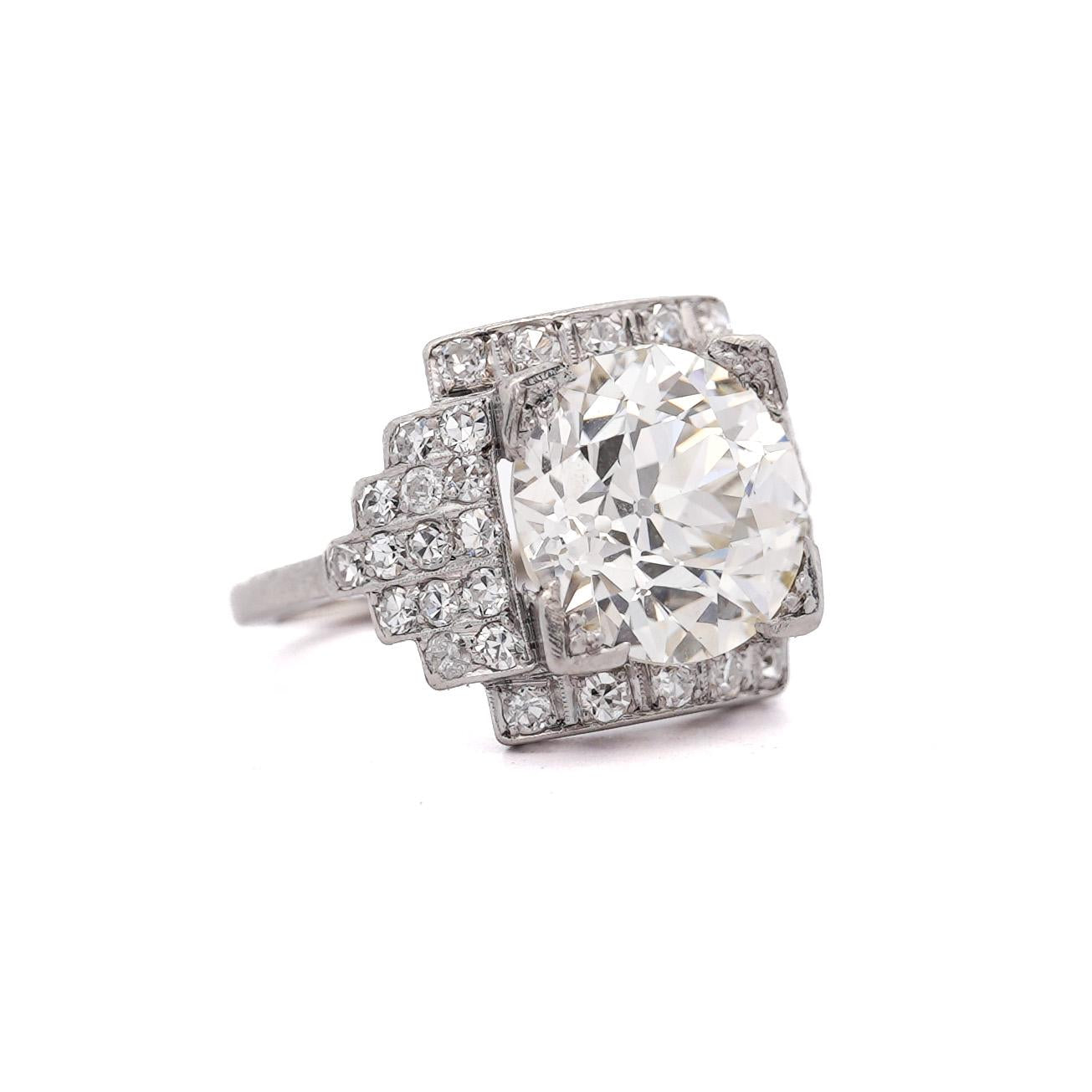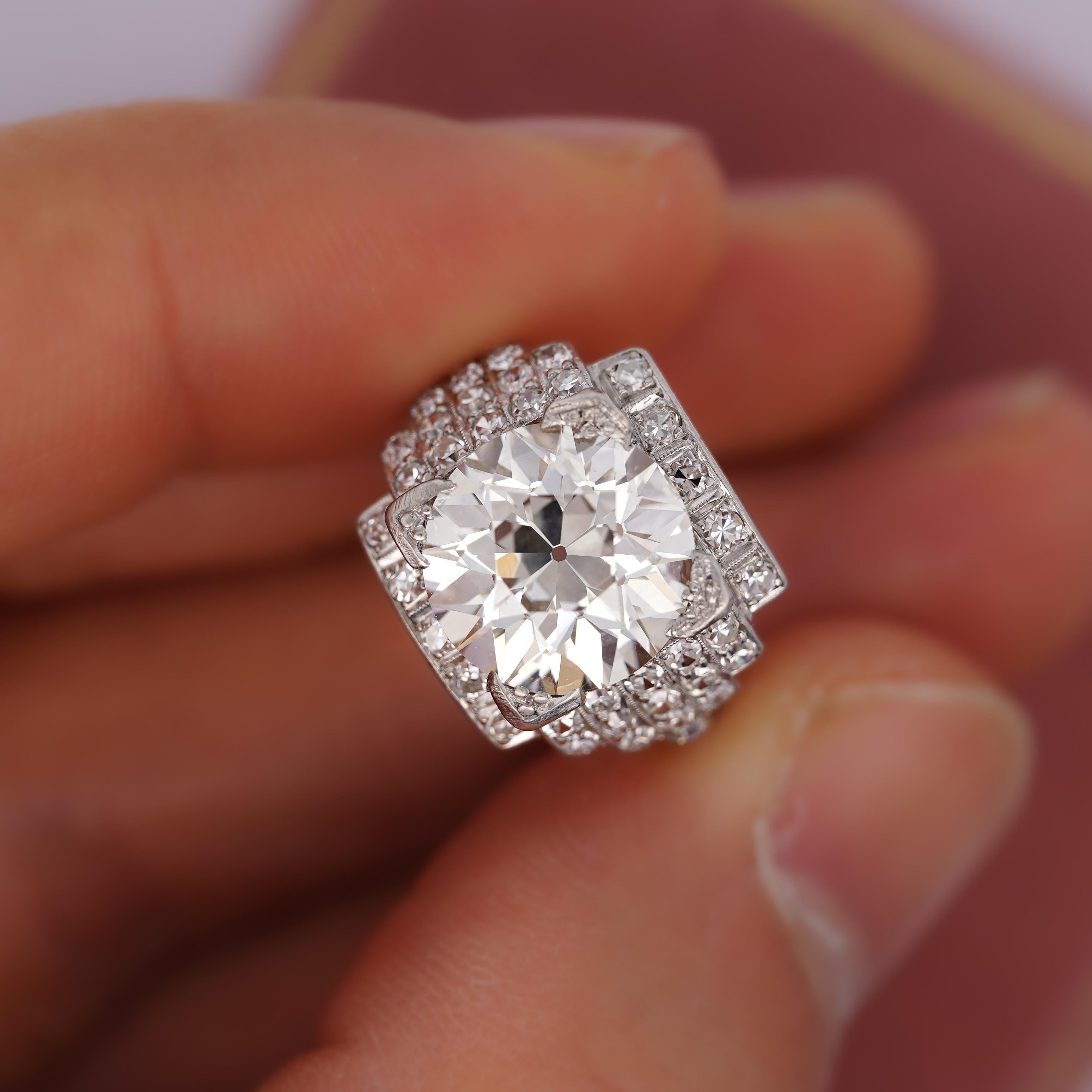This exquisite Edwardian antique engagement ring is a testament to timeless artistry of a bygone era. Crafted in platinum, it features a warm L color 5.01-carat old European cut diamond as its center, radiating vintage charm. A halo of descending 38 old-cut diamonds enhances the center stone, adding dimension and sparkle to this heirloom-worthy design. Intricate milgrain detailing highlights the craftsmanship of the era, creating a one-of-a-kind piece steeped in history. Perfect for those who appreciate enduring beauty and authentic antique style, this ring is a true treasure from the early 1900s, complete with a GIA certification.