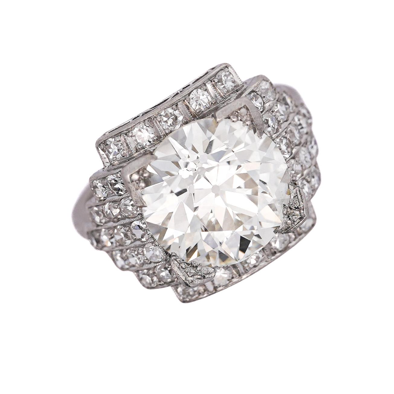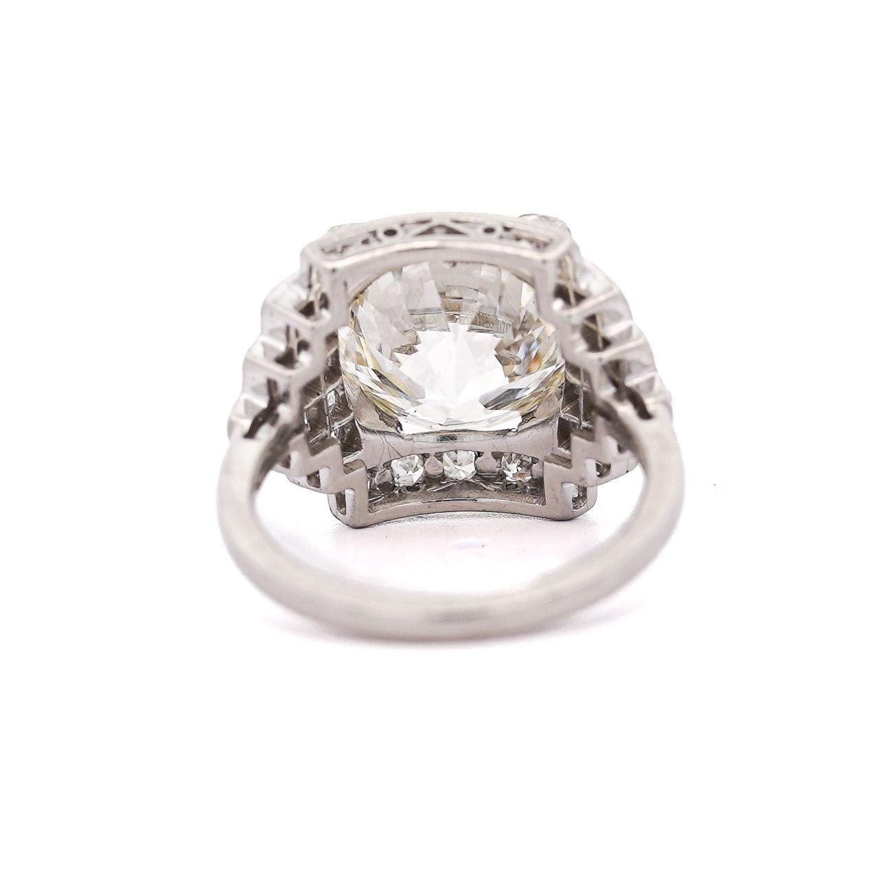 An antique Edwardian-era platinum engagement ring featuring a stunning GIA certified 5.01-carat old European cut diamond surrounded by a dazzling halo of 38 old-cut cascading diamonds.