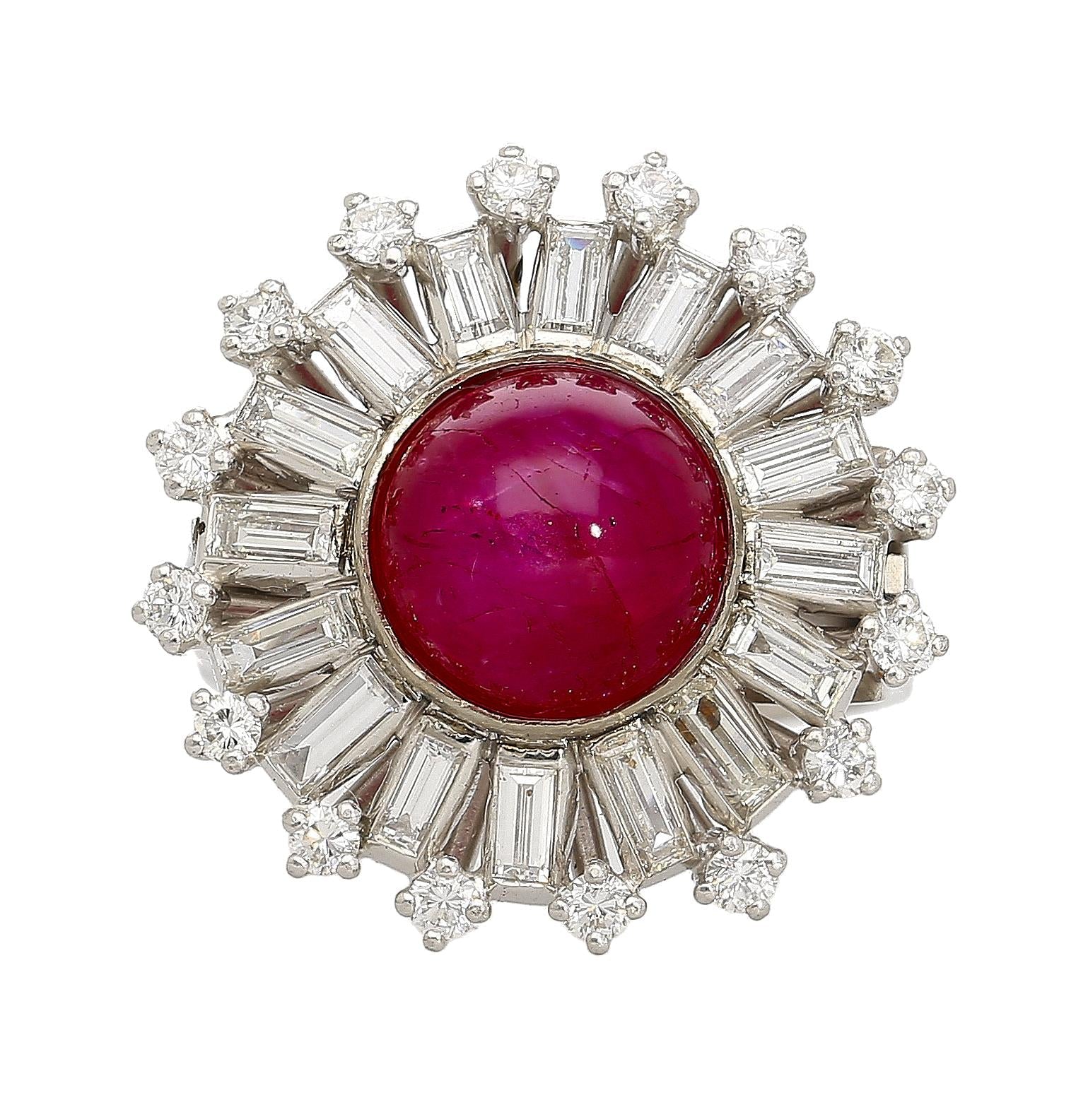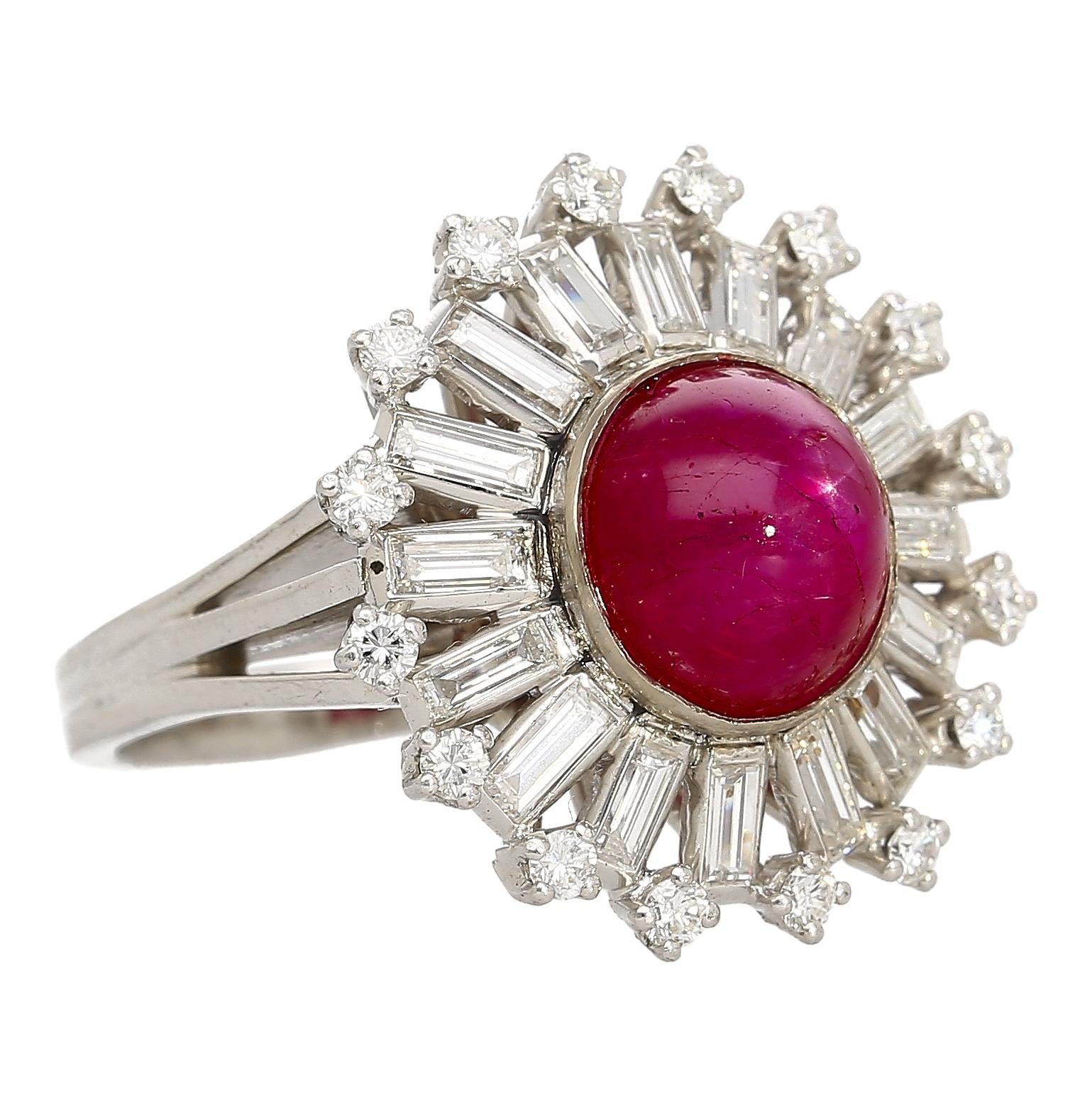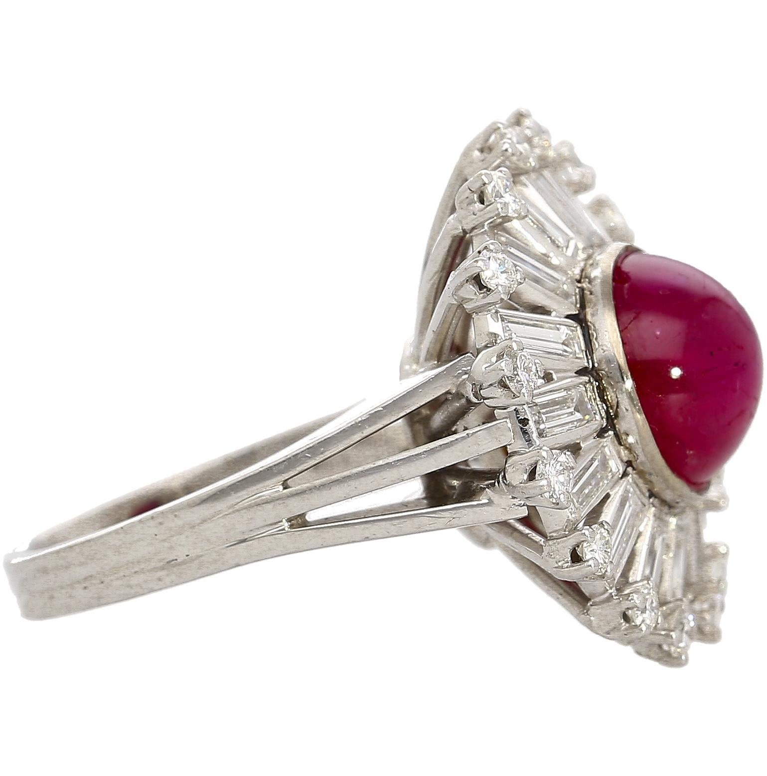 7.40 Carat Cabochon Star Ruby Baguette Round Diamond Ballerina Halo Cocktail Ring Art Deco 18K White Gold Split Shank