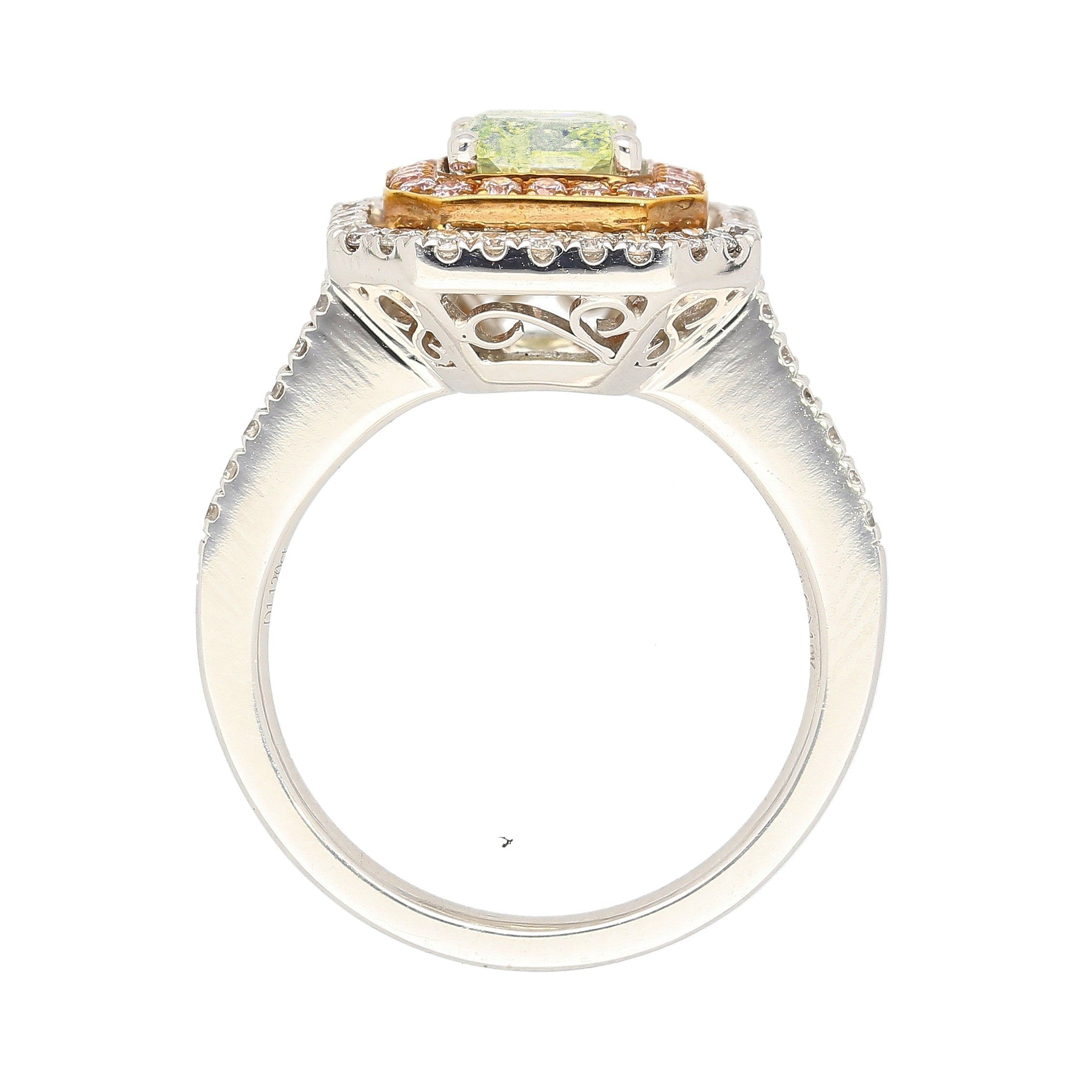 Discover the extraordinary beauty of our 1.12 Carat Fancy Light Greenish Yellow Natural Diamond Engagement Ring. Set in 18k white gold, this captivating ring features a vibrant center stone that takes center stage. Adorned with a pink diamond halo and a white diamond halo. With its wide-framed design, this ring offers excellent finger coverage while providing great color contrast, allowing the fancy color diamond to shine. Make a unique statement with this remarkable symbol of love.