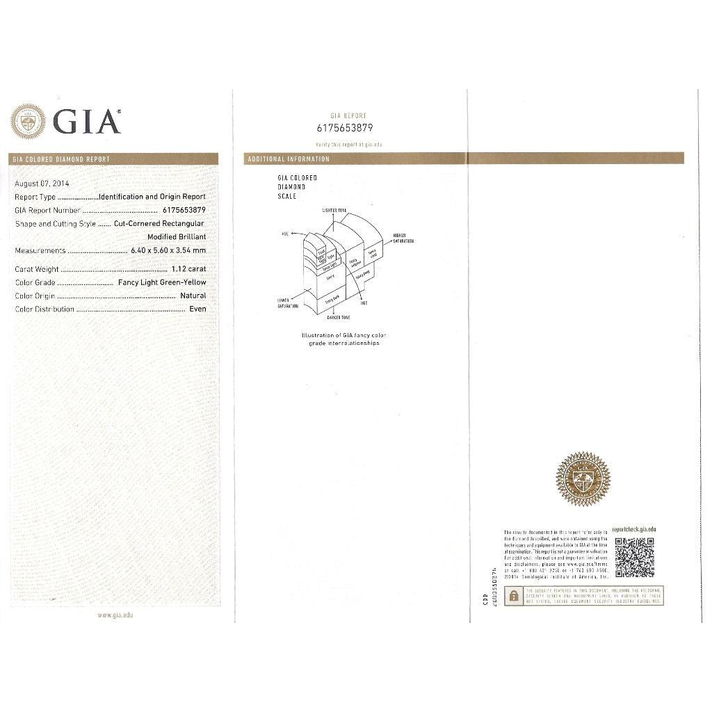 GIA Certified 1.12 carat Radiant Cut Fancy Light Green-Yellow Diamond and Diamond Halo Ring