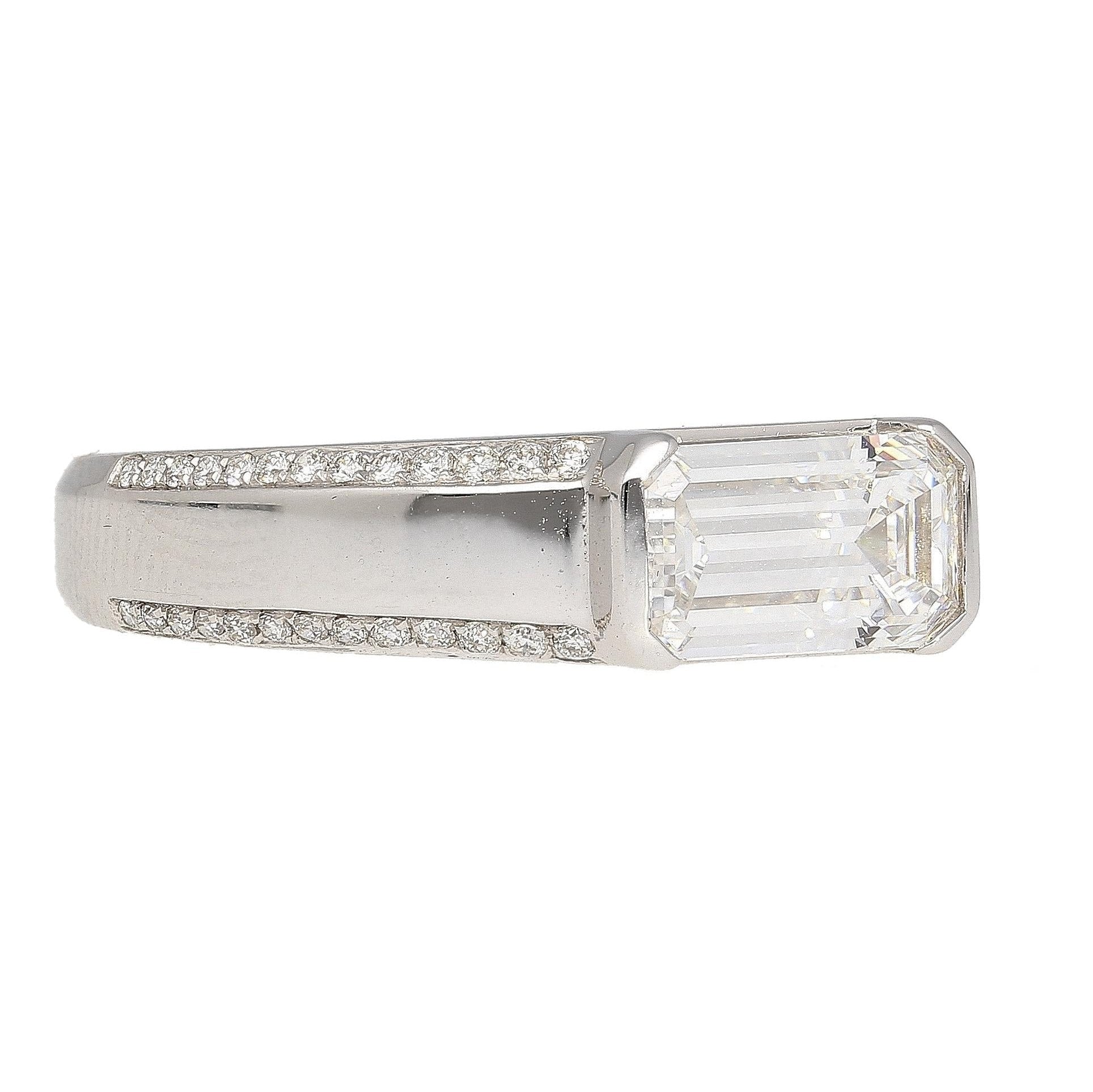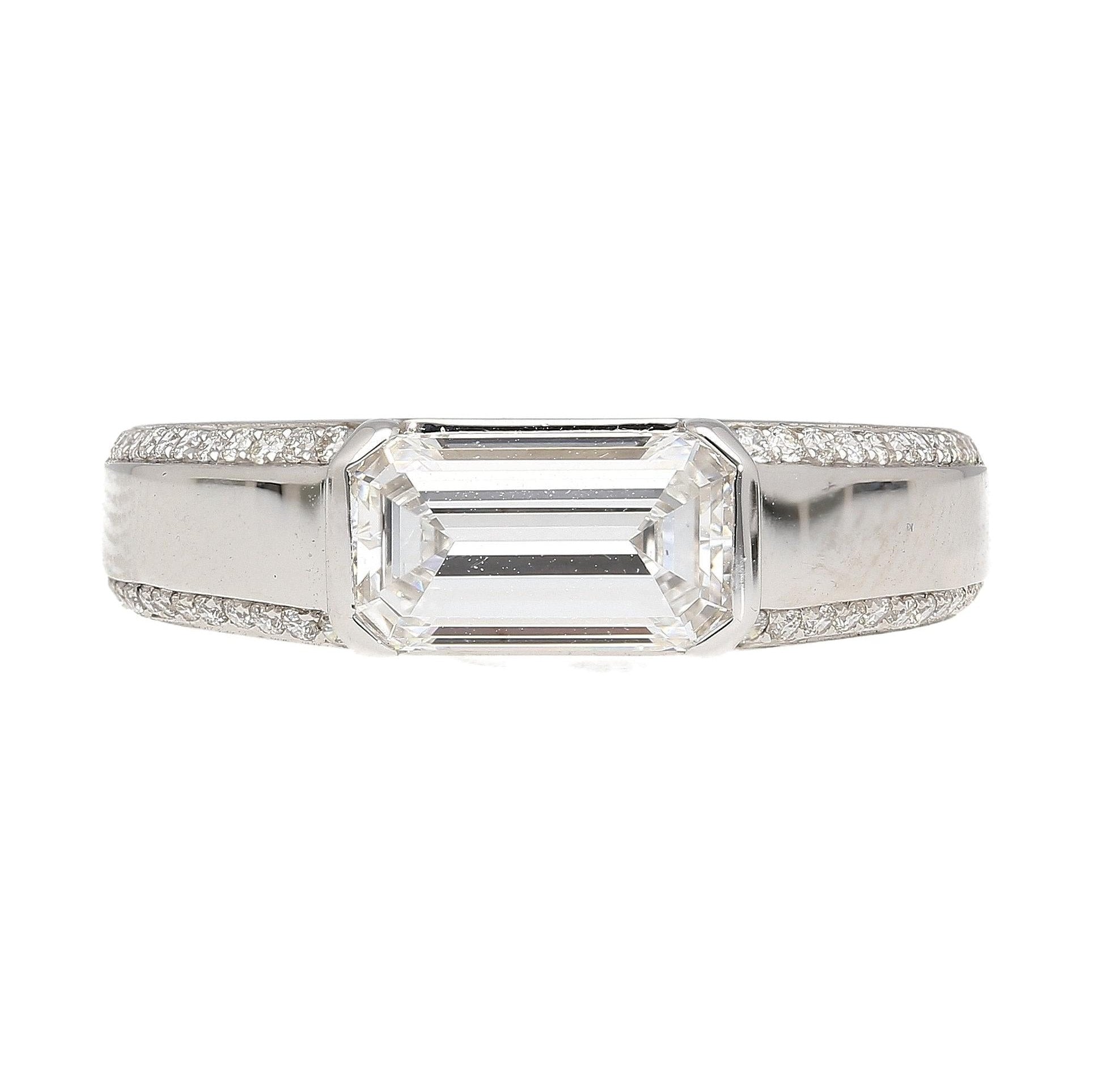 GIA certified 1.33 carat natural emerald cut diamond set east west in an 18K white gold band ring. The ring uses a half bezel setting with an open back and pavé set round diamond side stones.
