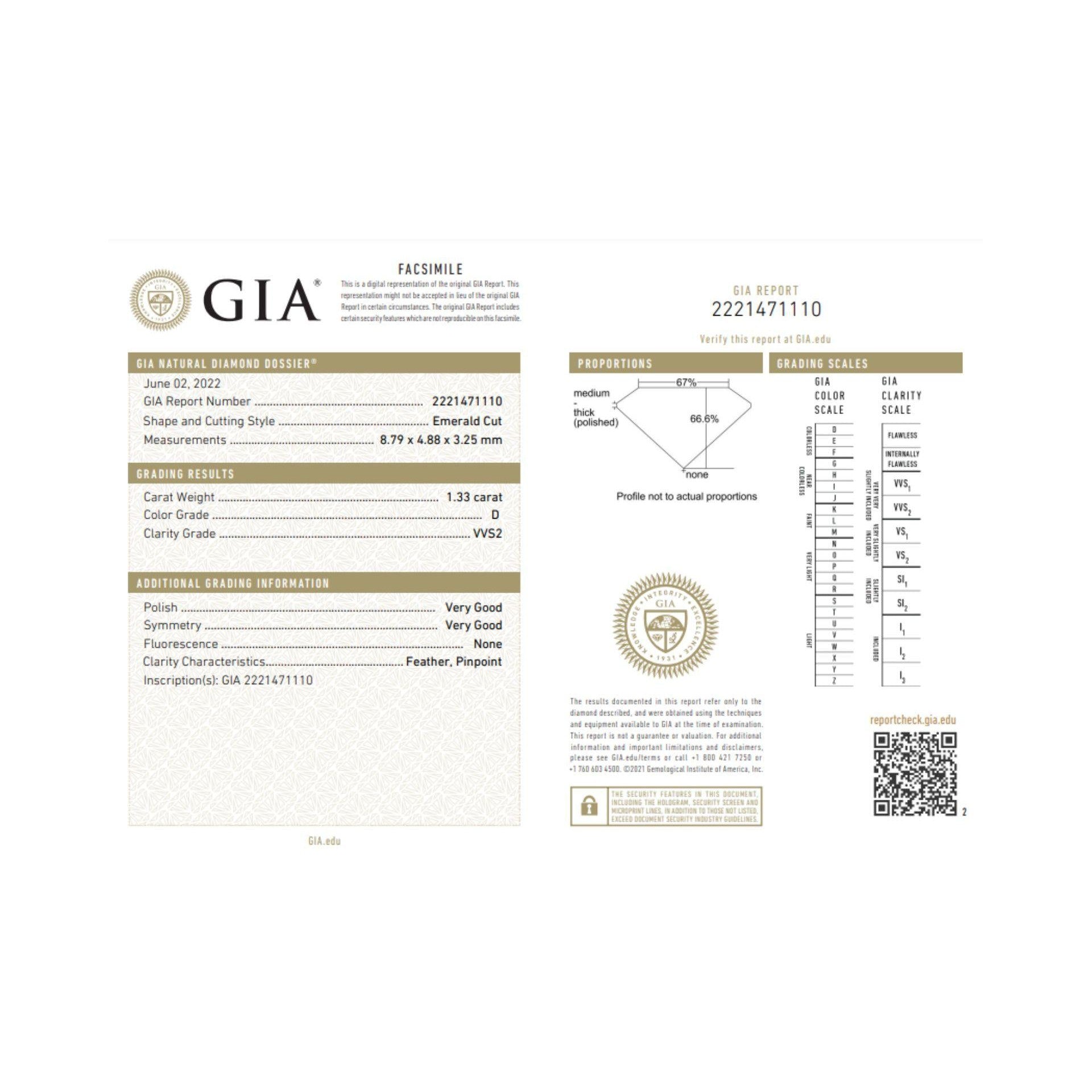 - Accompanied by GIA report no. 2221471110 stating the diamond is natural, emerald cut, D color, VVS2 clarity, weighing 1.33 carats