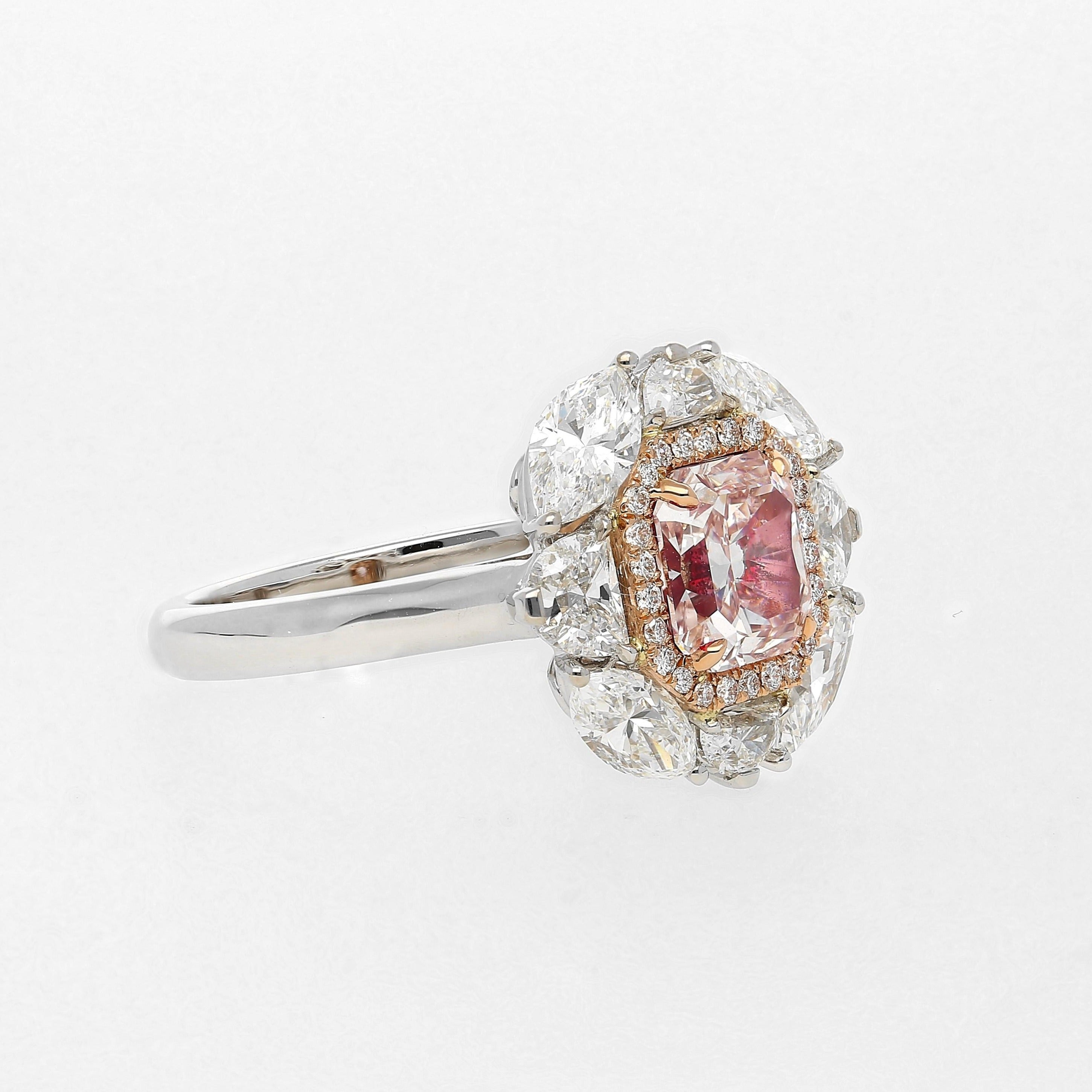 GIA certified 1.69 carat natural fancy color diamond engagement ring set in 18K rose and white gold. Radiant cut brownish pink diamond ring with mixed cut diamond halo and architectural side stone design.