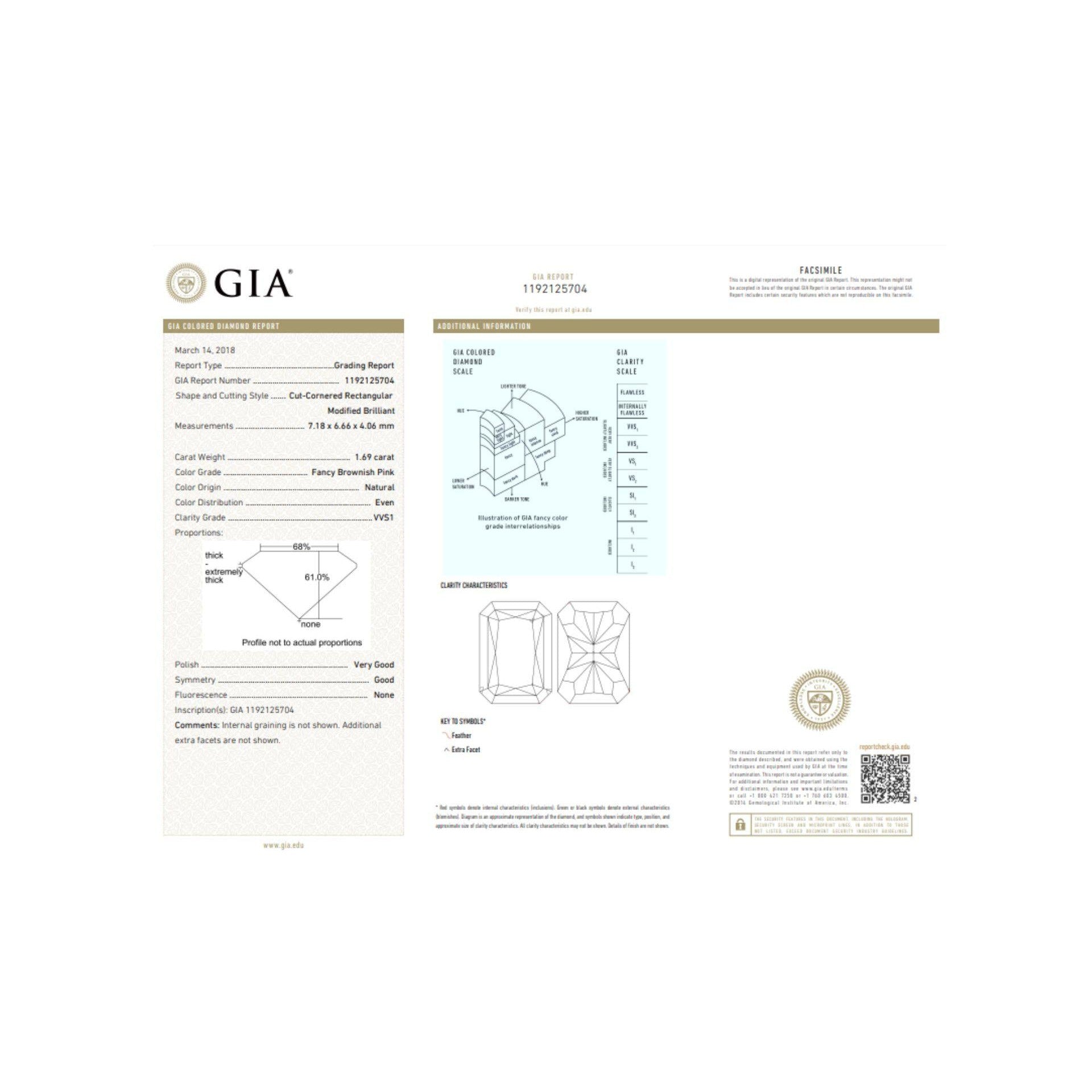 Accompanied by GIA report no. 1192125704 stating the diamond is natural, radiant cut, Fancy brownish pink in color with even distribution, VVS1 clarity, with listed measurements and carat weight.