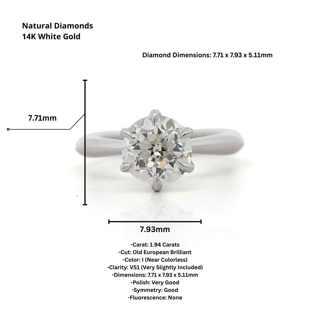 GIA certified 1.94 carat old European cut diamond solitaire ring in 14K white gold featuring I color, VS1 clarity with six prong cathedral shank setting. Measures 7.71 x 7.93 x 5.11mm, total weight 3.86 grams, ring size 4.75, adjustable.