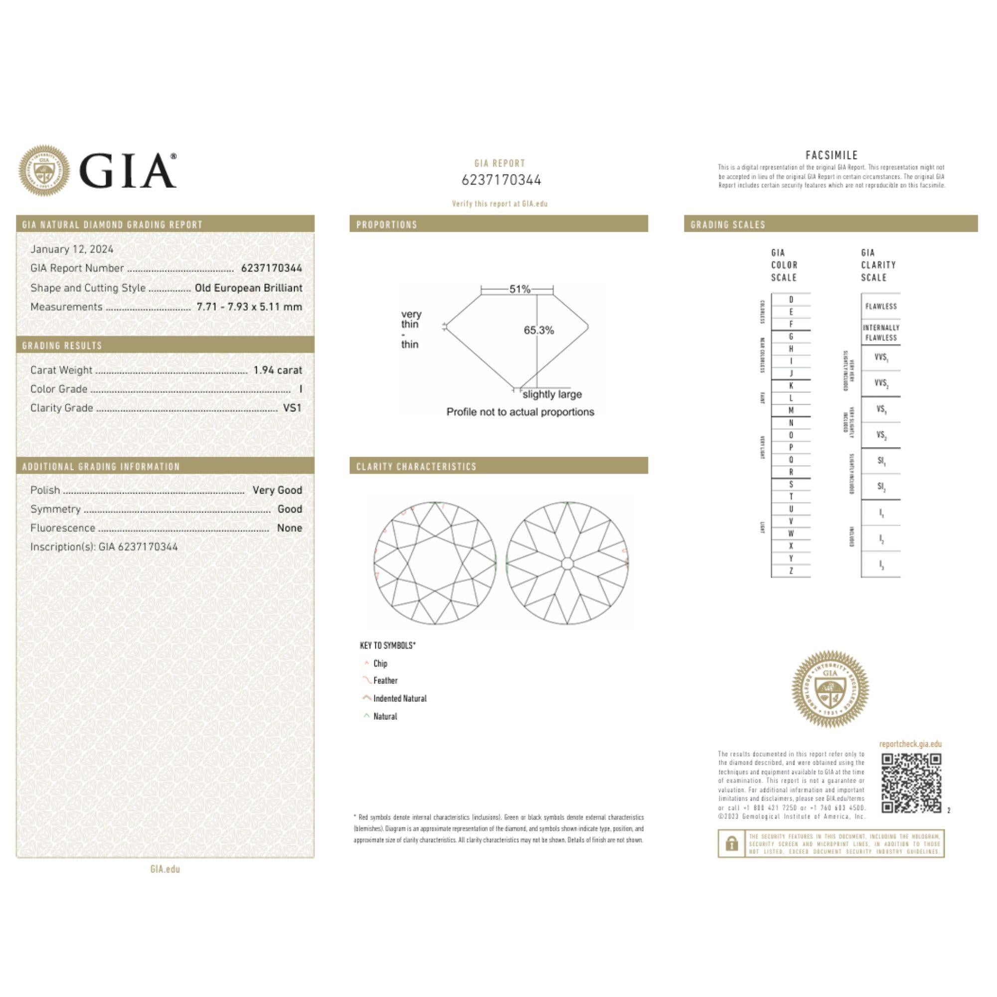 About The Diamond This 1.94 carat old European cut diamond exhibits I color placing it in the near colorless range with minimal tint visible to the untrained eye. VS1 clarity ensures eye-clean appearance with only minute inclusions visible under 10x magnification. The old European brilliant cut represents historic diamond cutting from the late 19th to early 20th century, featuring larger facets and higher crown than modern brilliant cuts. Very good polish and good symmetry demonstrate quality craftsmanship in the original cutting. None fluorescence confirms natural diamond characteristics without reactive properties under UV light.