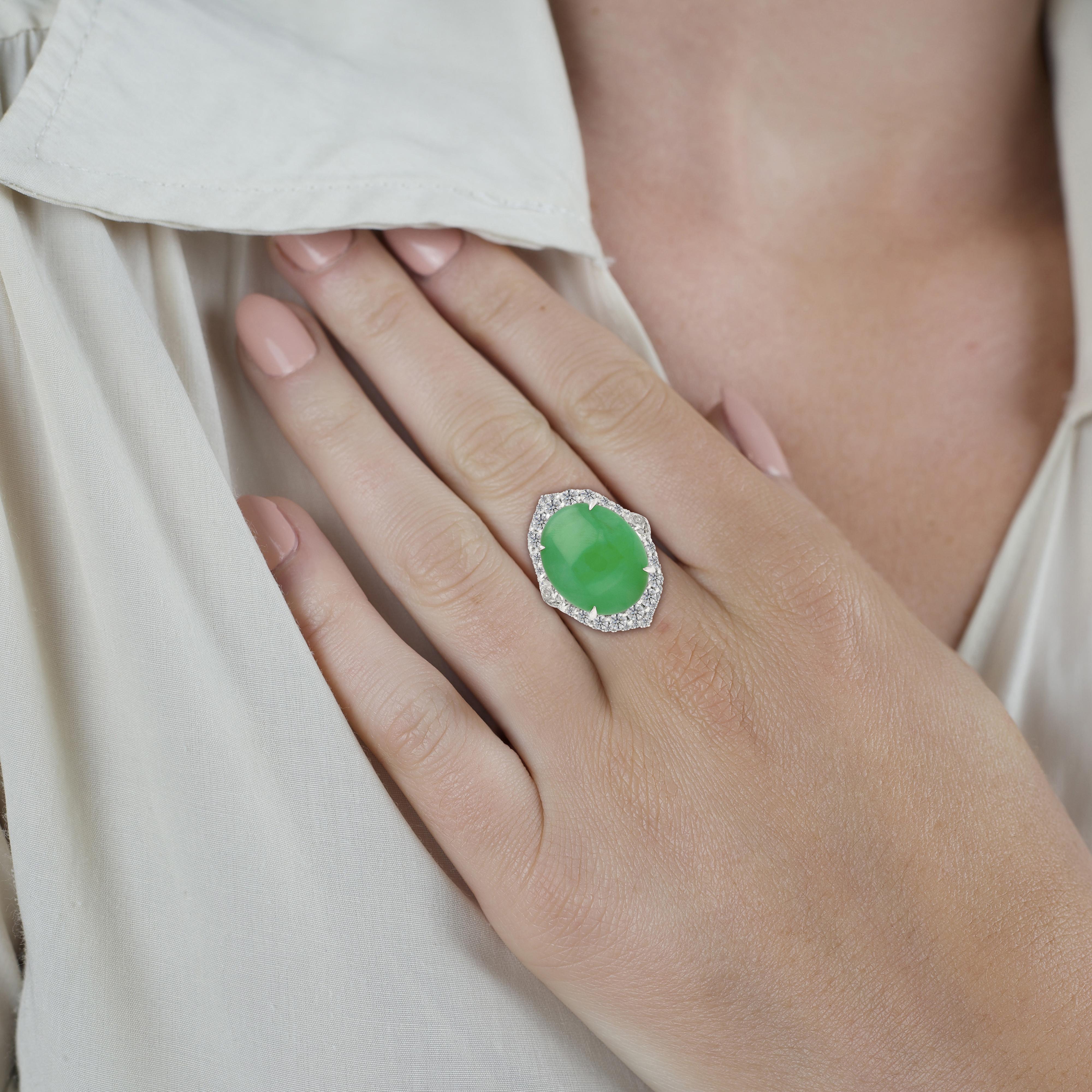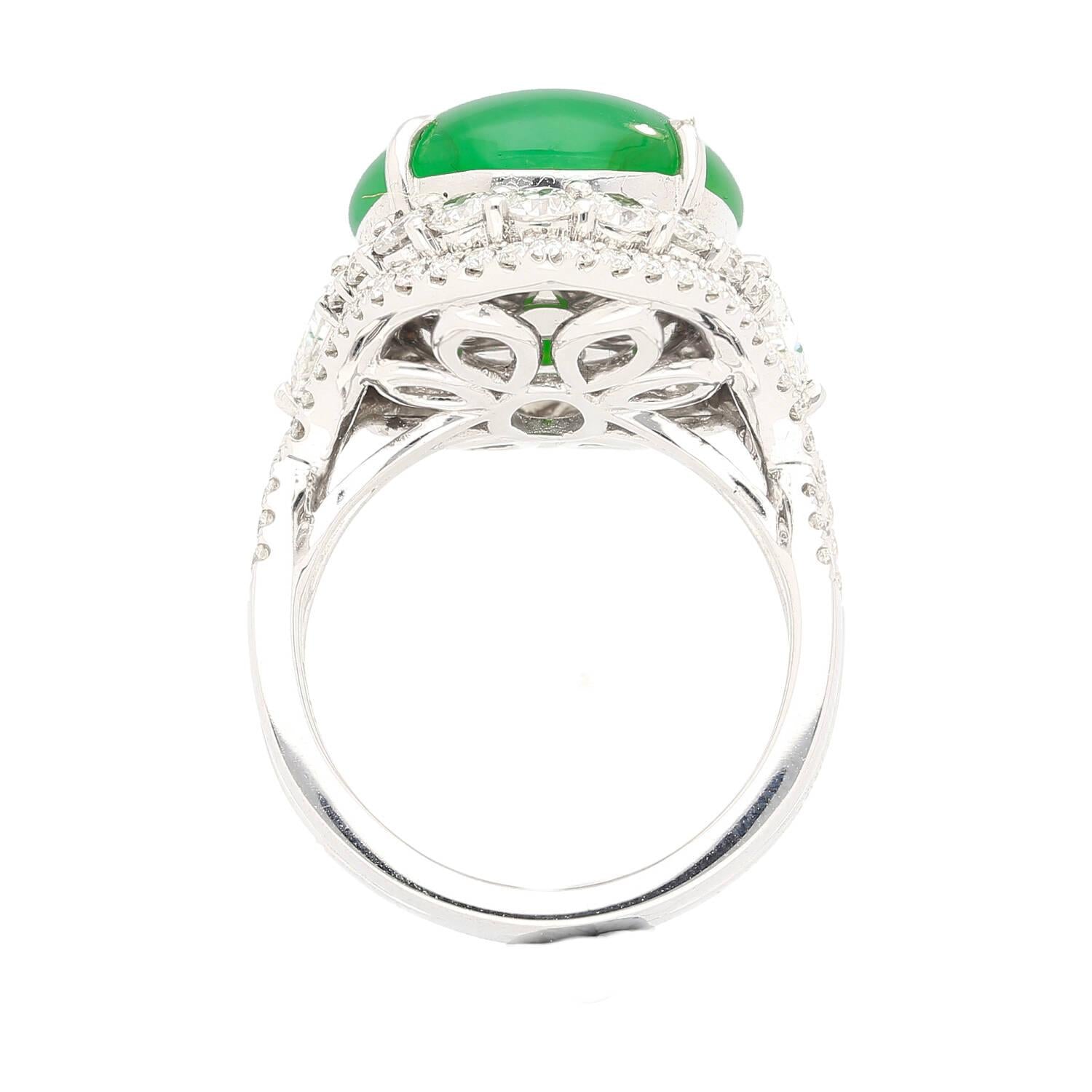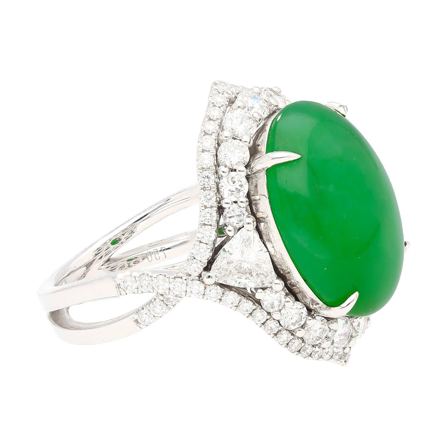 GIA and HK Jade & Stone Lab certified 14.68 carat natural Type A jadeite jade set in an 18K white gold diamond ring. This is a cabochon oval jadeite jade ring with a curved split shank, trillion cut diamond side stones, and round diamond accents.