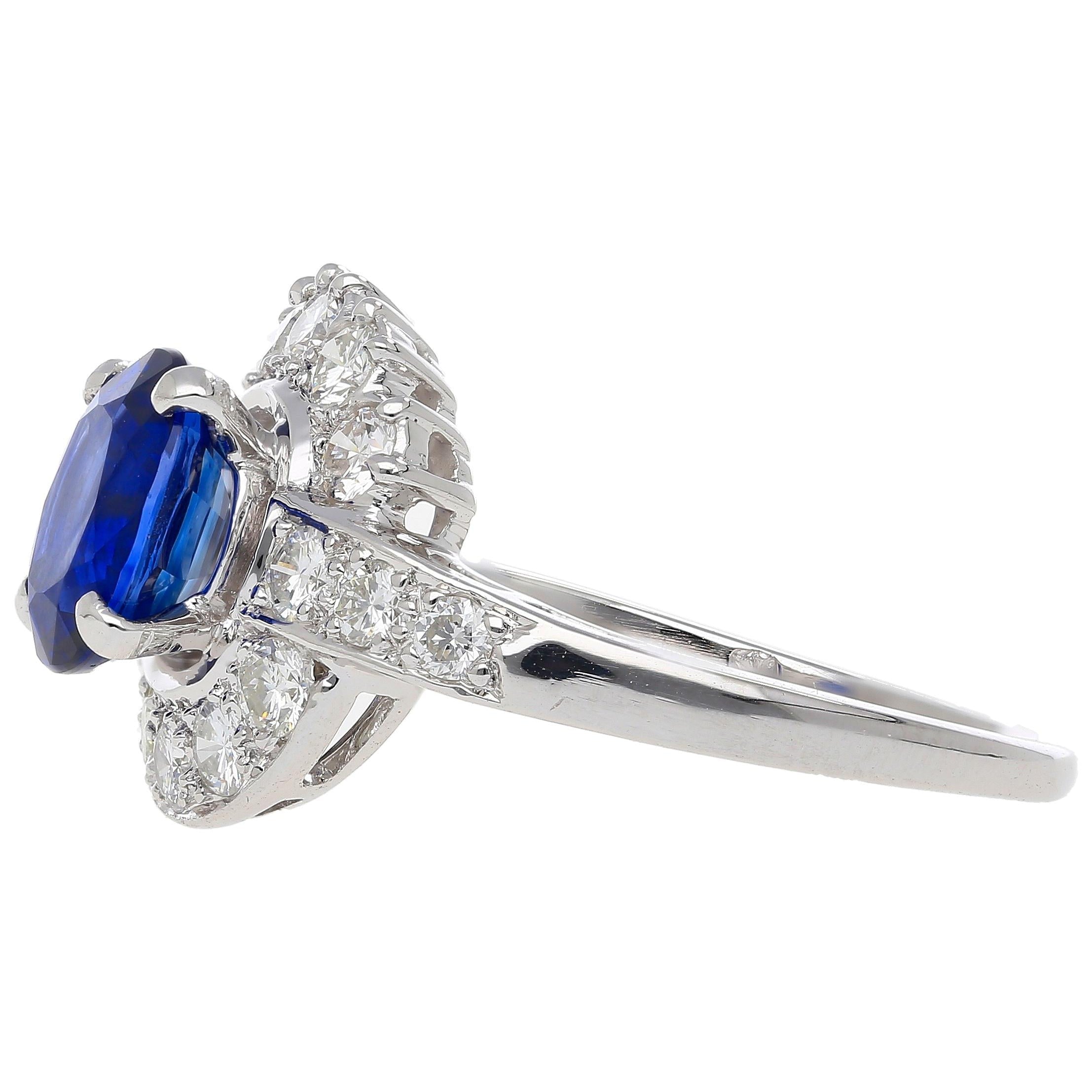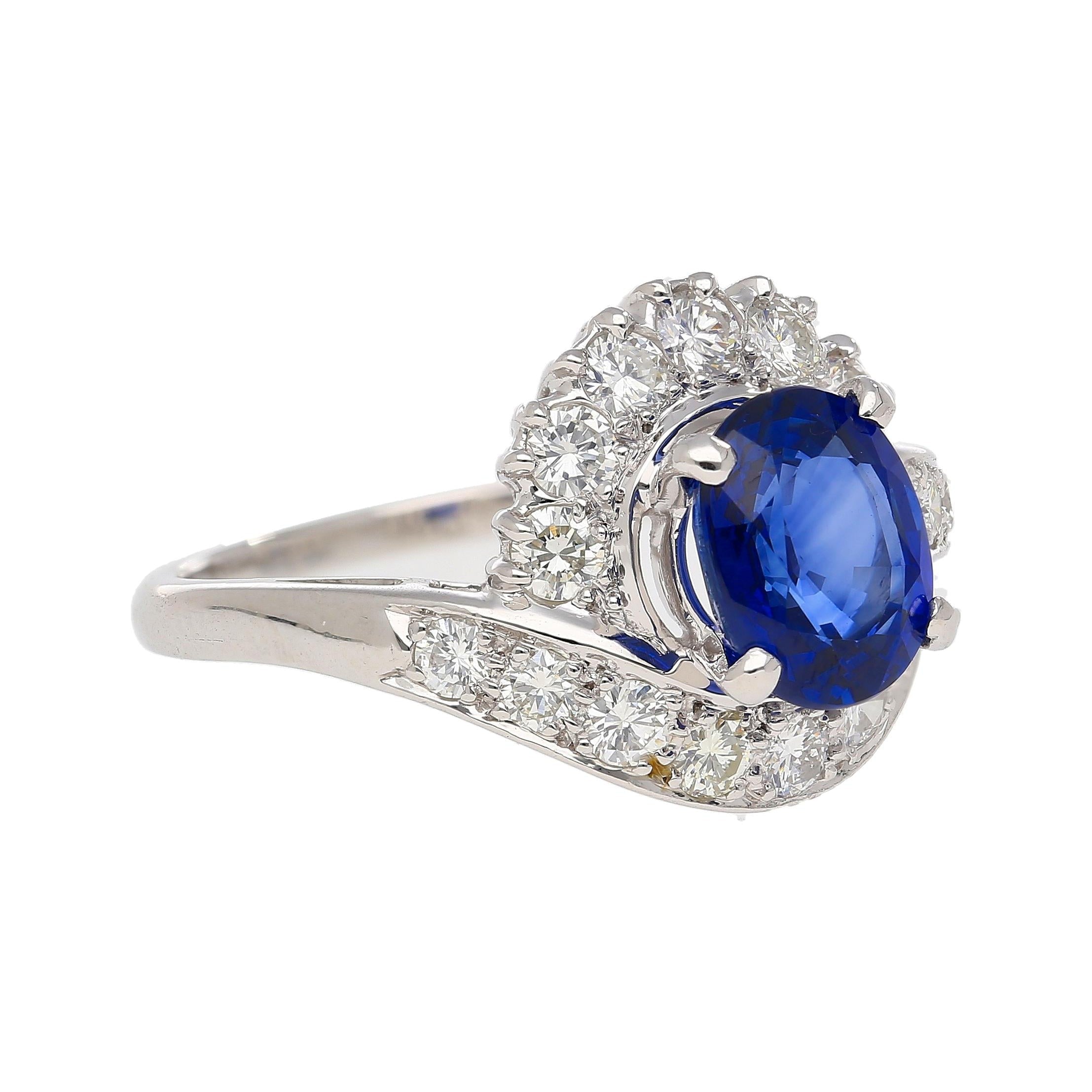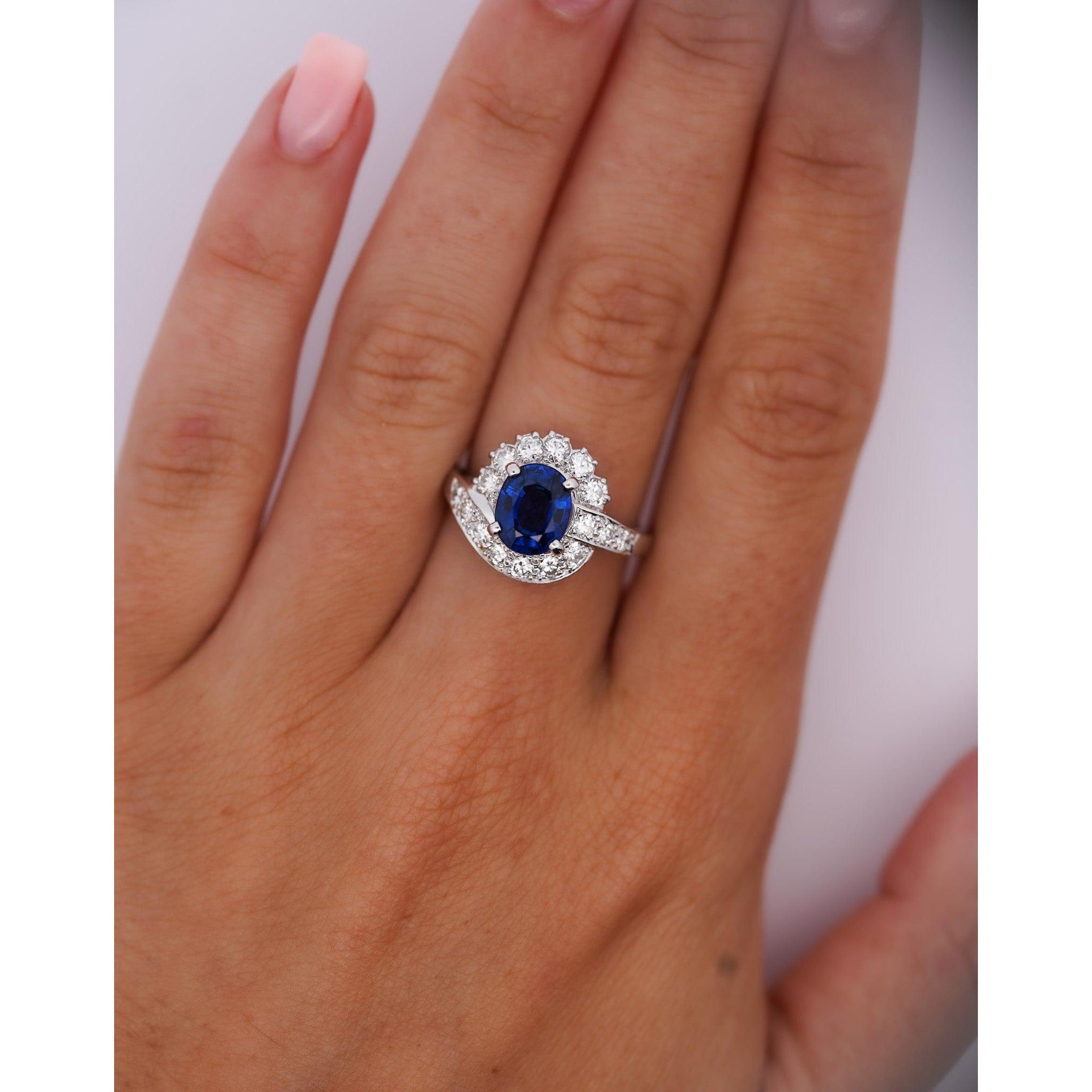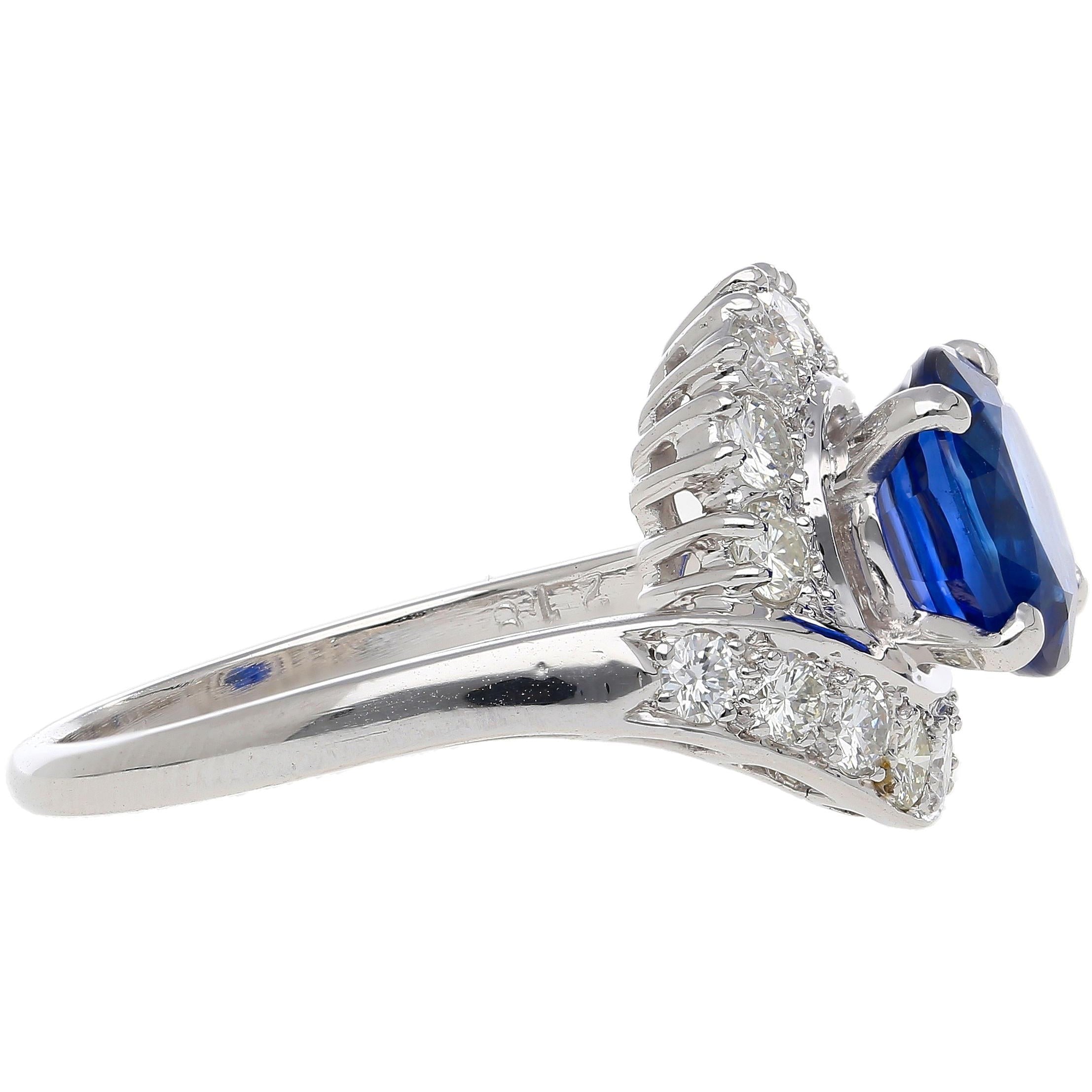 Take center stage with this dazzling 2.18 carat blue sapphire ring. Crafted from the finest platinum, this stunning ring is sure to be the focal point of conversation. The platinum's cool tone enhances the gemstones mesmerizing deep blue hue. The sapphire sits at the center of 16 vibrant white diamonds in a 4-prong setting. The natural diamonds total 1.0 carats and are round cut. The top row of diamonds is securely set in a shared prong setting, while the bottom row is placed carefully into a channel setting; sculpted to perfection the diamonds on this band curve perfectly around the center stone. This ring has GIA certification is size 7 and adjustable. Other platinum or white gold pieces pair well with this breathtaking ring.