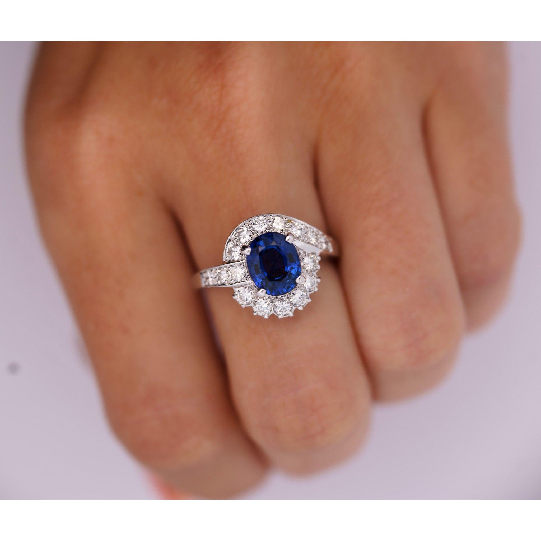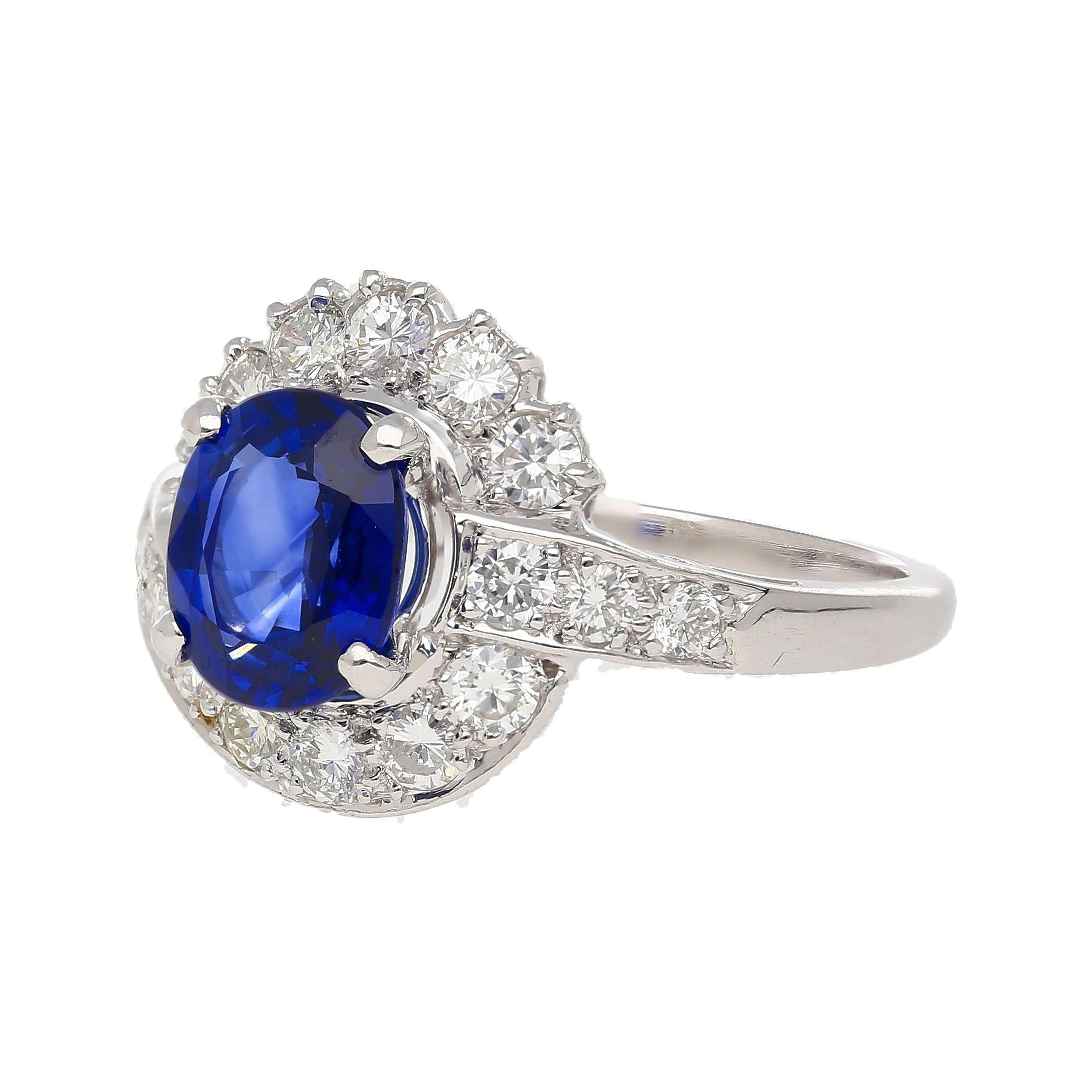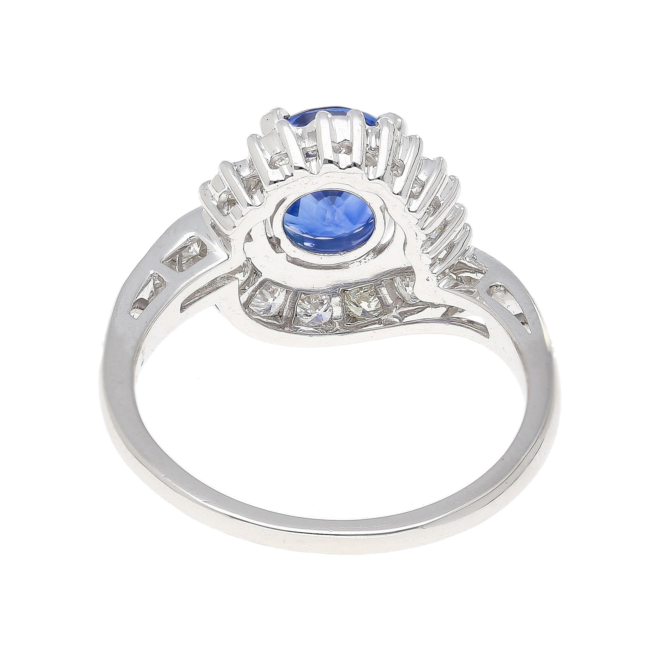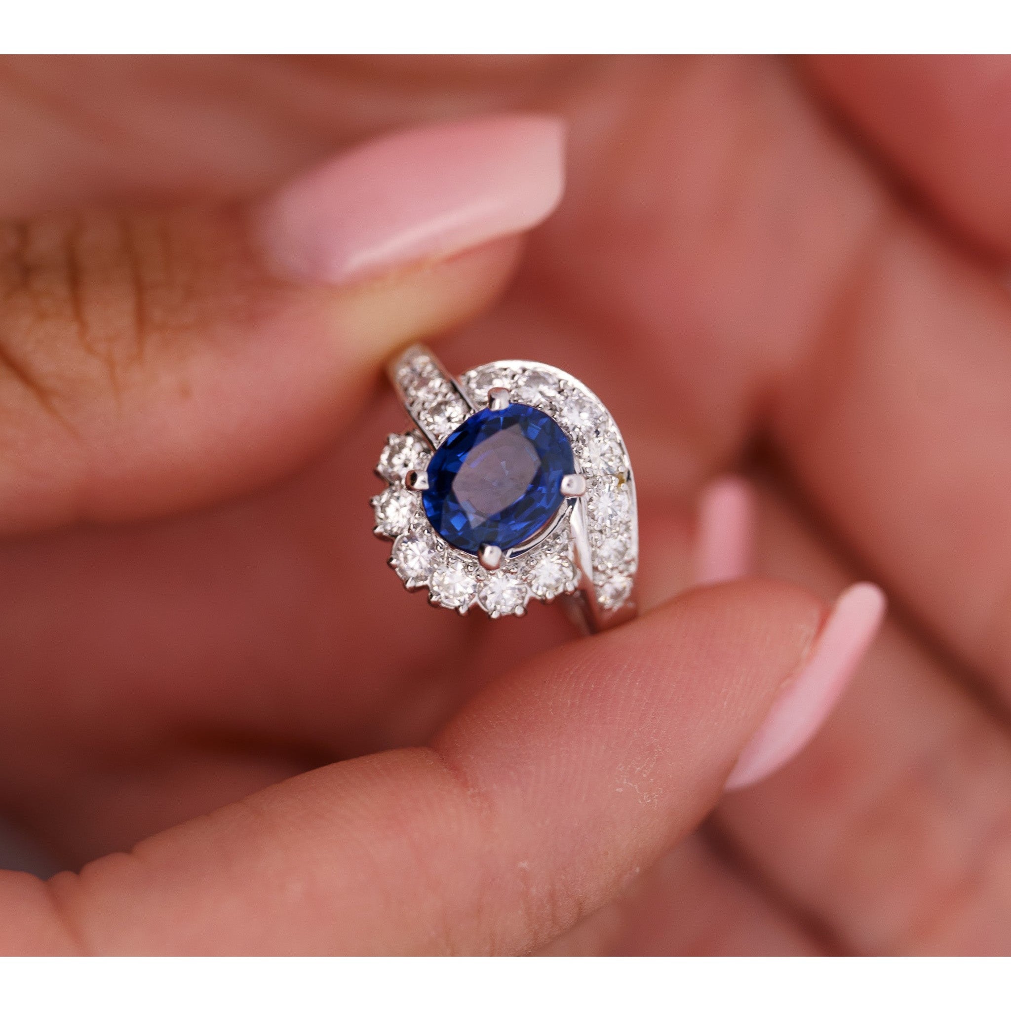 Take center stage with this dazzling 2.18 carat blue sapphire ring. Crafted from the finest platinum, this stunning ring is sure to be the focal point of conversation. The platinum's cool tone enhances the gemstones mesmerizing deep blue hue. The sapphire sits at the center of 16 vibrant white diamonds in a 4-prong setting. The natural diamonds total 1.0 carats and are round cut. The top row of diamonds is securely set in a shared prong setting, while the bottom row is placed carefully into a channel setting; sculpted to perfection the diamonds on this band curve perfectly around the center stone. This ring has GIA certification is size 7 and adjustable. Other platinum or white gold pieces pair well with this breathtaking ring.