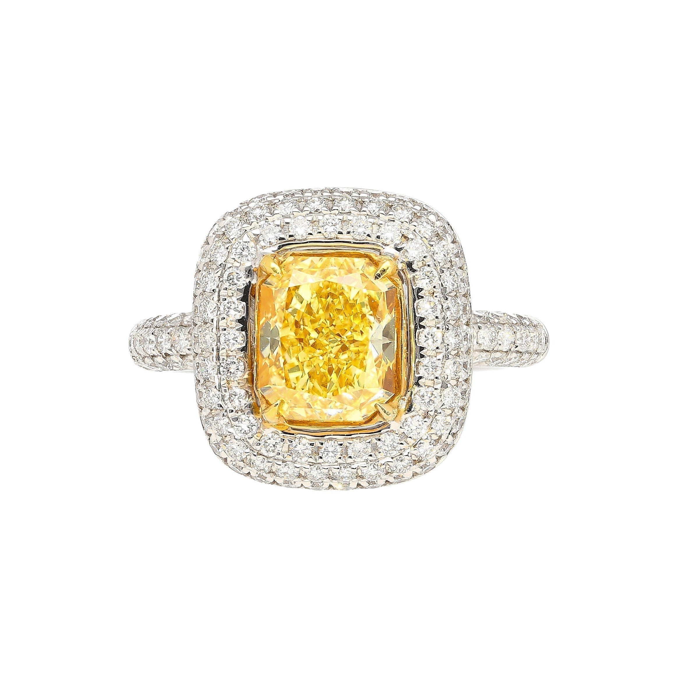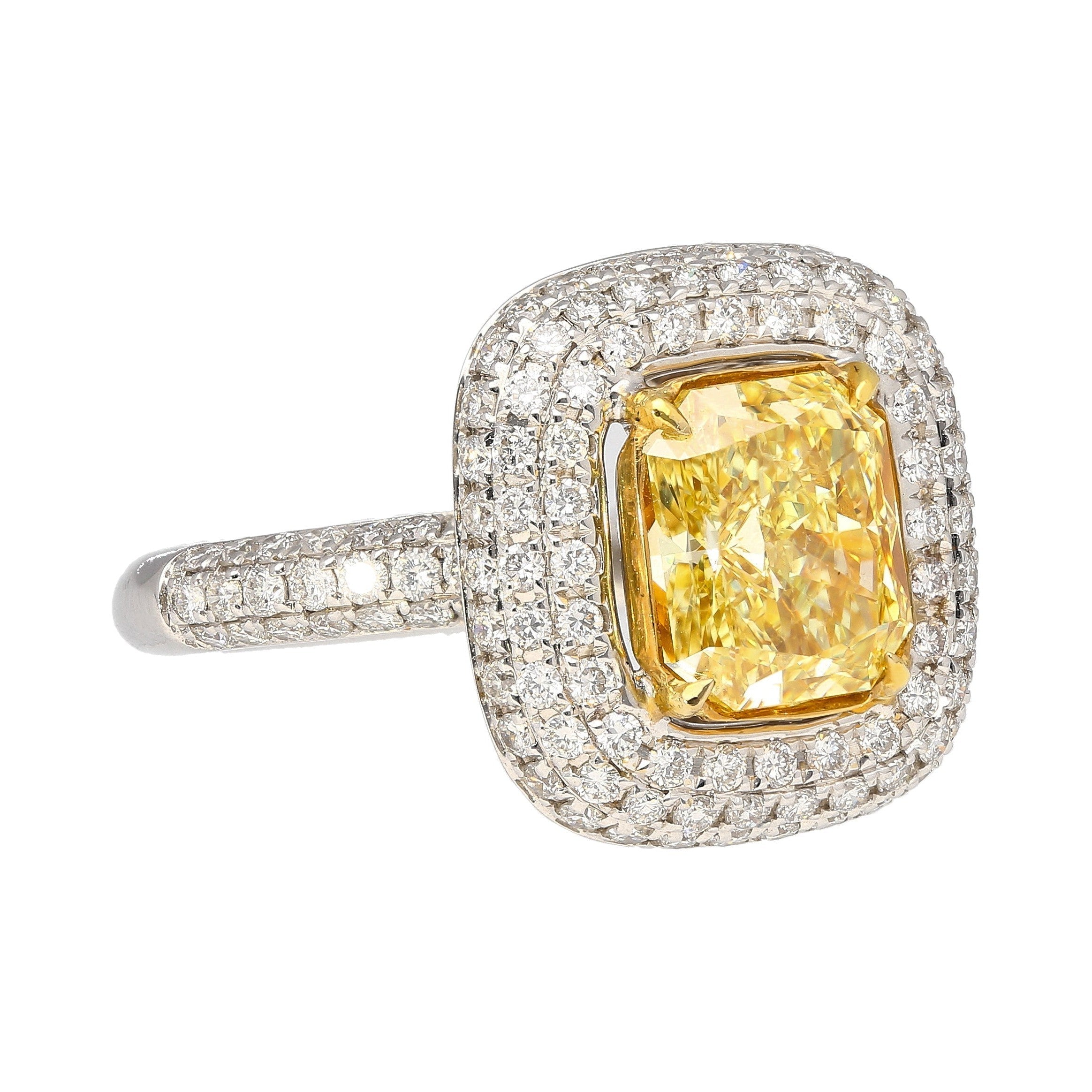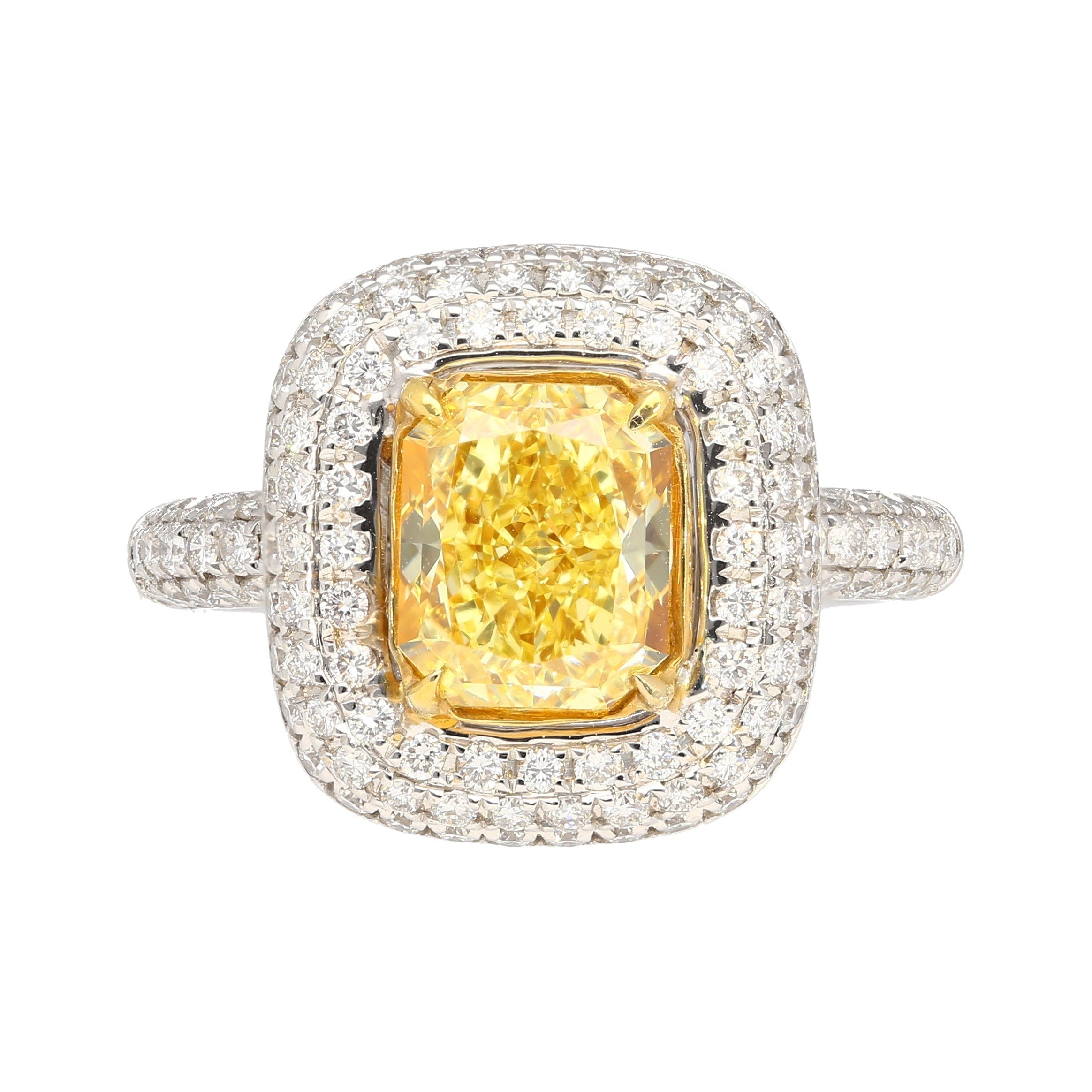 GIA certified 2.35 carat fancy yellow radiant cut diamond engagement ring. Set in 18k white and yellow gold. The ring features a dazzling round cut white diamond encrusted ring shank, yellow gold prongs, and an open back on the culet, allowing for the stones natural color to be on full display.