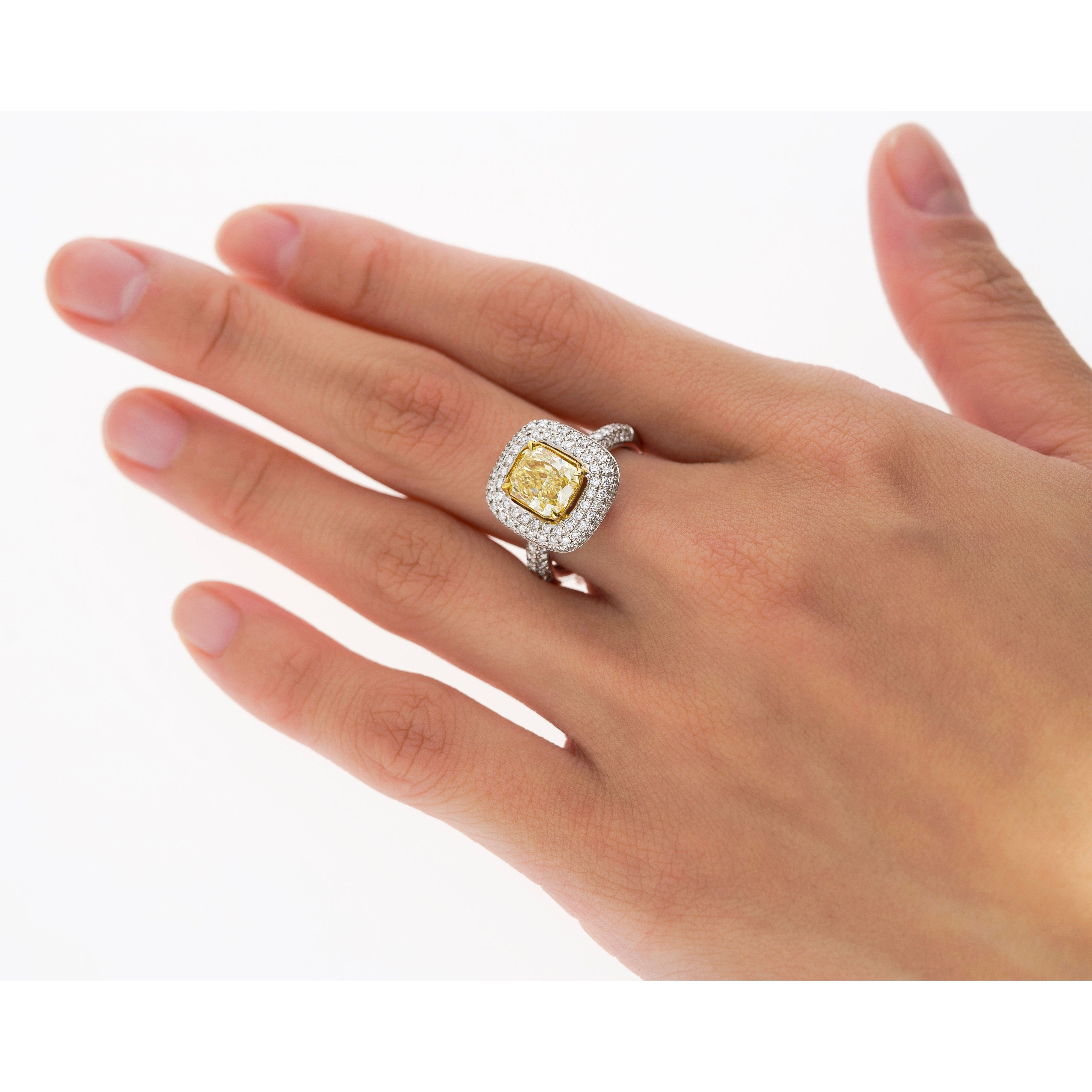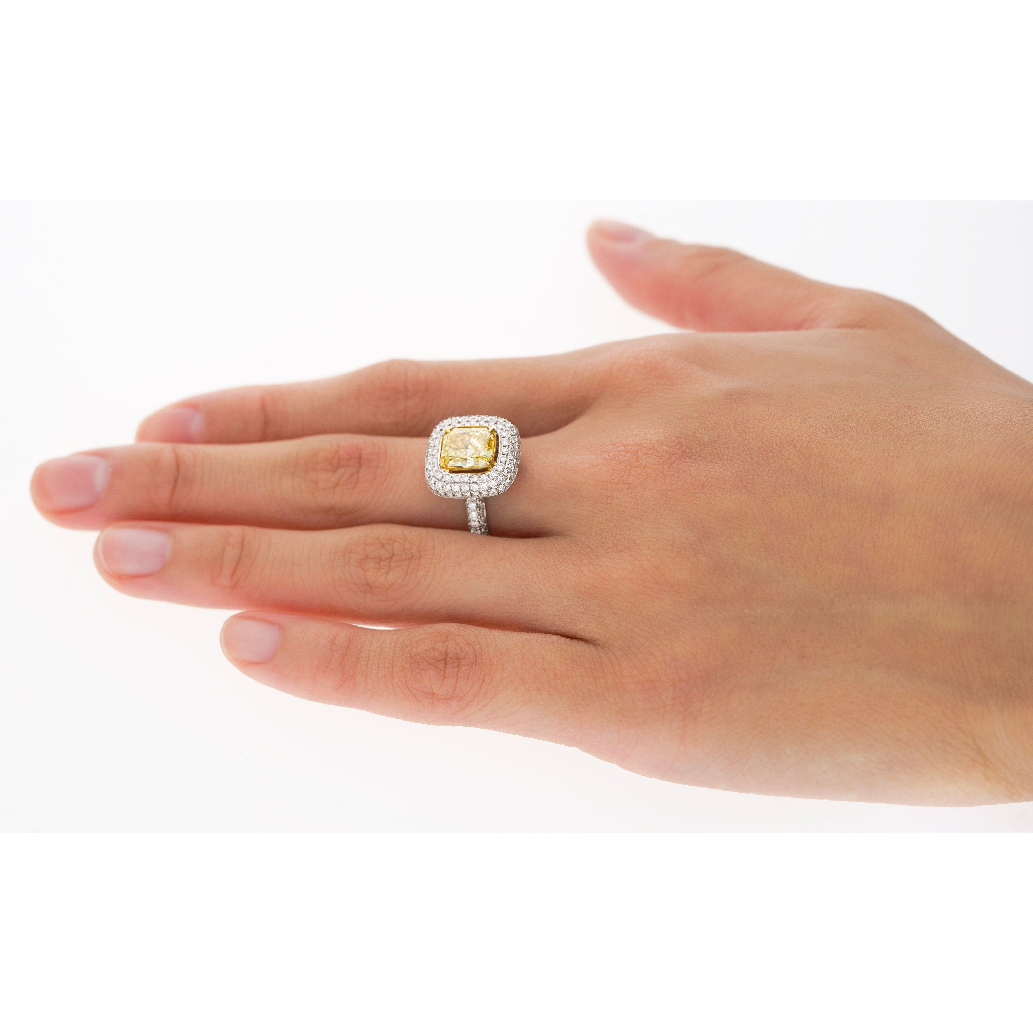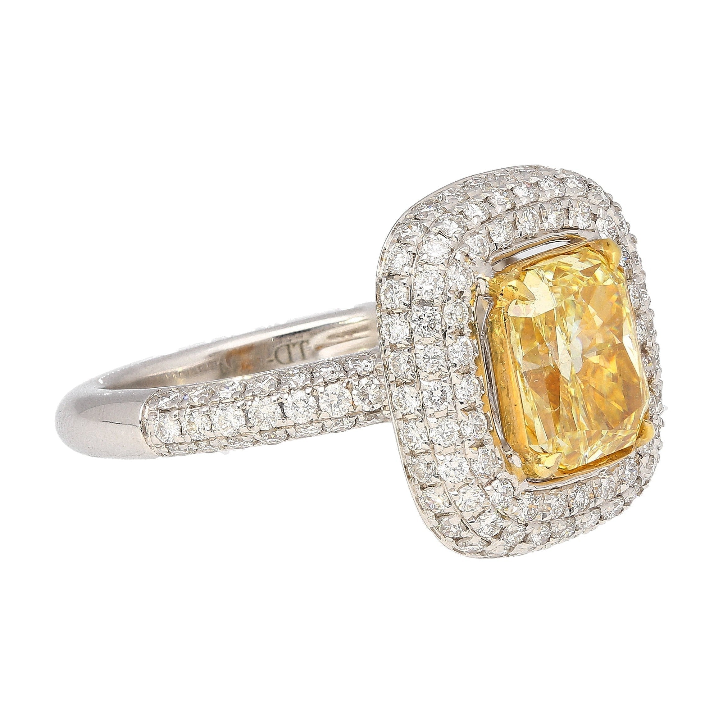 GIA certified 2.35 carat fancy yellow radiant cut diamond engagement ring. Set in 18k white and yellow gold. The ring features a dazzling round cut white diamond encrusted ring shank, yellow gold prongs, and an open back on the culet, allowing for the stones natural color to be on full display.