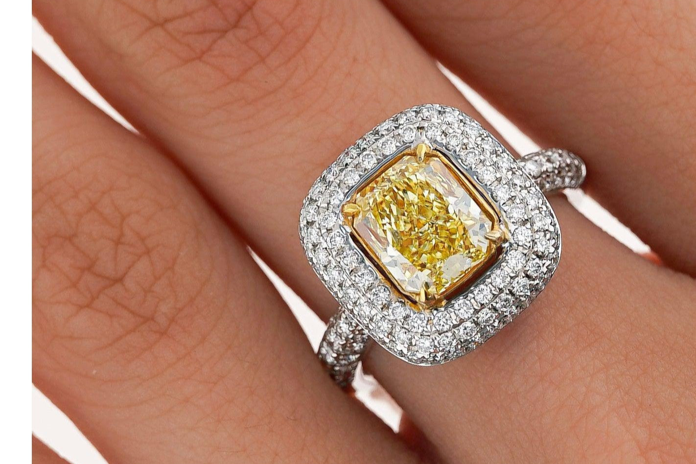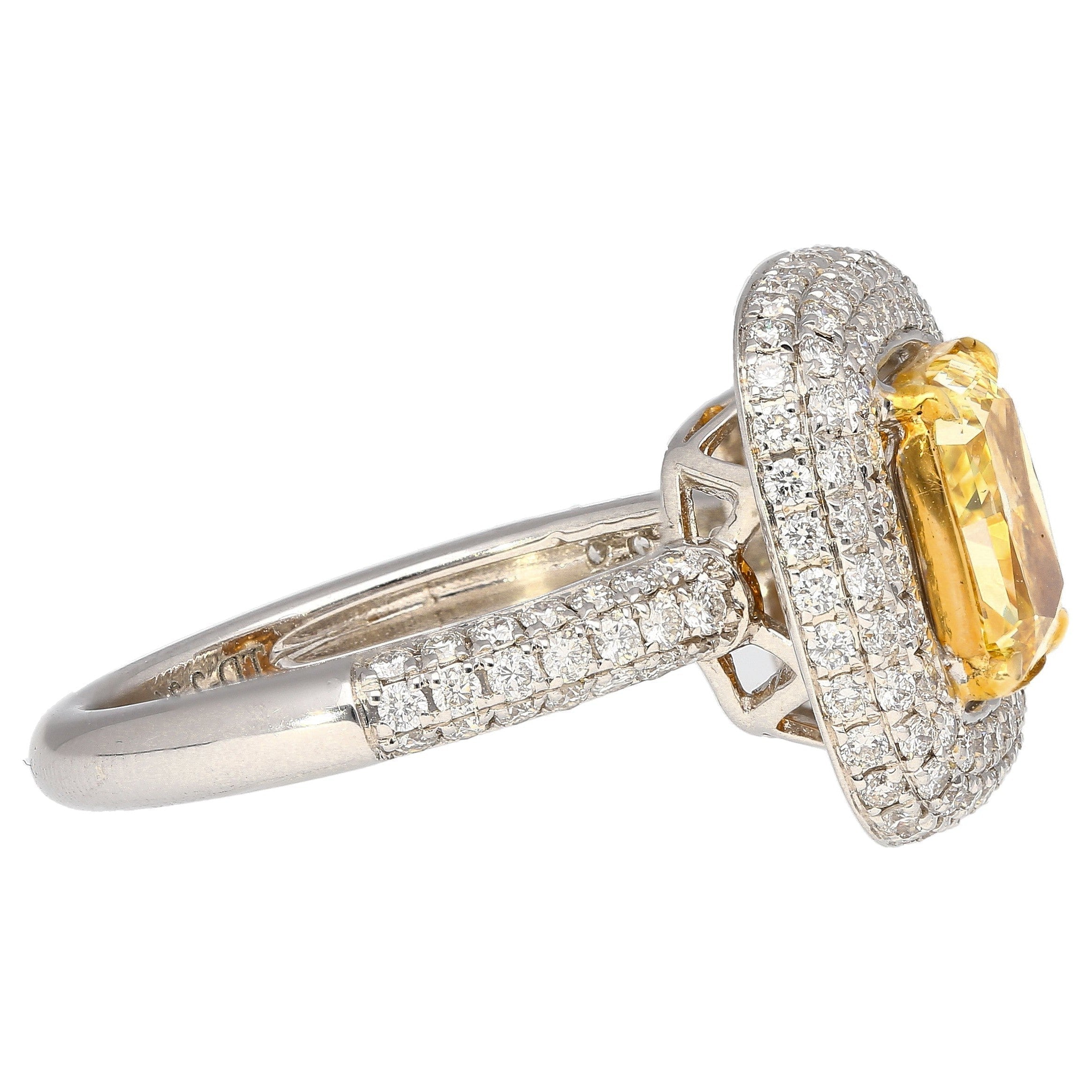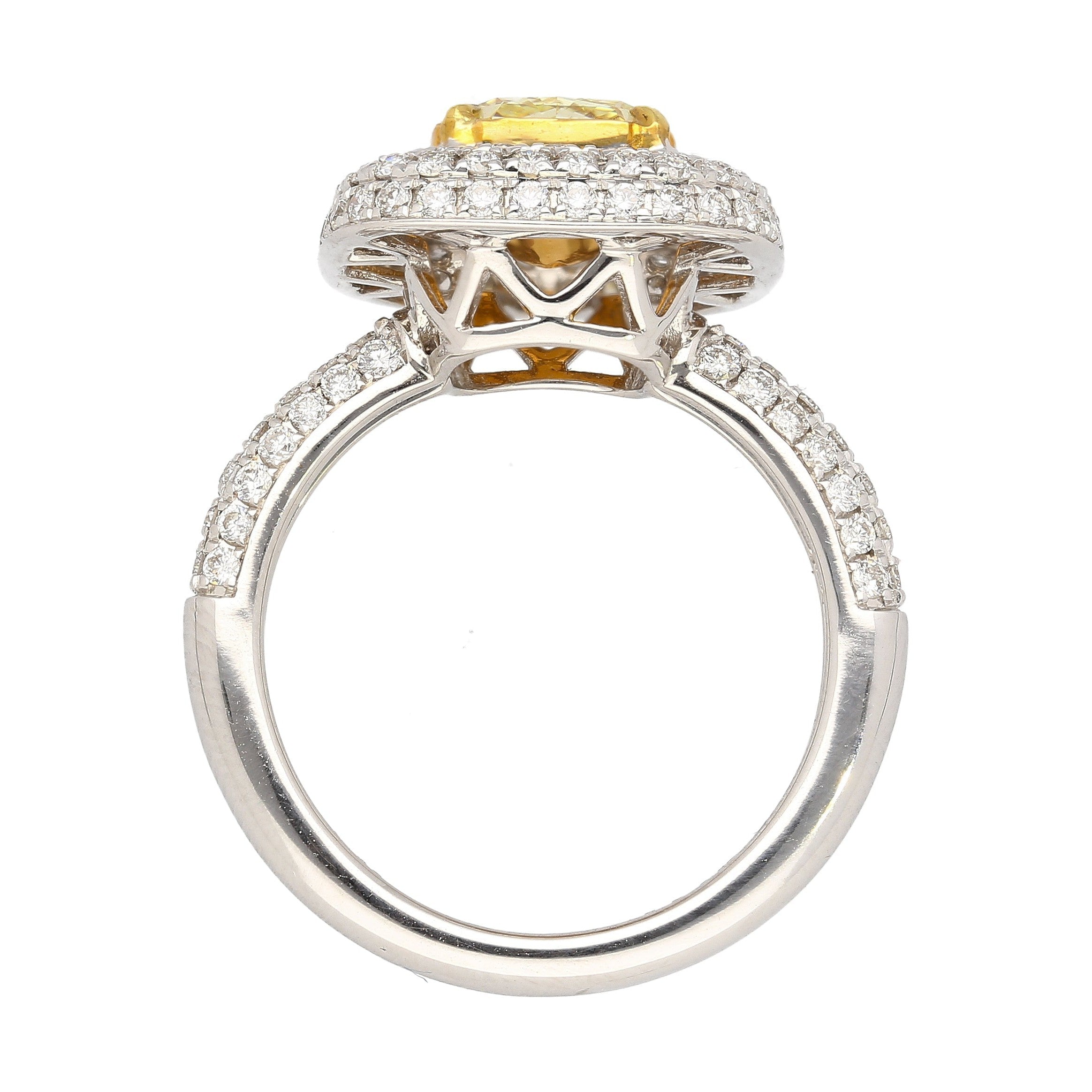 The center diamond is remarkably brilliant, with even distribution and eye-clean clarity. The fancy yellow color origin is 100% natural, untreated, or enhanced in any way. Simply the real thing.