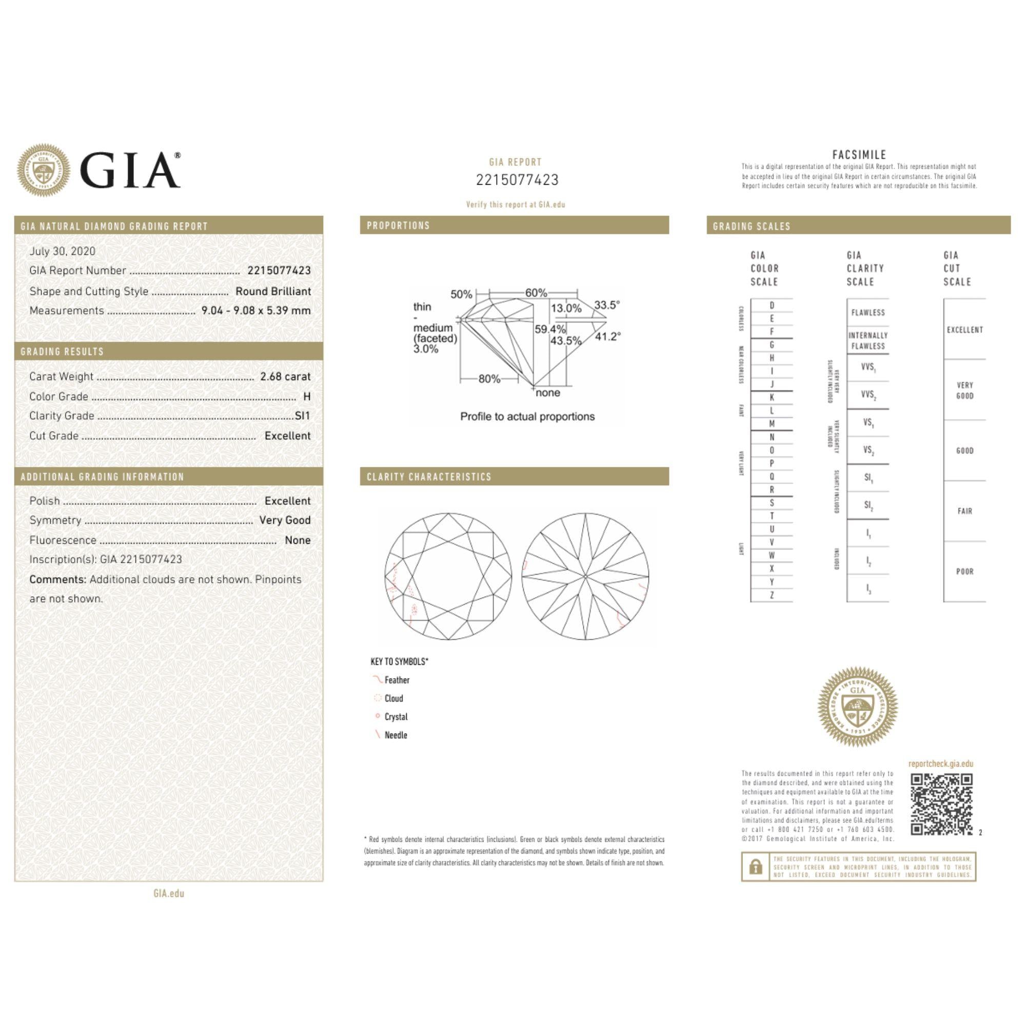 GIA Certified 2.68 carat round brilliant cut natural diamond in H color and SI1 clarity with excellent cut, excellent polish,... Read more