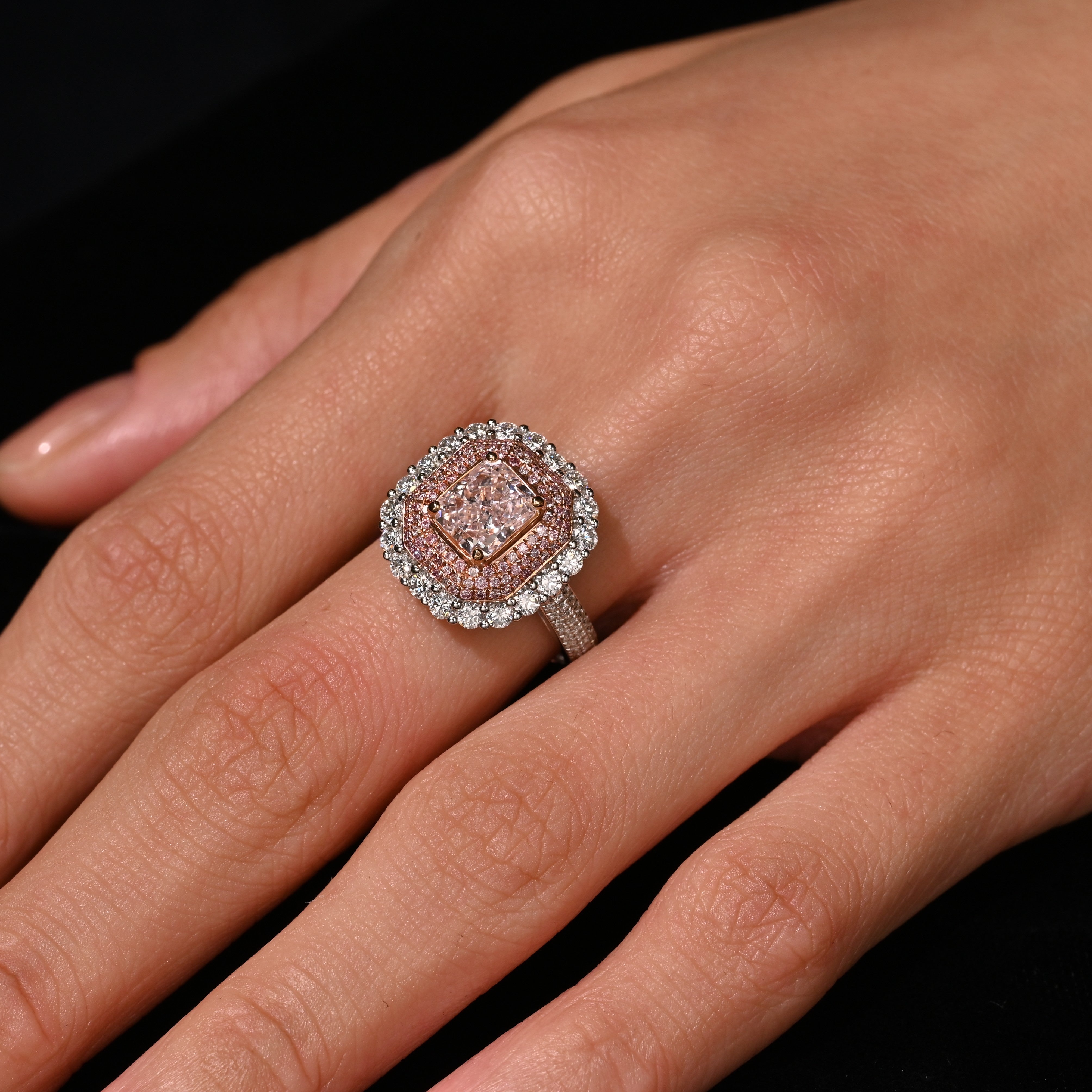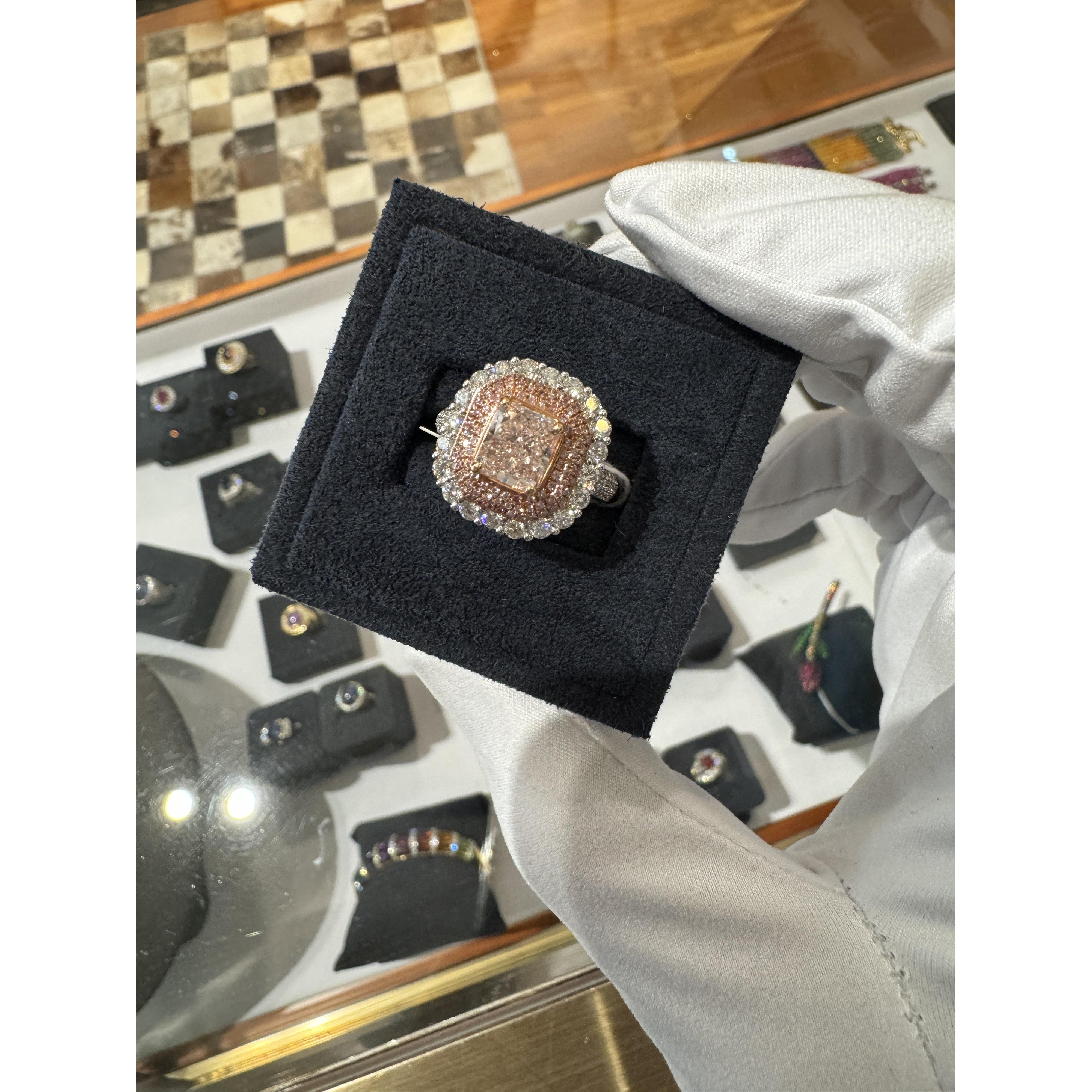 GIA certified radiant cut 1.50 carat fancy light orangey pink diamond center stone adorned with multiples rows of pink and... Read more