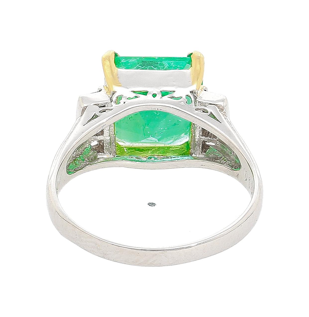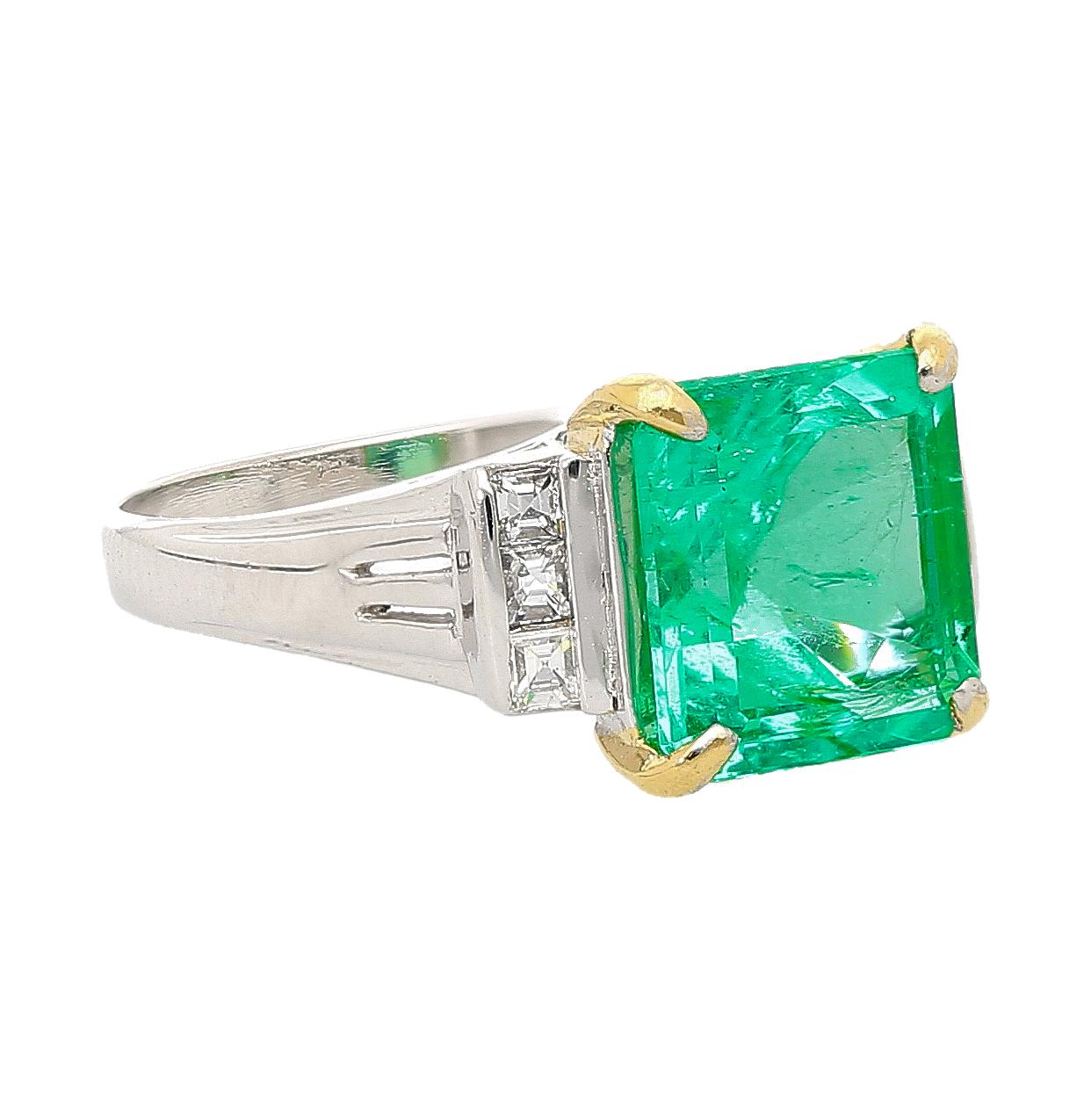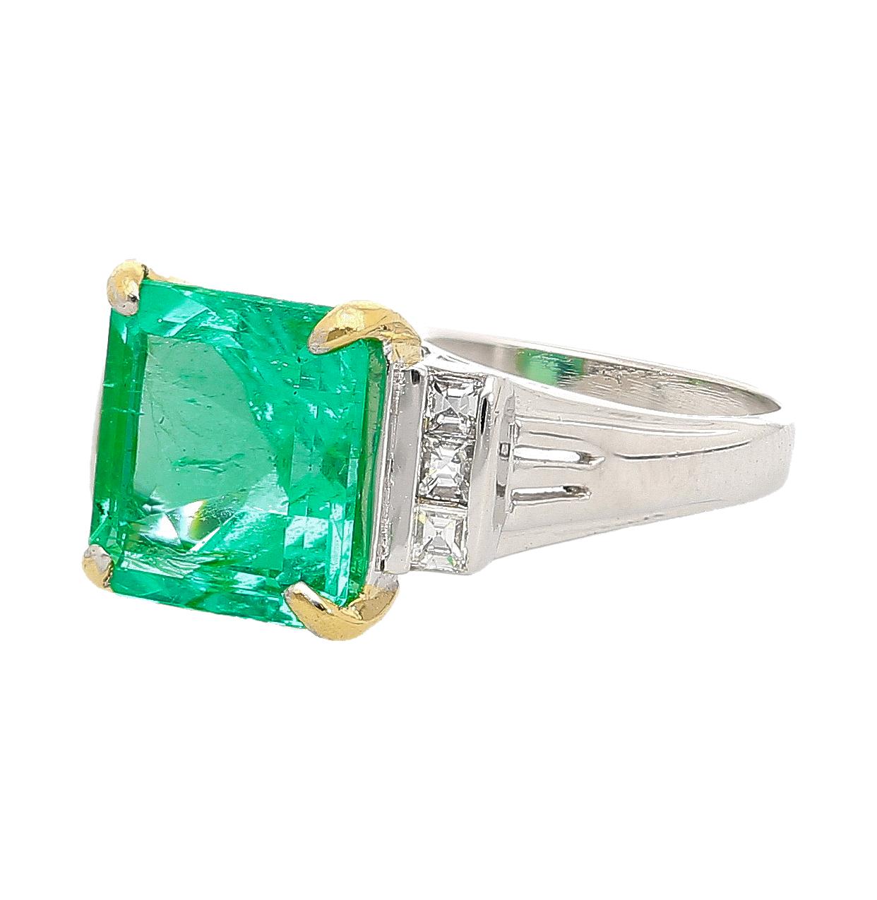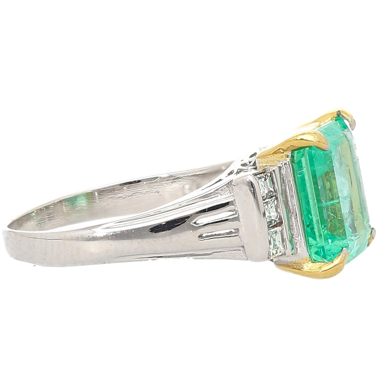 2.91 Carat Square Step Cut Colombian Emerald Princess Cut Diamond Ring Platinum Yellow Gold Prongs Vintage