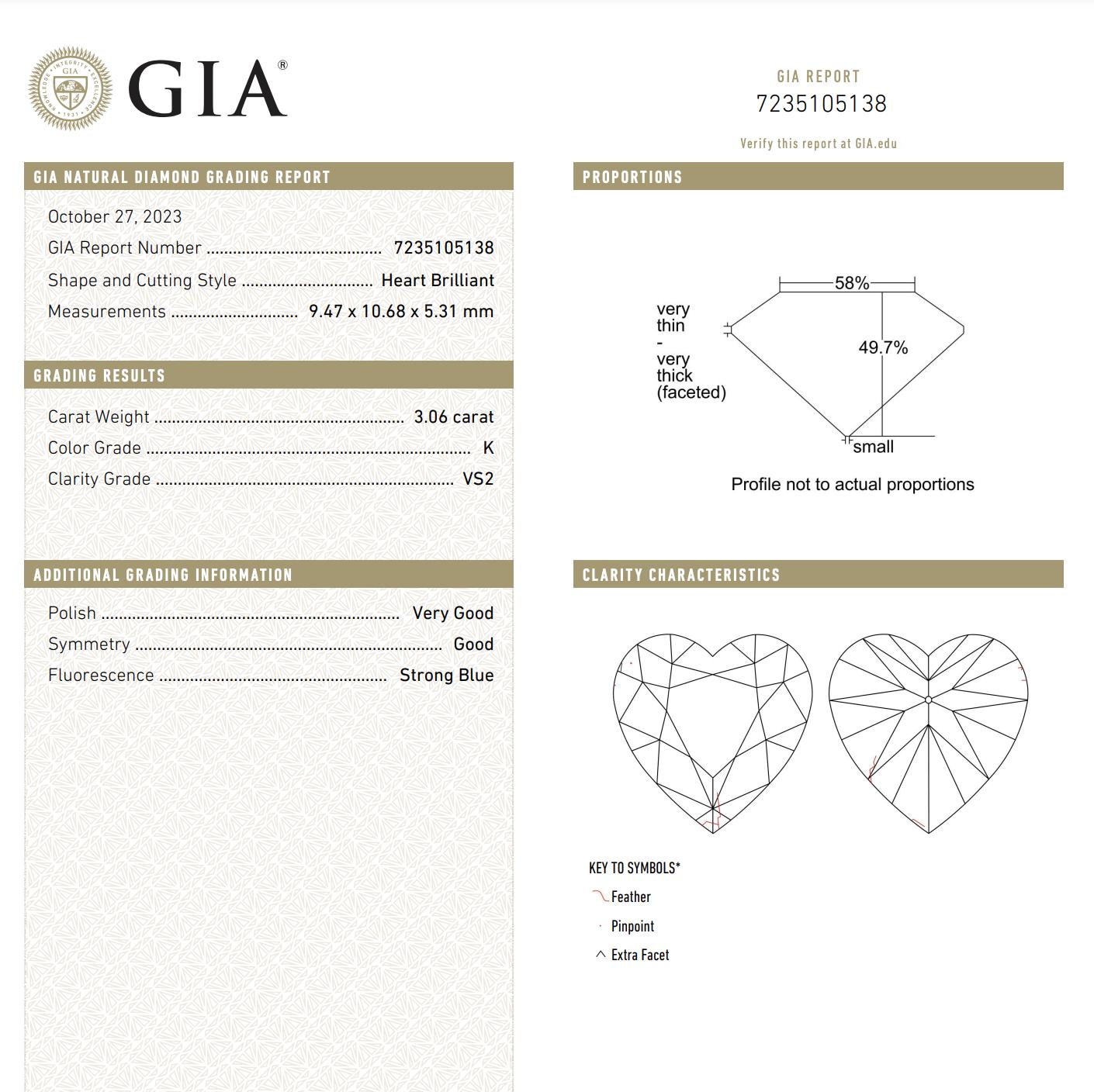 GIA Certified Natural 3.06 Carat Heart Shape K color VS2 Clarity Diamond Solitaire Engagement Ring. Set in platinum with a... Read more