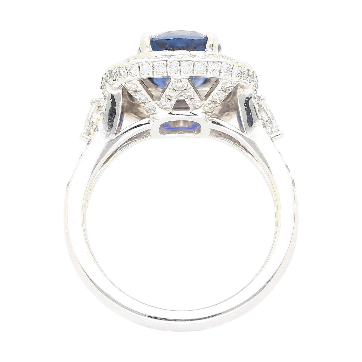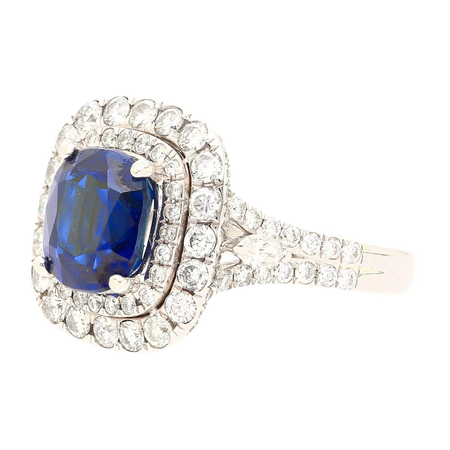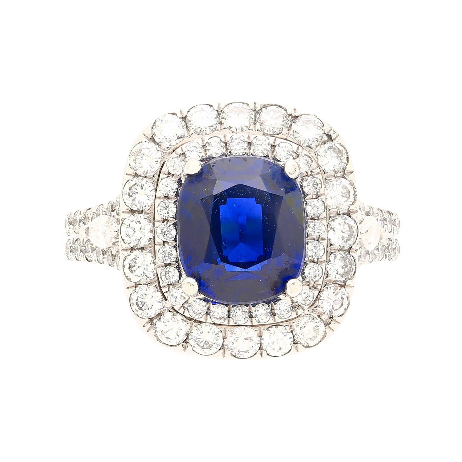 GIA certified 3.12 carat natural blue sapphire ring with no heat treatment. 18K white gold ring set with a cushion cut sapphire, double diamond halo, and split shank design.