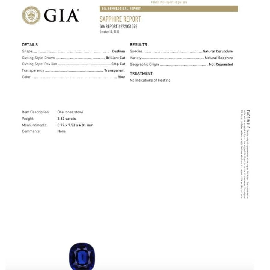 Accompanied by GIA report no. 6272051598 stating the sapphire is natural, blue in color, cushion cut, no heat treatment, with recorded measurements and carat weight.