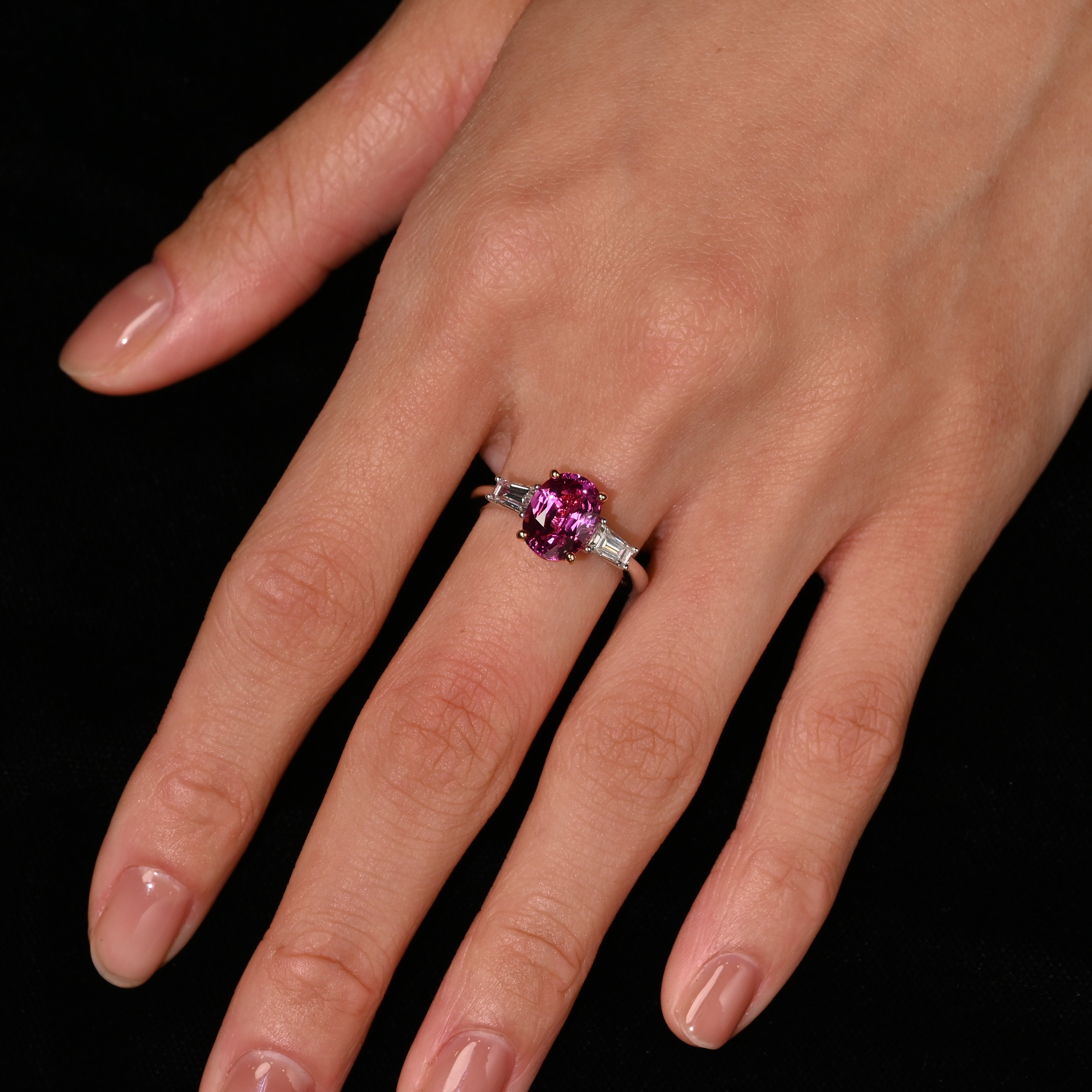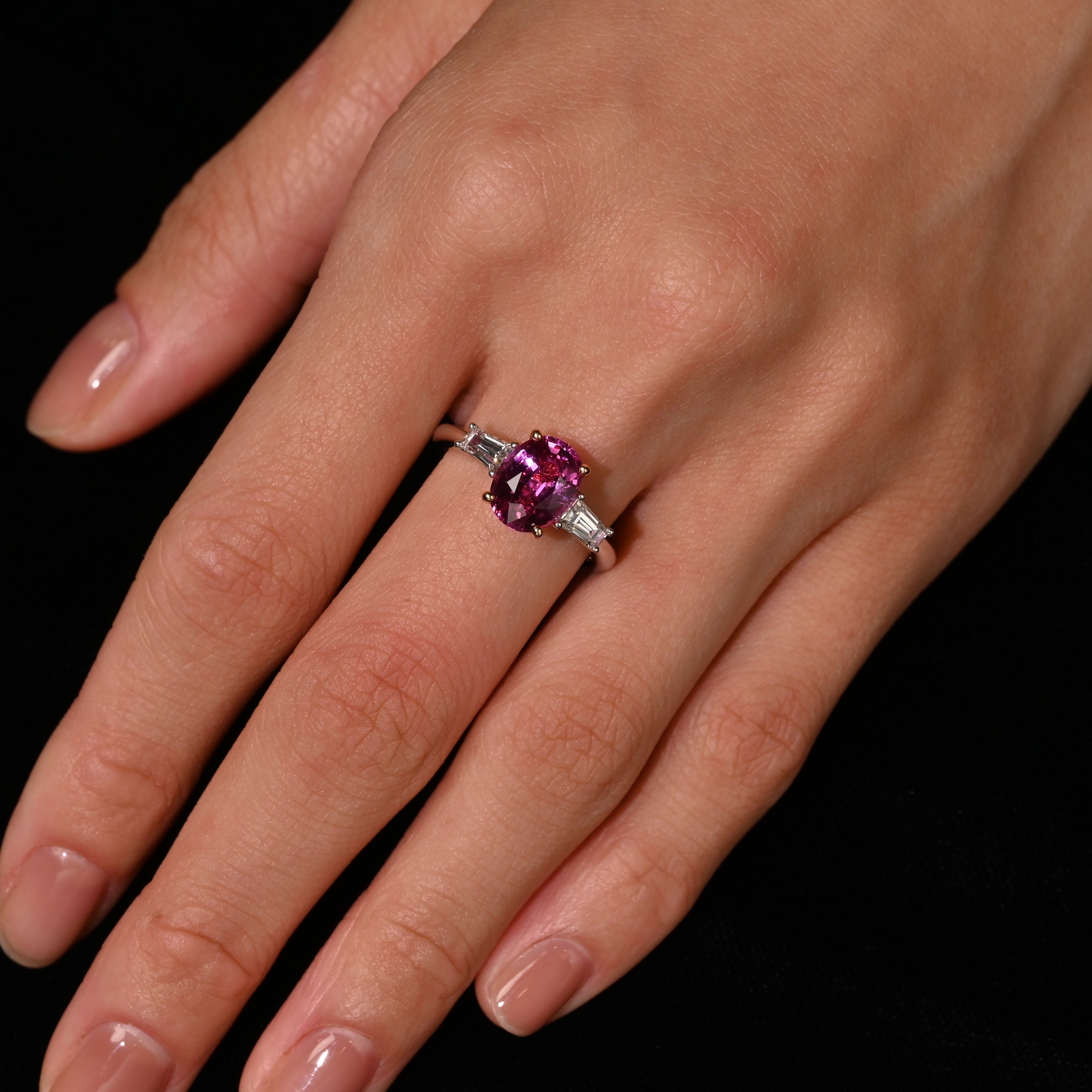 This 18K White Gold ring features a GIA Certified 3.2-carat oval cut pink sapphire of Madgascar origin. This vibrant gemstone... Read more