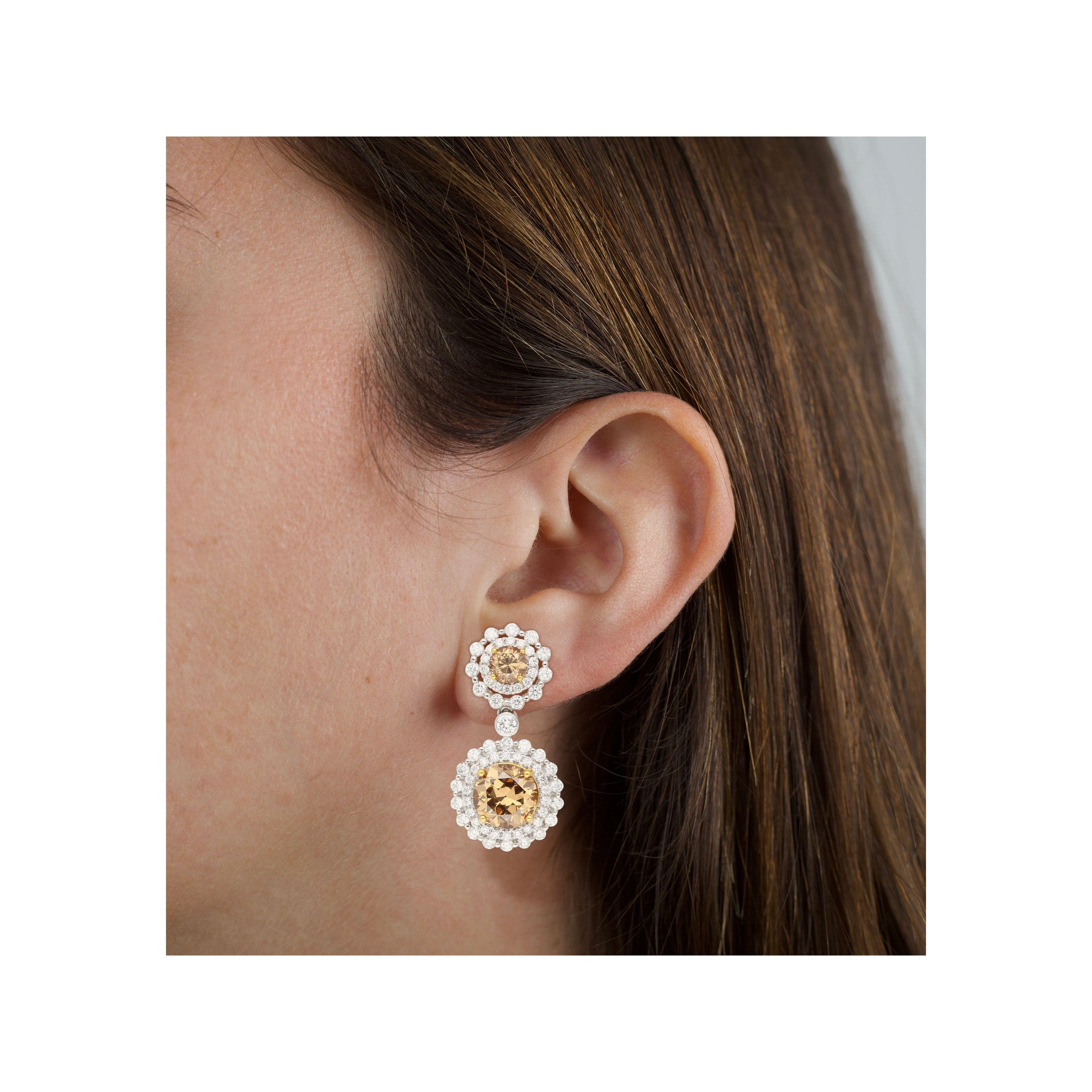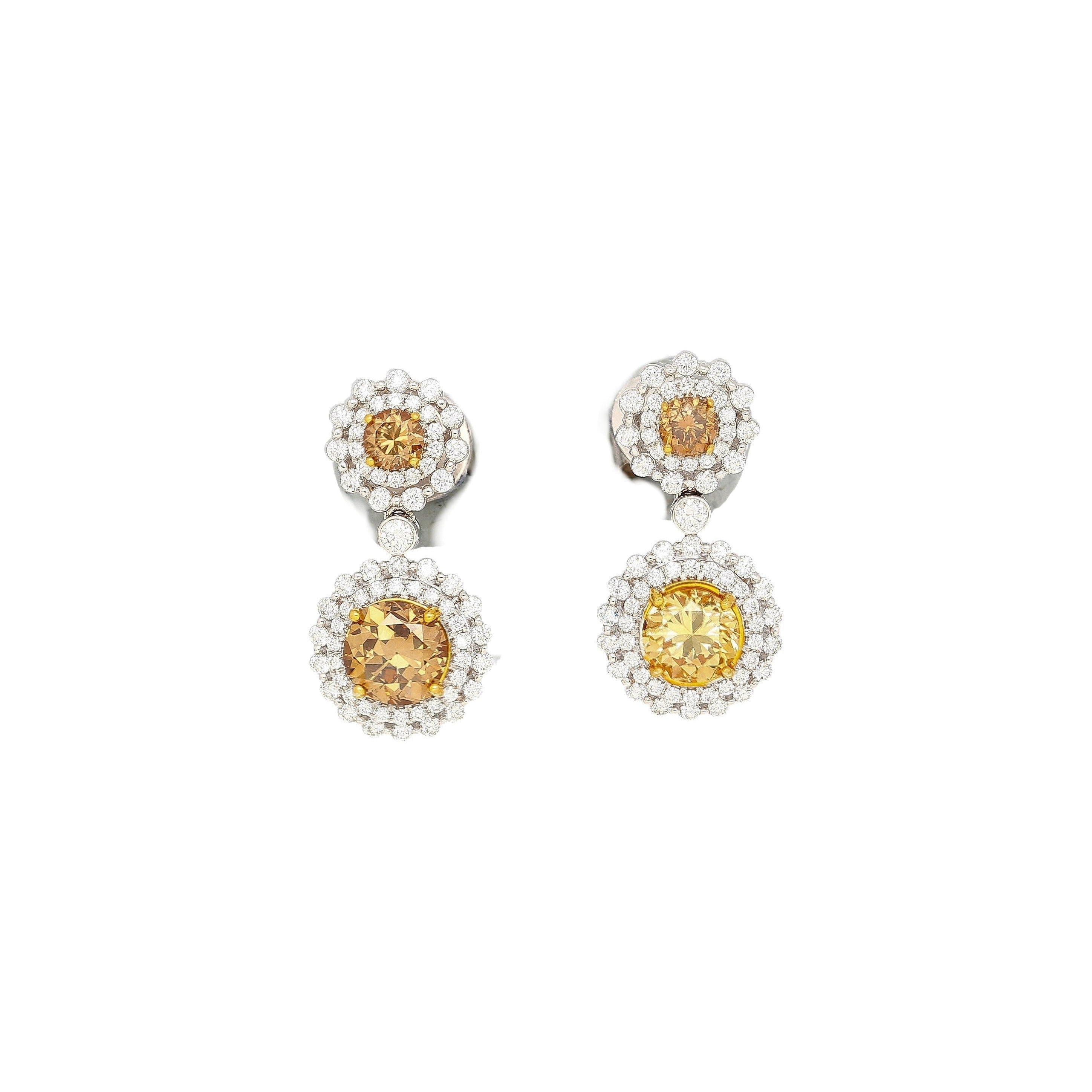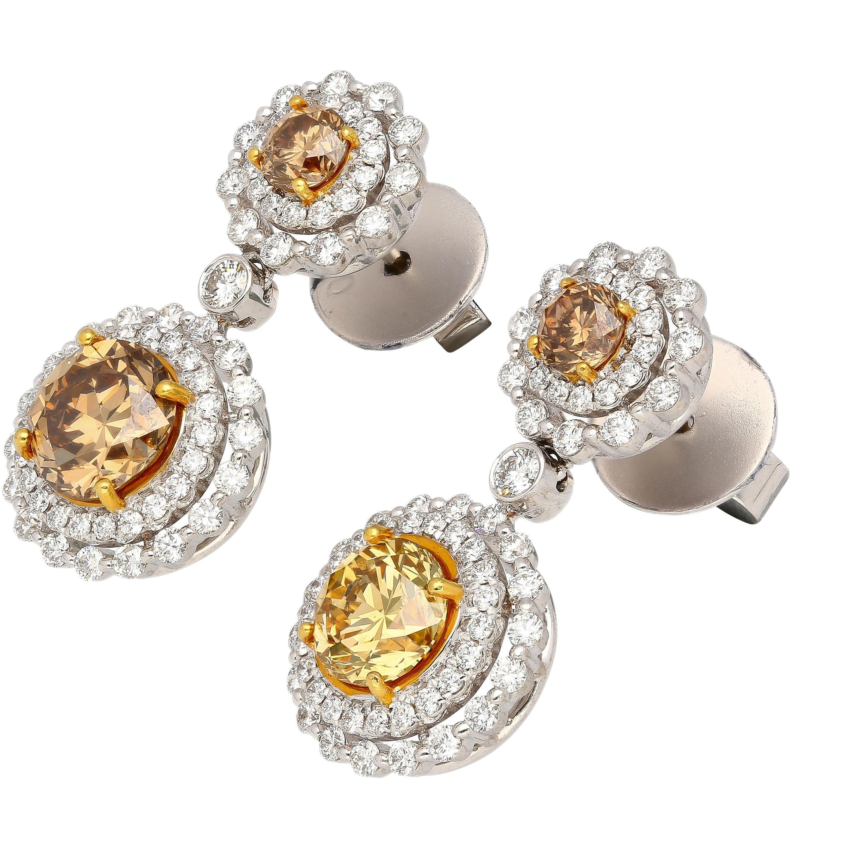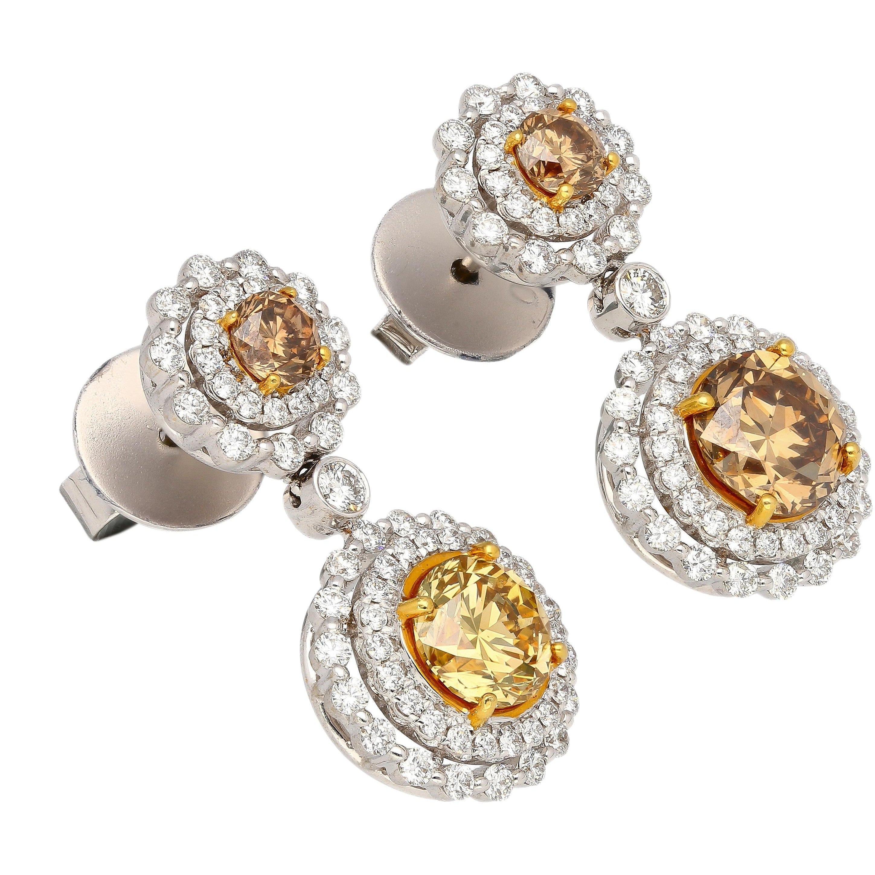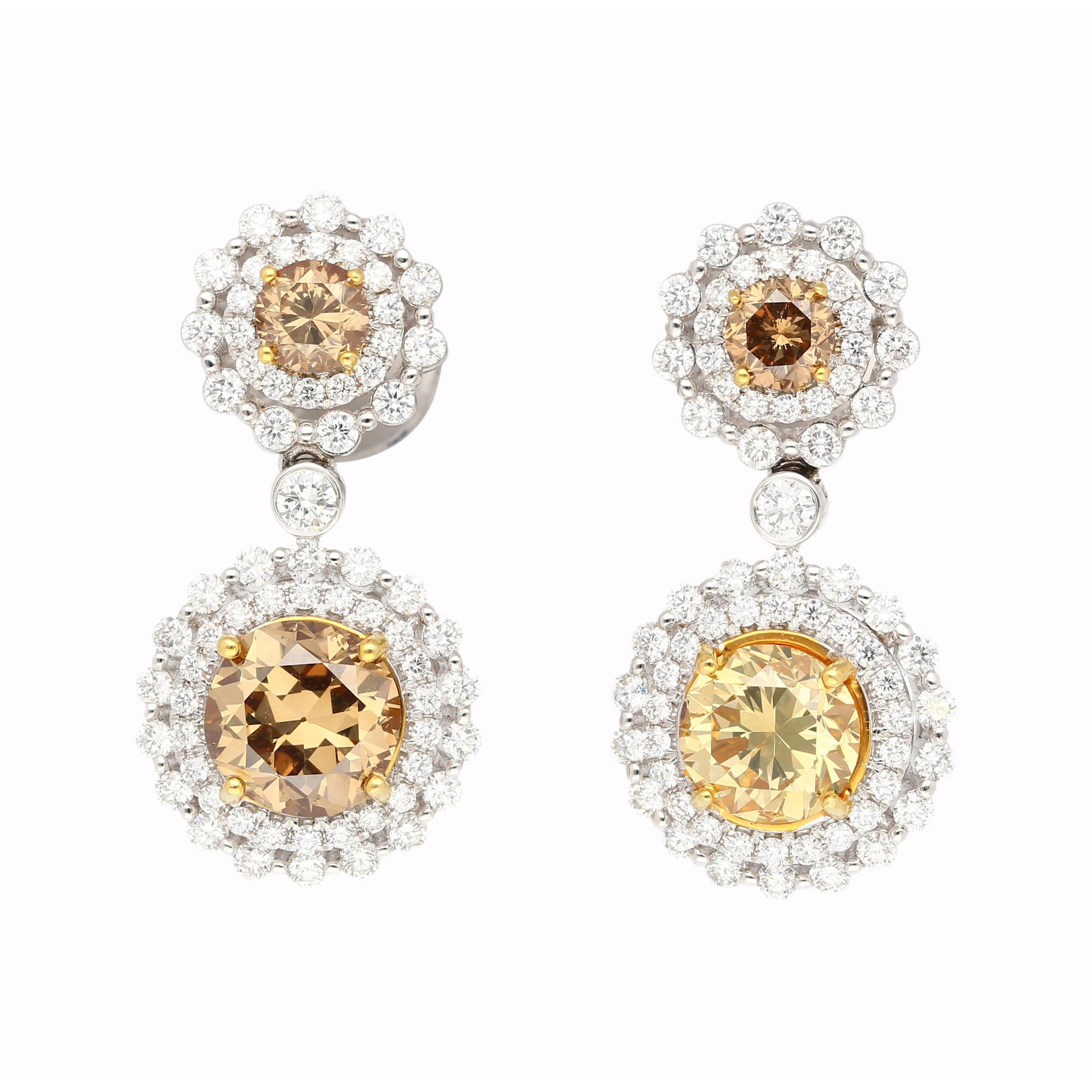 GIA Certified 3.96 carat total round cut fancy brown to yellow diamond drop earrings. Adorned with 132 round cut white diamond halo and bezel set, 1.09cttw. Above the main gemstones are 2 smaller fancy brown diamonds, 0.54 cttw. The main gemstones is prong set. Crafted in 18k white gold. Weights 7.52 grams total. A luxurious piece that stands out from the bunch due to its distinguished color. Mounted in a well-contrasted two tone white and yellow gold setting.