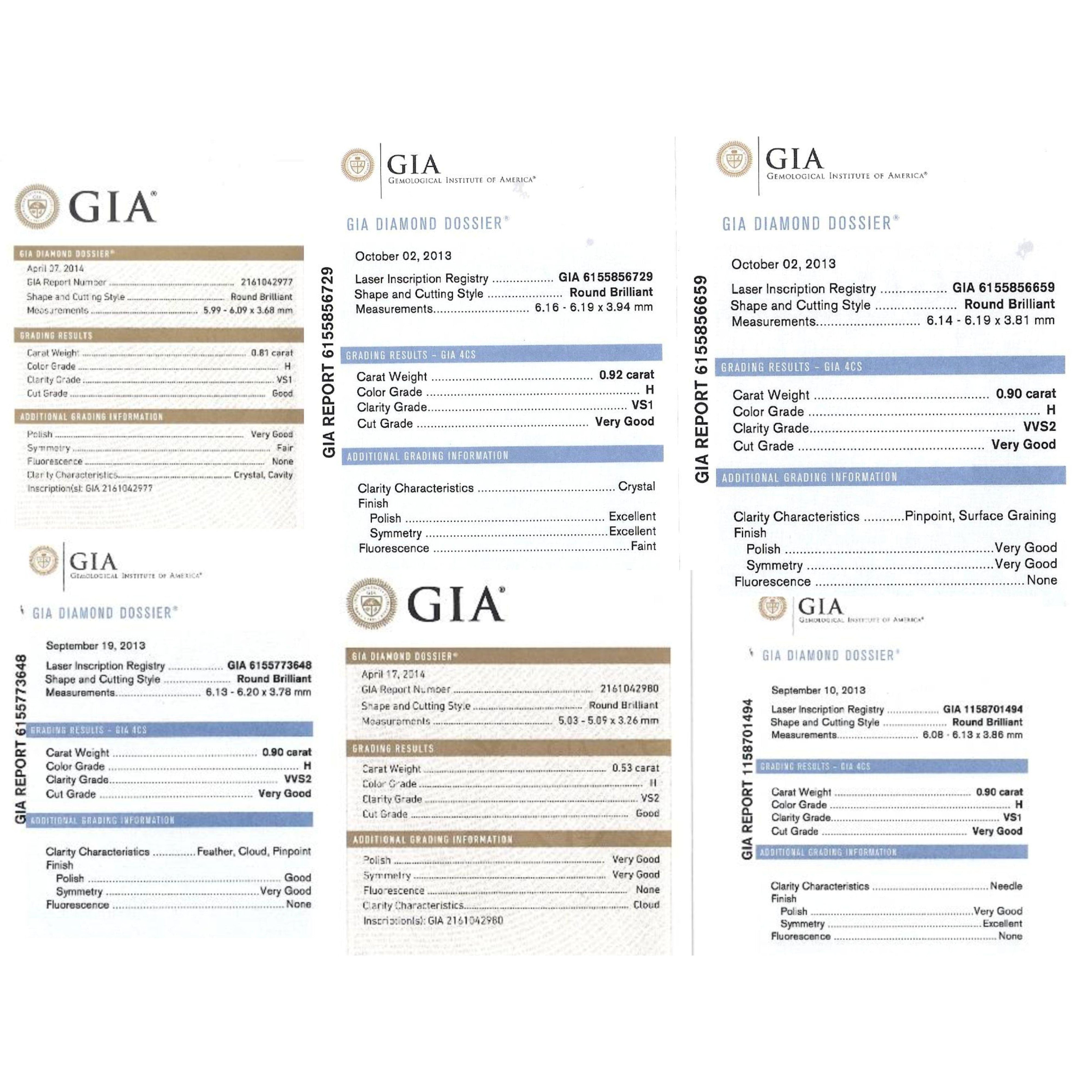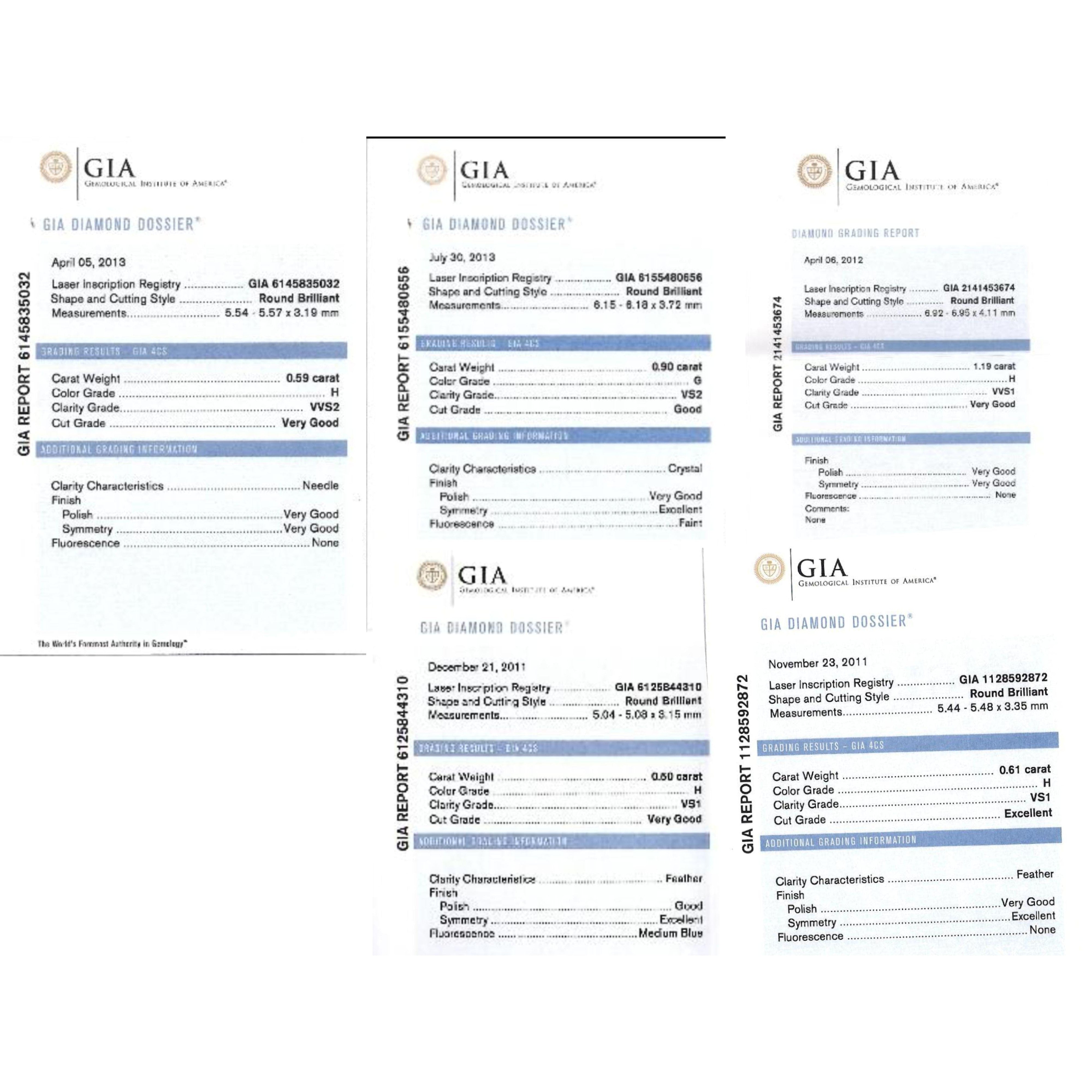 Accompanied by thirteen individual GIA reports confirming the diamonds are natural, round brilliant cut, with stated carat weights, color range, and clarity grades.