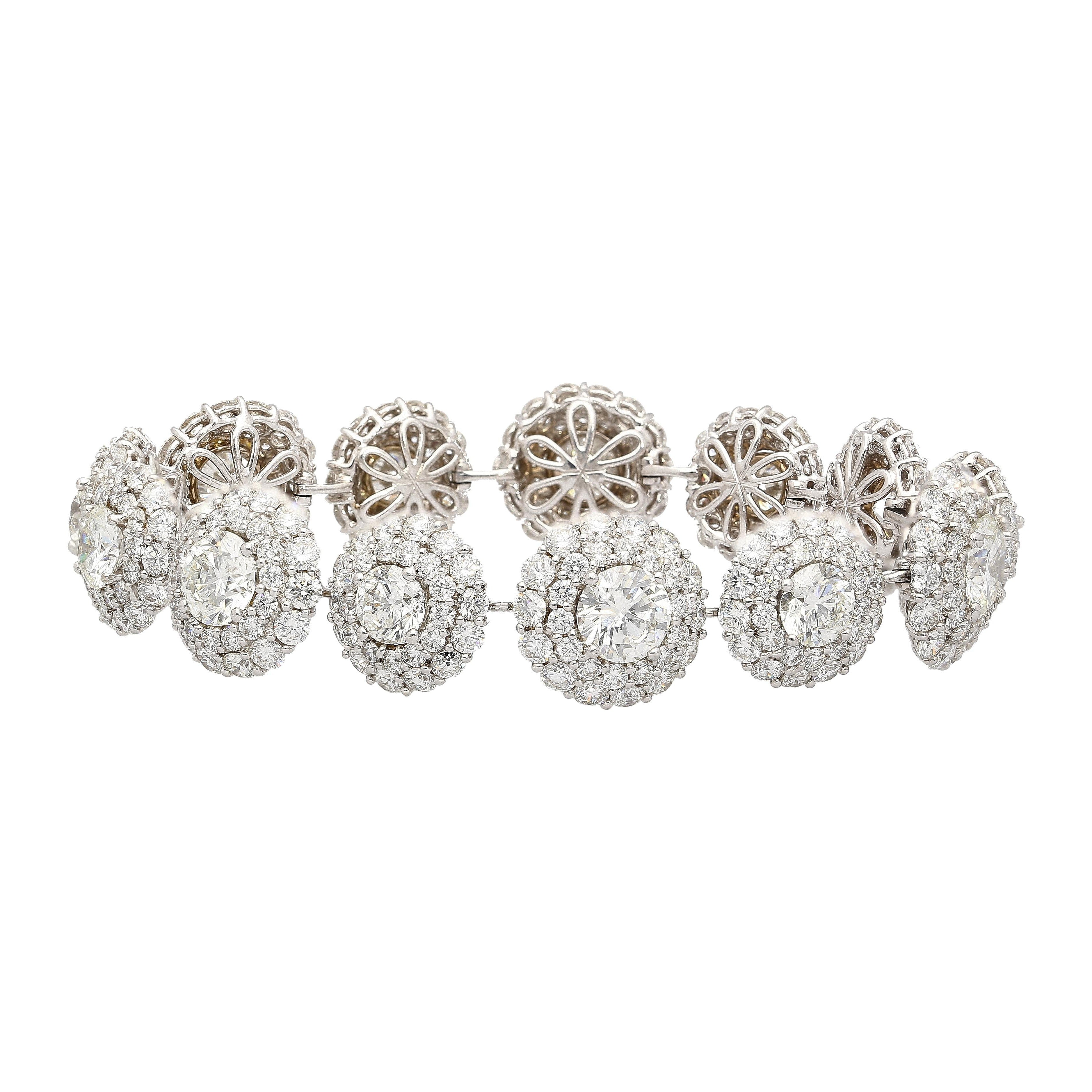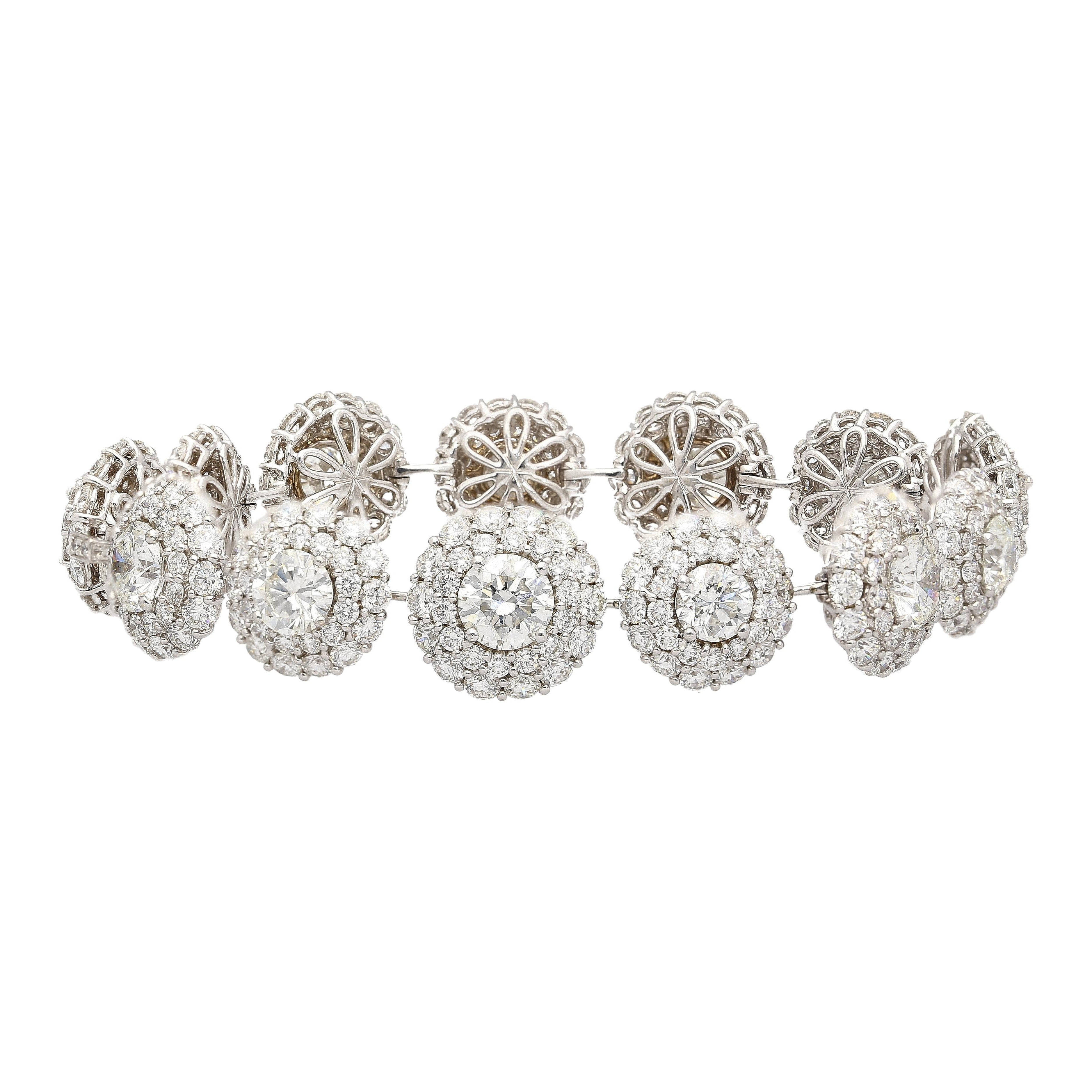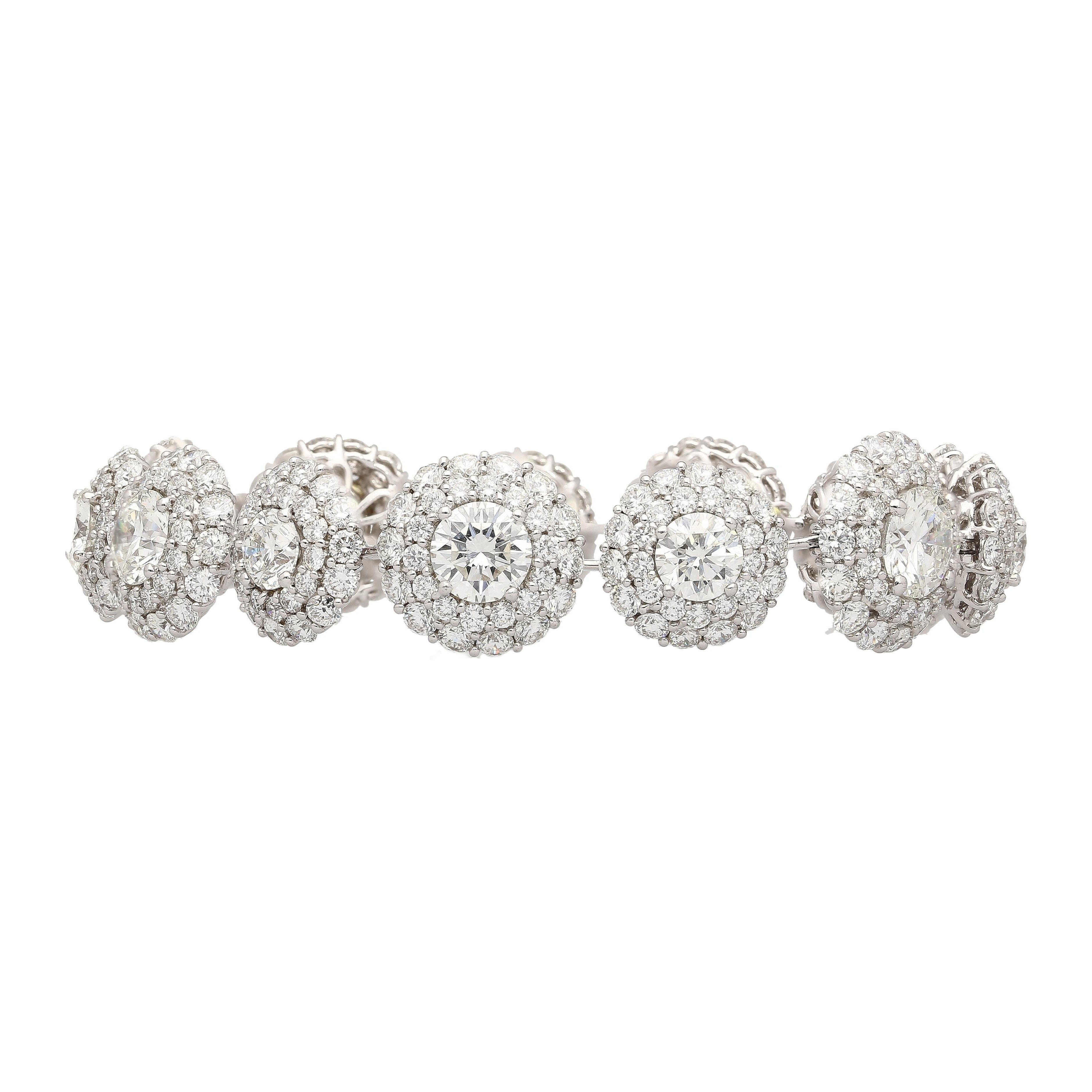GIA certified natural diamond circle link bracelet set in 18K white gold. Diamond halo bracelet composed of individually certified round brilliant diamonds with pavé diamond accents.