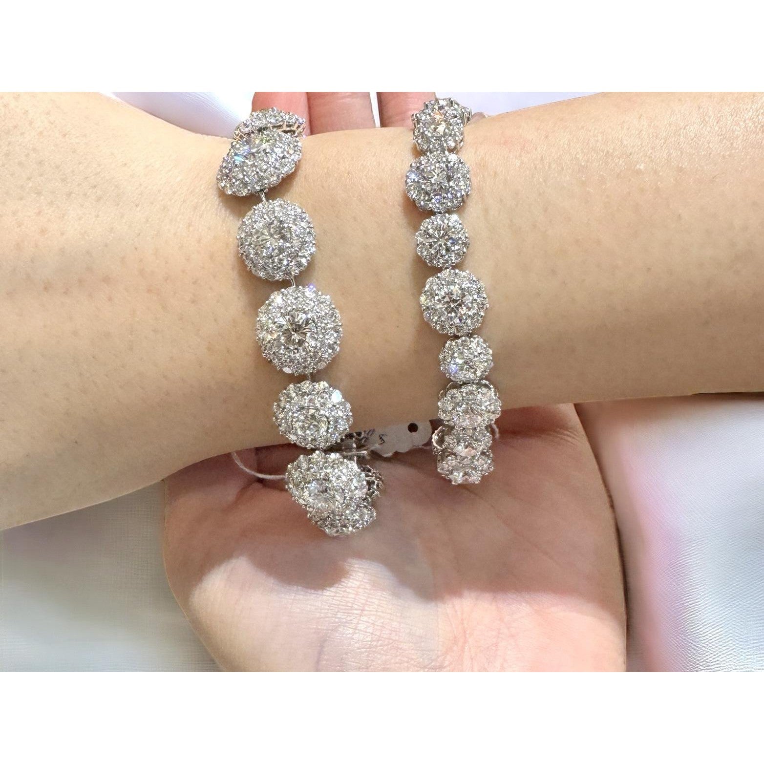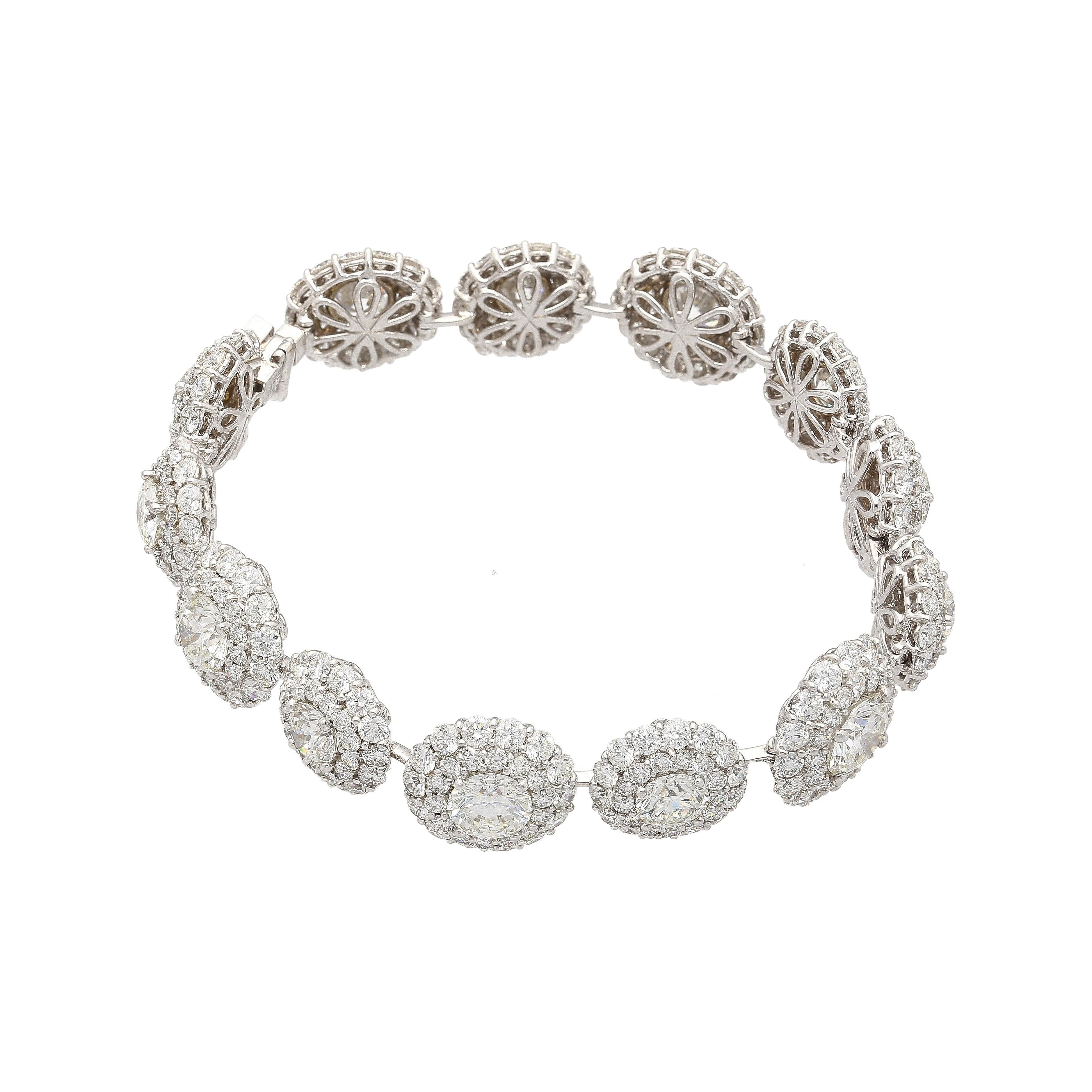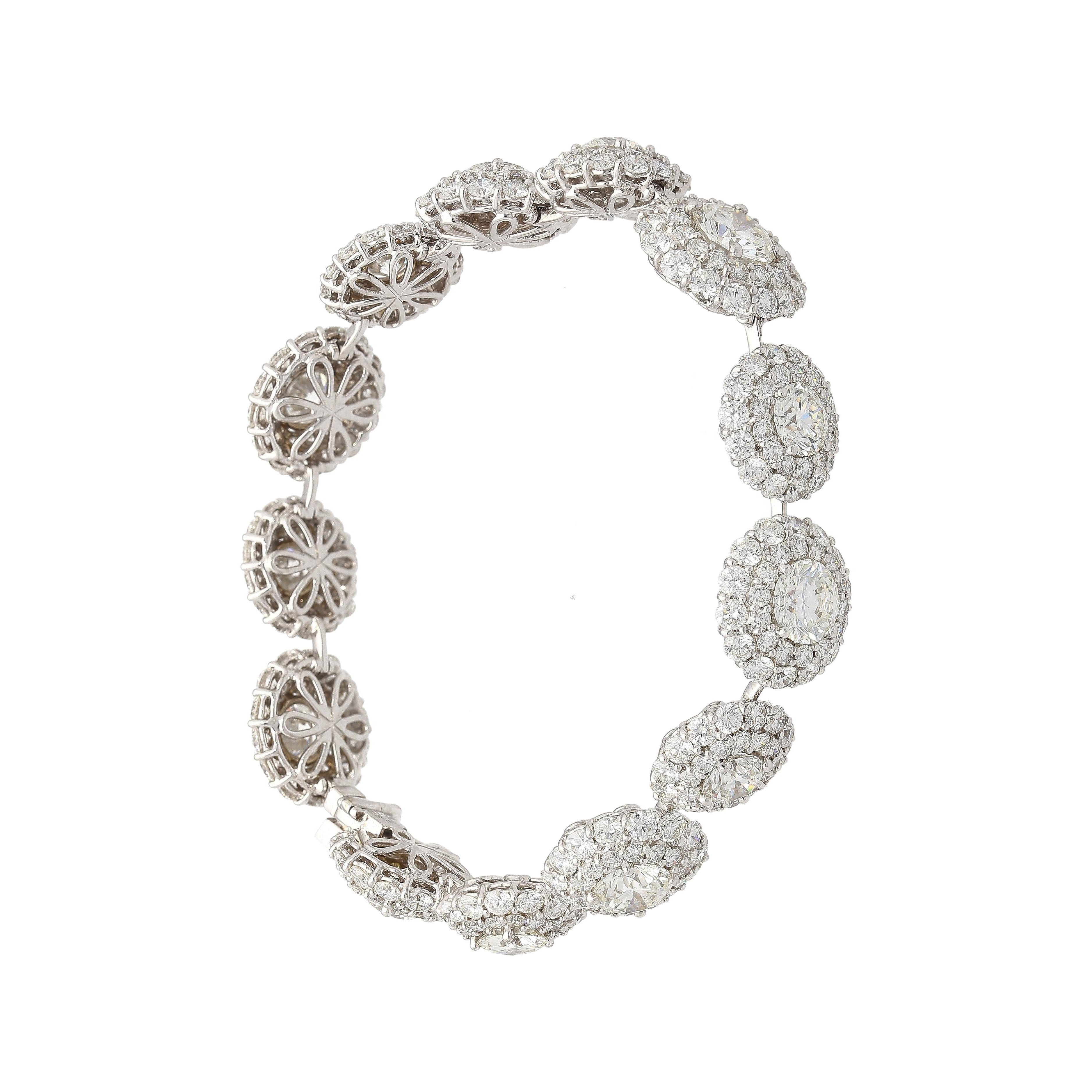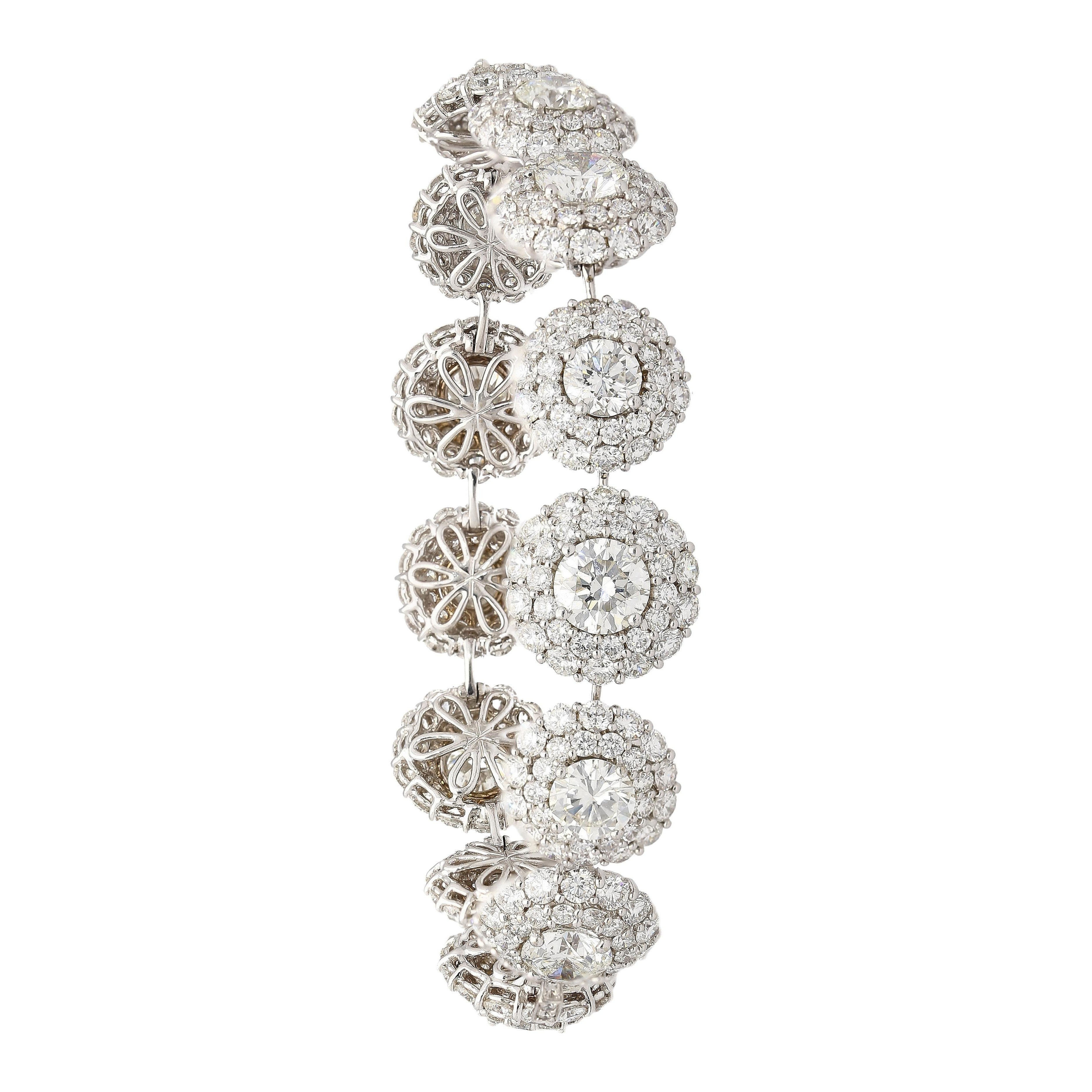 GIA certified natural diamond circle link bracelet set in 18K white gold. Diamond halo bracelet composed of individually certified round brilliant diamonds with pavé diamond accents.