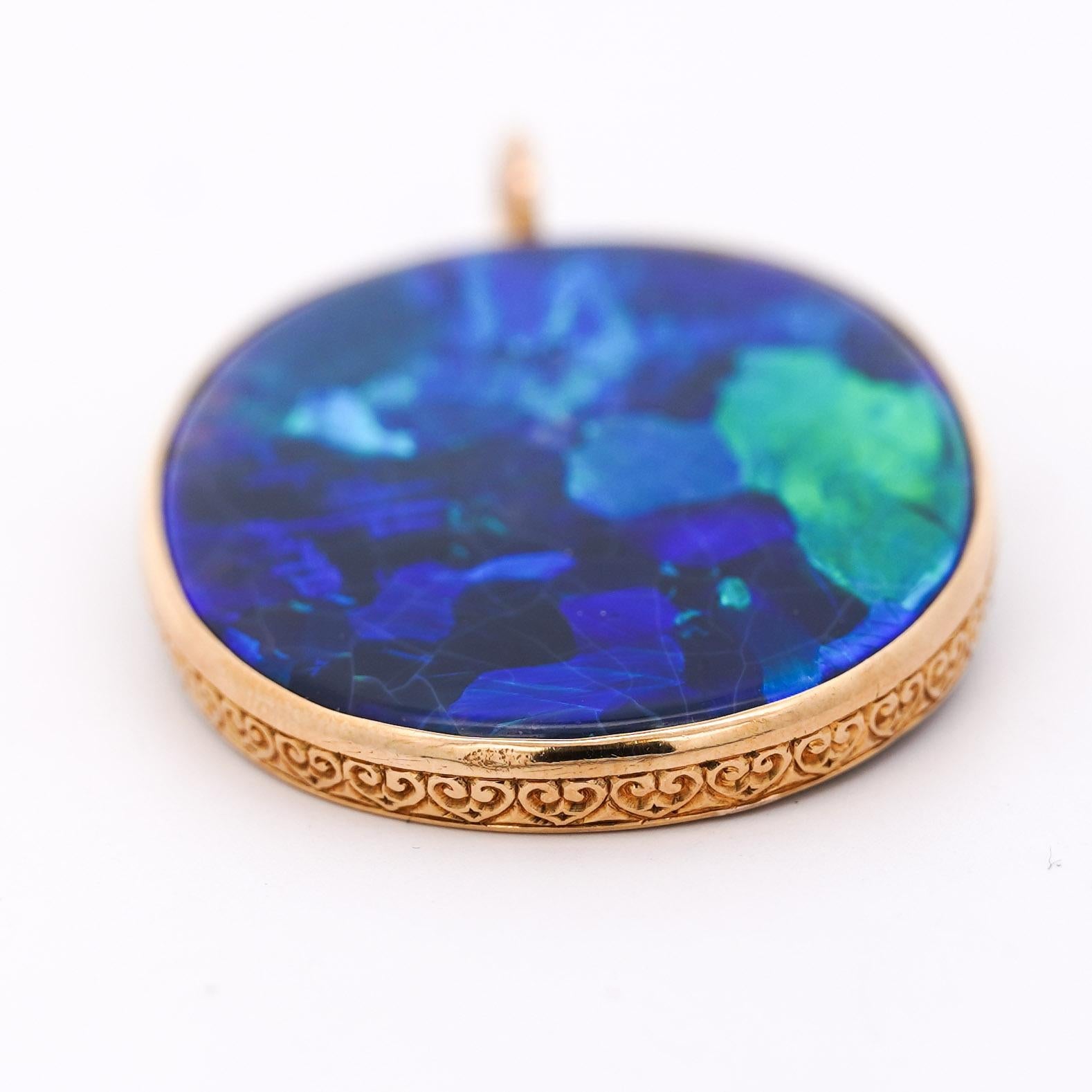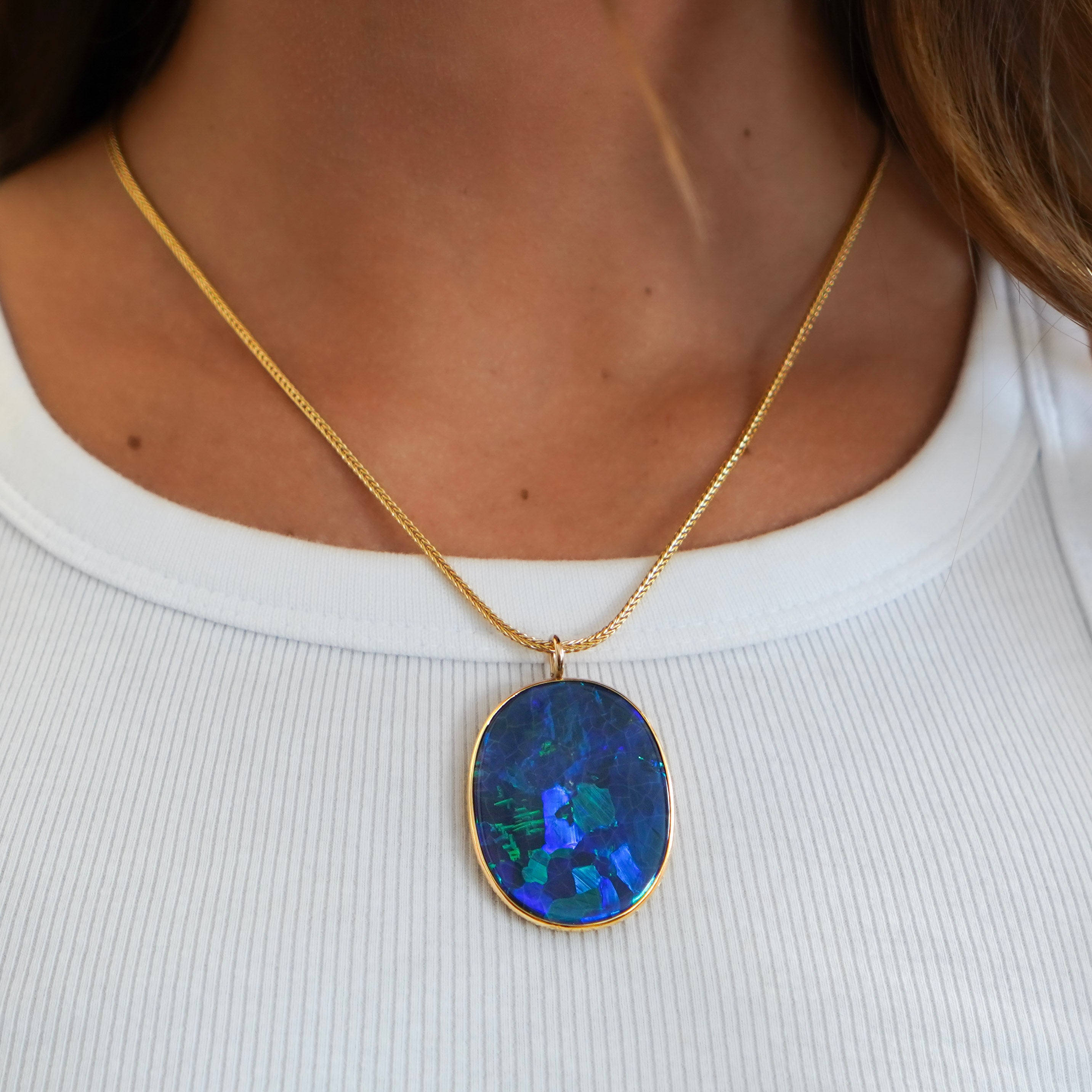 This pendant is an exceptional piece of jewelry that beautifully showcases the natural brilliance of Australian Black Opals. The deep black base of the opals, paired with their mesmerizing play of color, creates a captivating effect that changes with the light. The flashes of blue and green within the stones highlight their unique qualities, making this pendant truly one-of-a-kind. The double-cabochon cut maximizes the visual impact of the opals, allowing their natural beauty to be fully displayed. Set in luxurious 18K yellow gold, the pendant provides a durable and elegant setting that perfectly complements the opals. Signed by the renowned "Marcus & Co" and GIA certified, this pendant guarantee authenticity and high-quality craftsmanship. A rare treasure, this piece is perfect for collectors or anyone seeking an exclusive, luxurious addition to their jewelry collection.