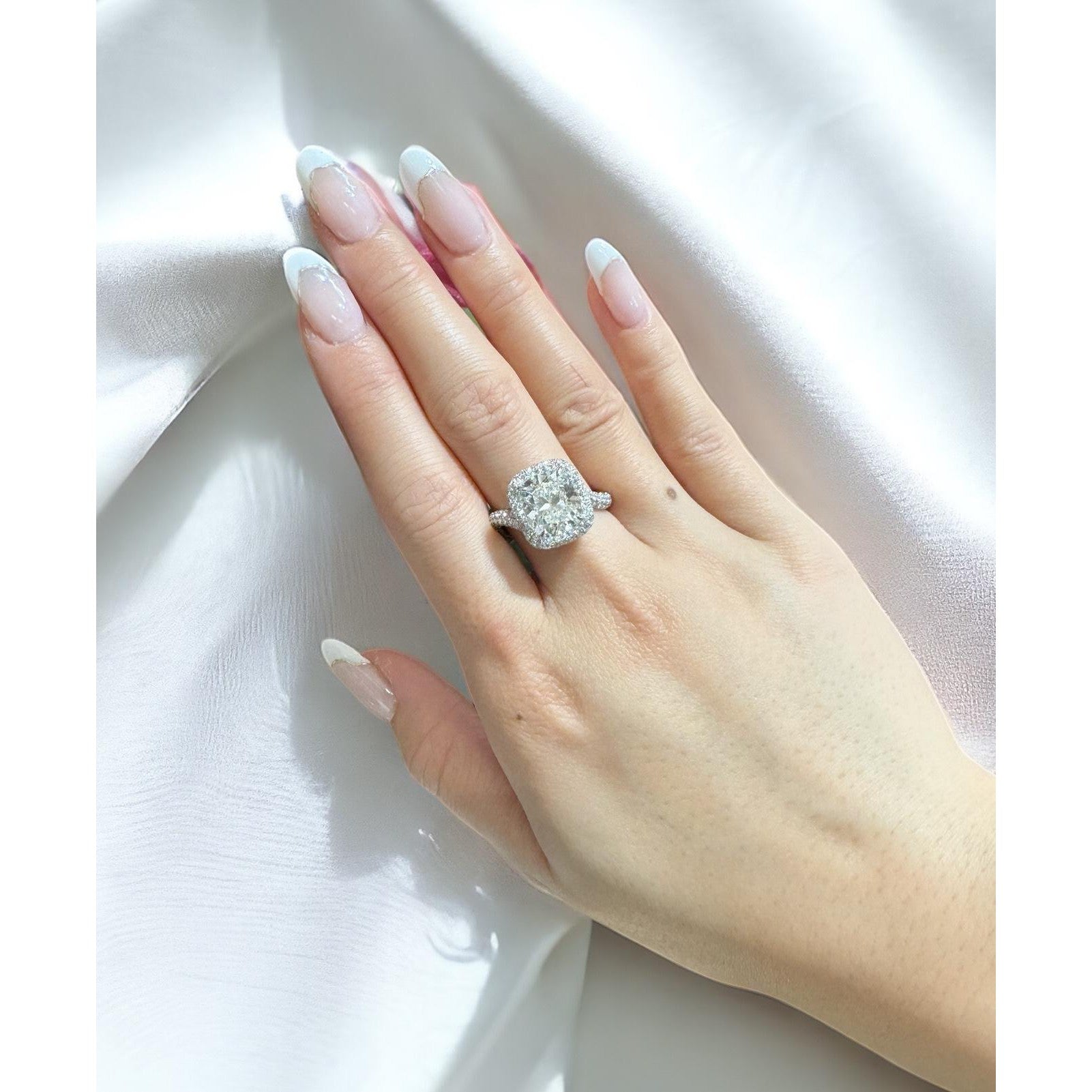 GIA certified 4.10 carat natural diamond engagement ring set in 18K white gold. Cushion brilliant cut diamond ring with round diamond halo and pavé-set shank.