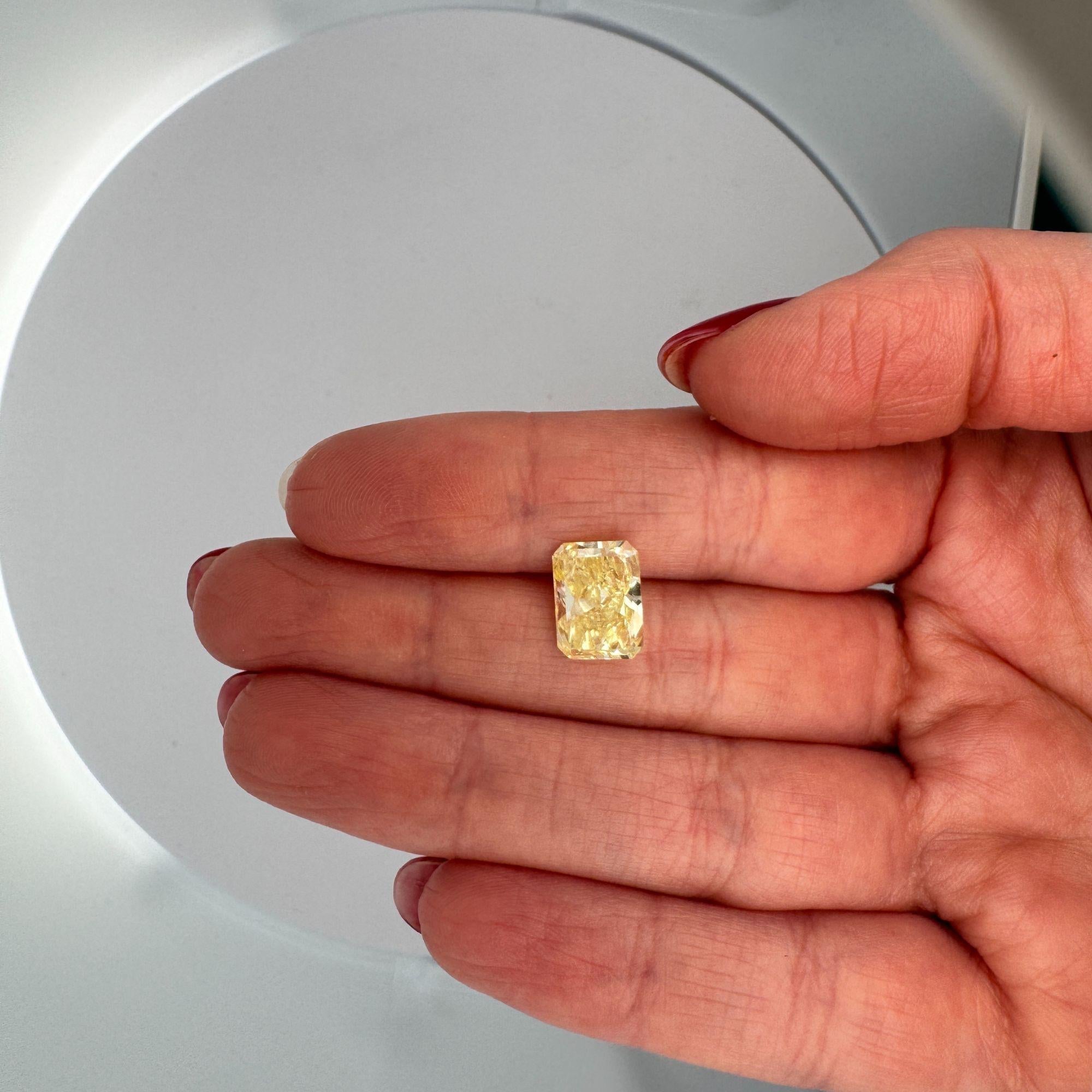 GIA-certified 4.12 carat radiant cut natural fancy yellow diamond with VS1 clarity, even color distribution, and good polish and symmetry. Loose stone ideal for custom settings, measuring 10.82 x 8.19 x 5.24mm with no fluorescence.