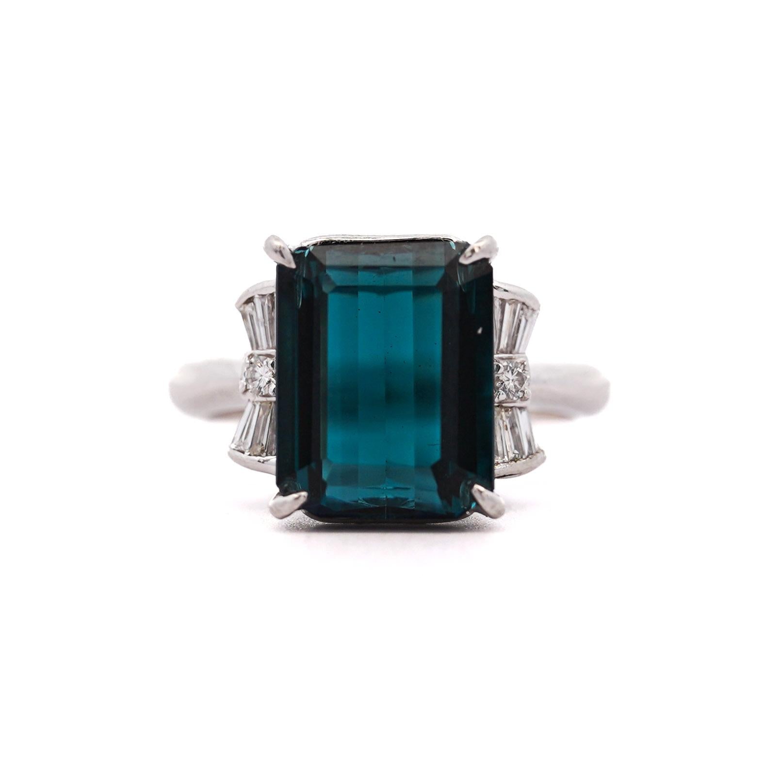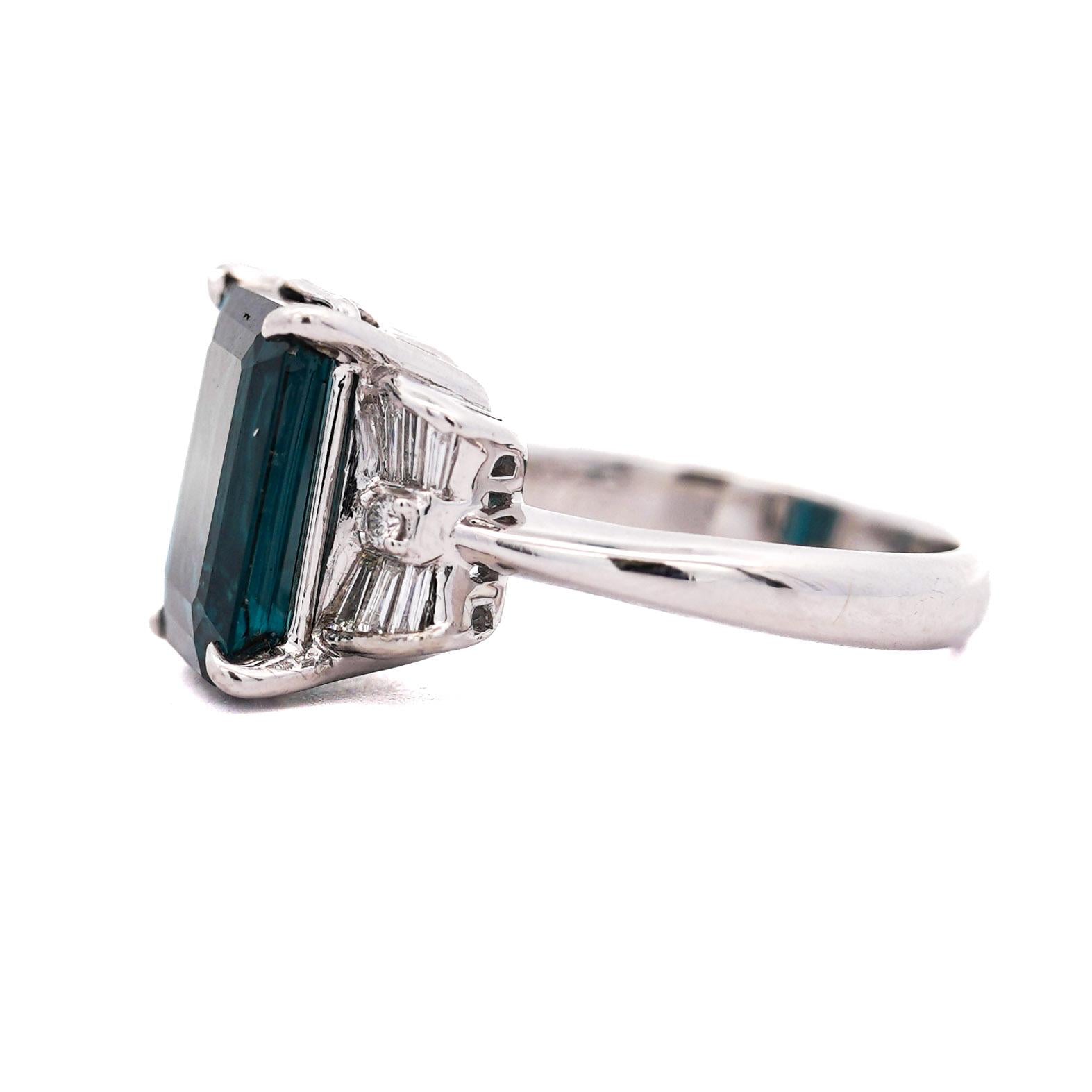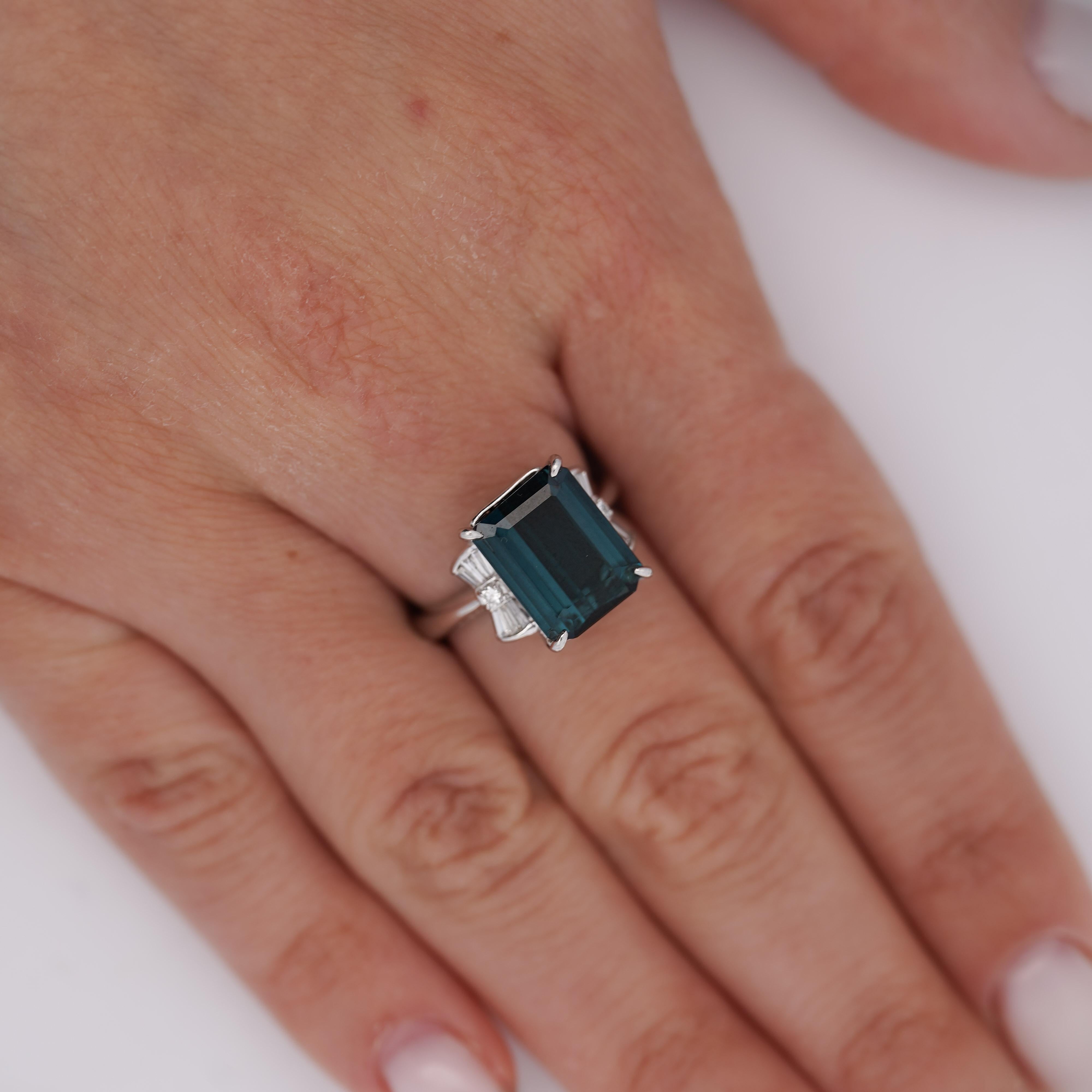 This sophisticated platinum mounting showcases the rare indicolite tourmaline in a secure four-prong setting that maximizes light entry while ensuring stone protection. The flanking baguette and round diamonds create elegant geometric contrast against the emerald-cut center stone. The substantial platinum construction weighing over 8 grams provides exceptional durability and prestige while the clean lines emphasize the tourmaline's natural beauty.