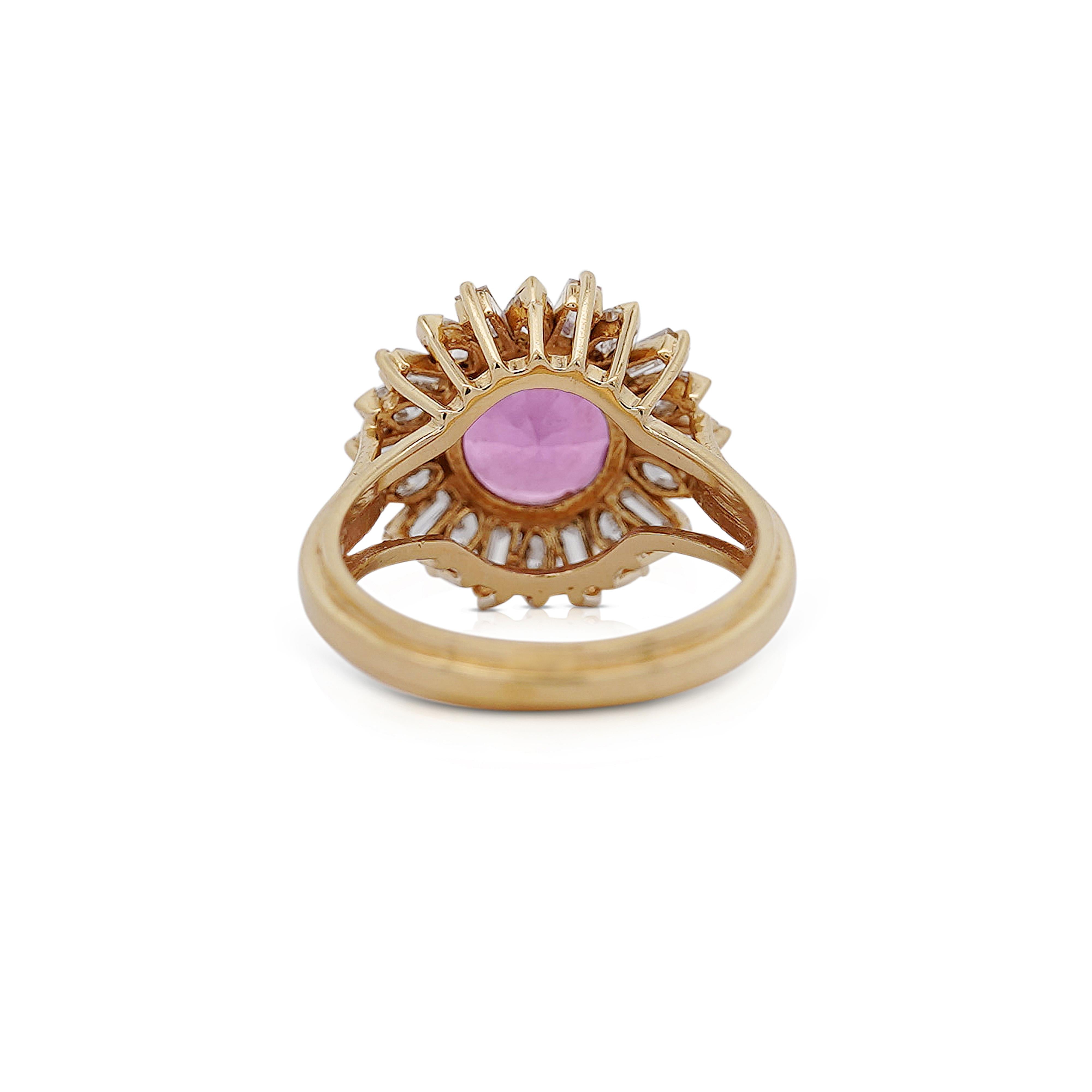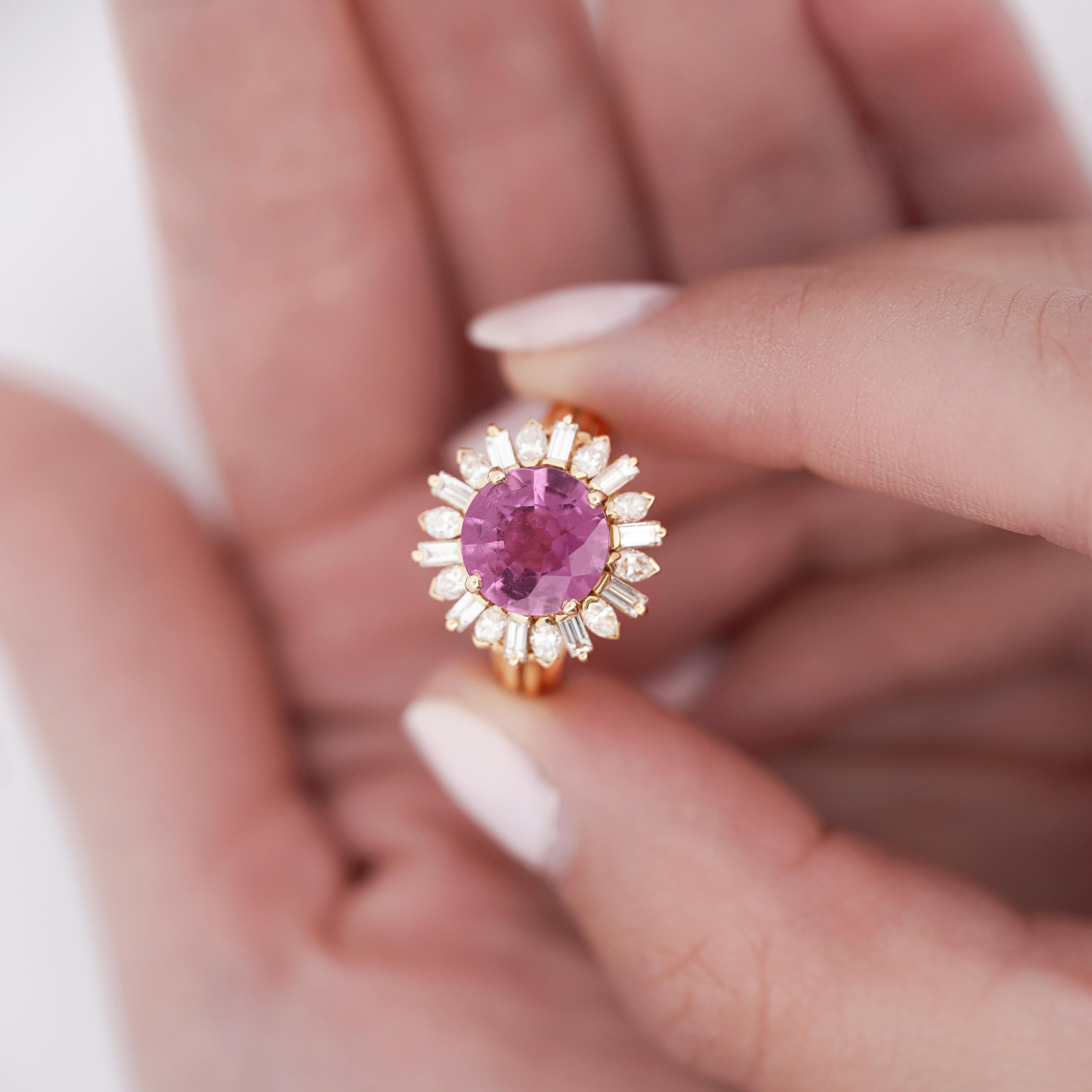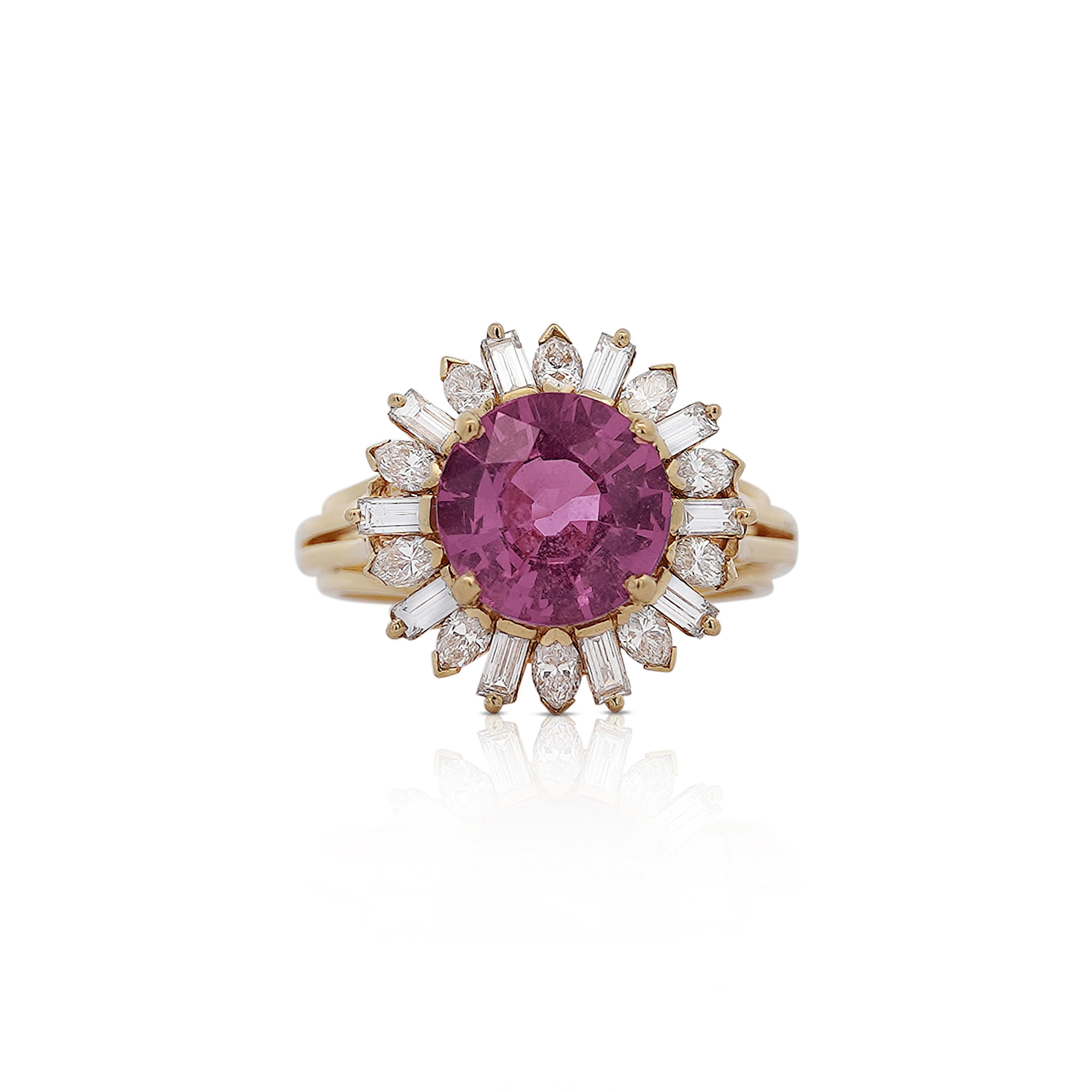 This breathtaking statement ring showcases a vivid 3.8-carat pink sapphire at its heart, surrounded by a sparkling halo of diamonds. Set in 18k yellow gold, this ring draws its inspiration from the elegance and glamour of vintage jewelry, particularly from the mid-20th century. The center stone, an oval-cut pink sapphire, dazzles with its rich pink hue, while the surrounding diamonds—cut in both baguette and marquise shapes—form a beautiful starburst design that catches the light from every angle.