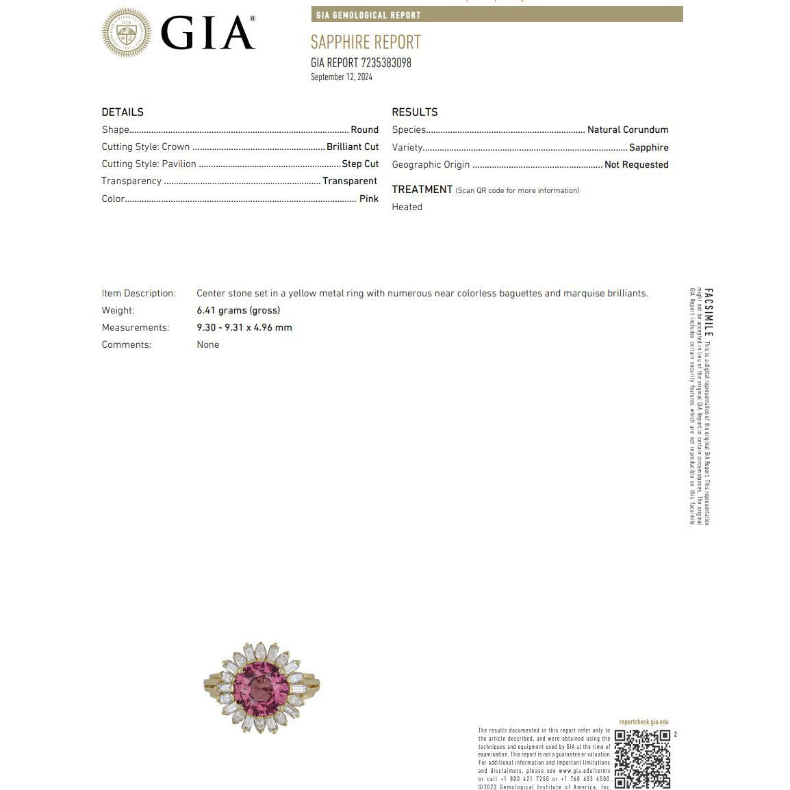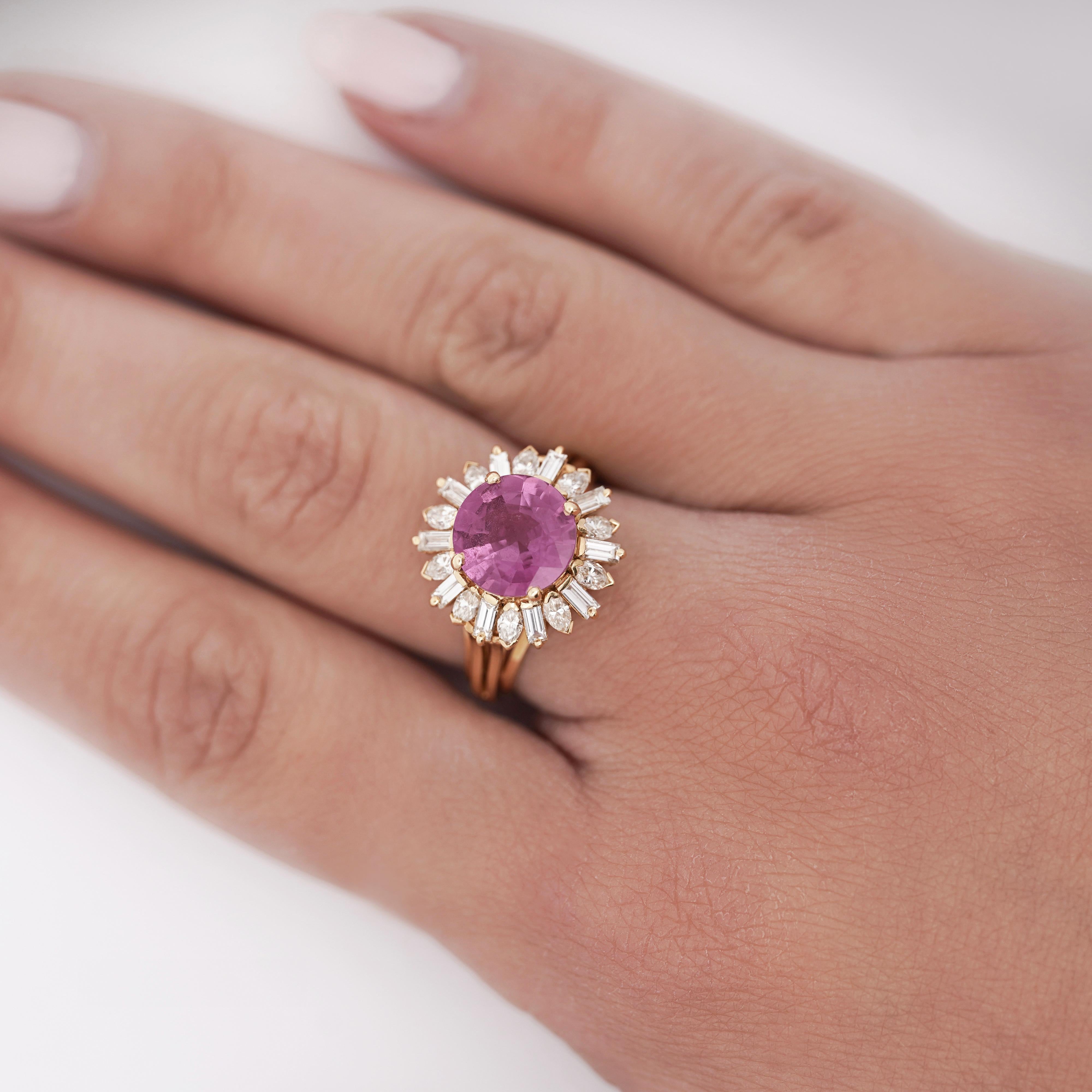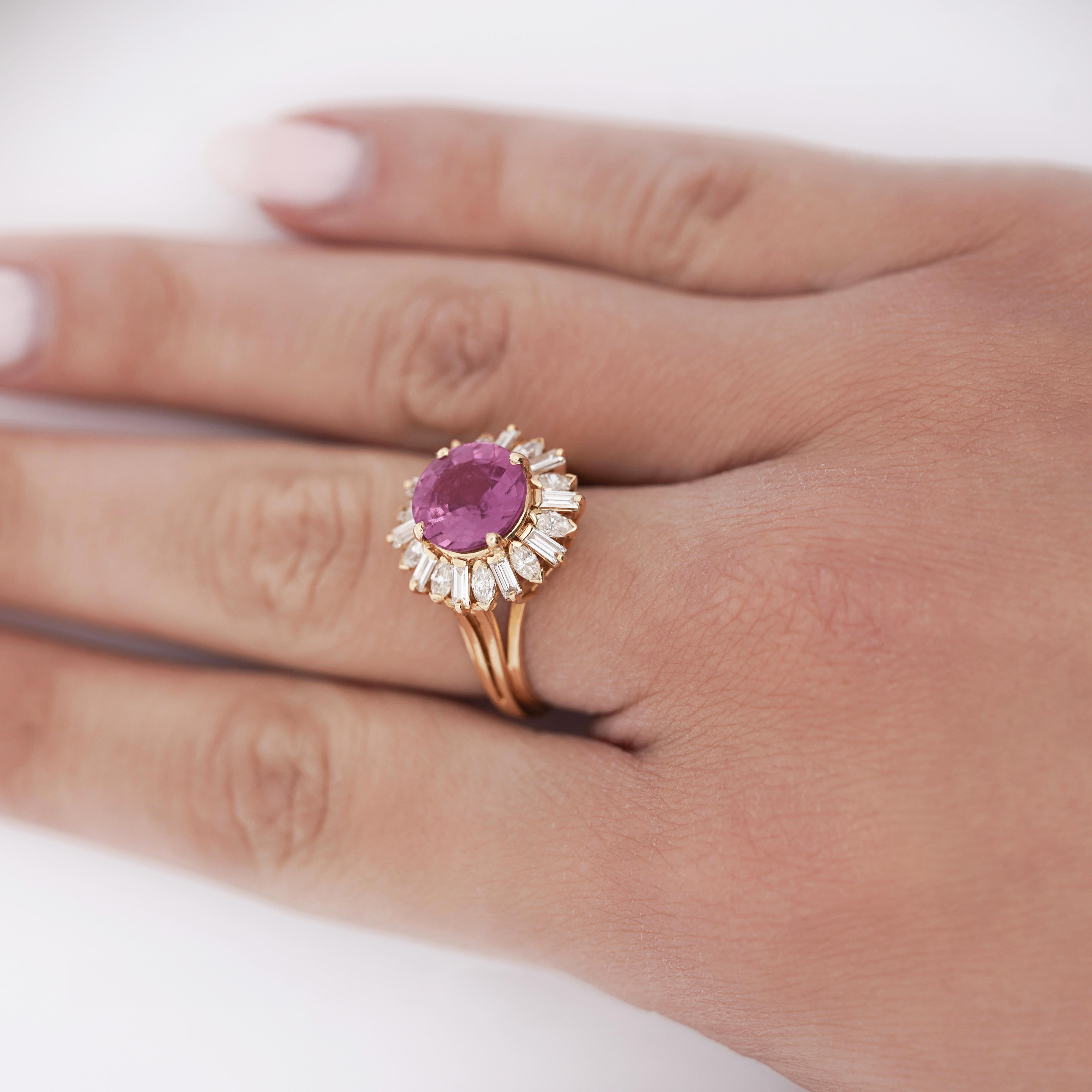 This breathtaking statement ring showcases a vivid 3.8-carat pink sapphire at its heart, surrounded by a sparkling halo of diamonds. Set in 18k yellow gold, this ring draws its inspiration from the elegance and glamour of vintage jewelry, particularly from the mid-20th century. The center stone, an oval-cut pink sapphire, dazzles with its rich pink hue, while the surrounding diamonds—cut in both baguette and marquise shapes—form a beautiful starburst design that catches the light from every angle.
