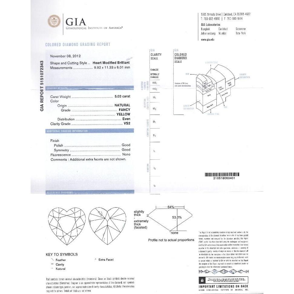GIA Certified 5.03 carat Fancy Yellow heart cut diamond ring with a round cut white diamond halo. Set in 18k... Read more