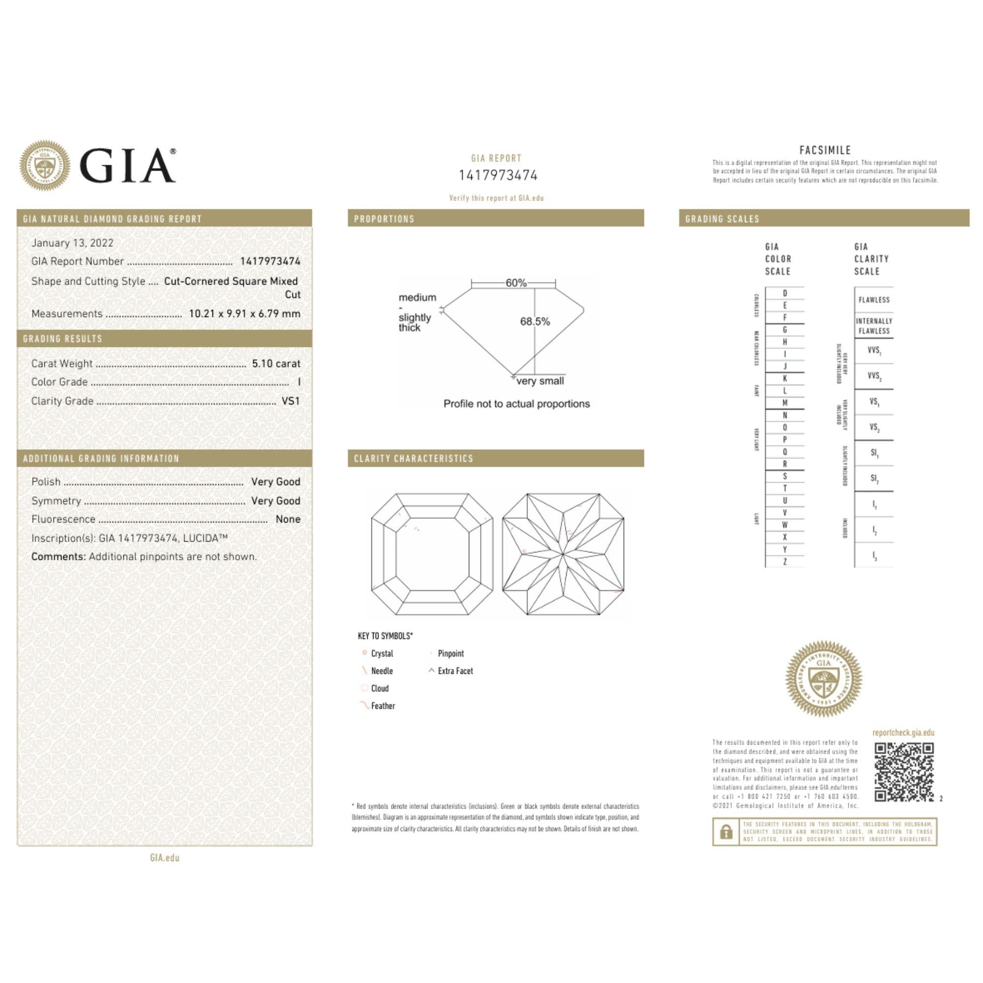 The Lucida cut is a trademark cut by Tiffany & Co., known for its distinct brilliance. This 5.10 carat diamond features exceptional VS1 clarity and I color with strong geometric structure, delivering a bold and timeless look for fine jewelry design or investment purposes.