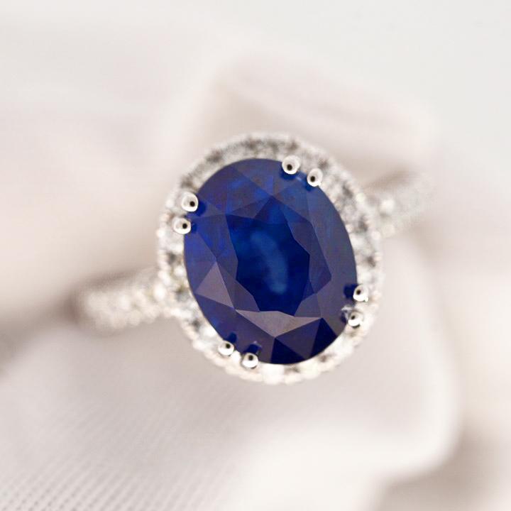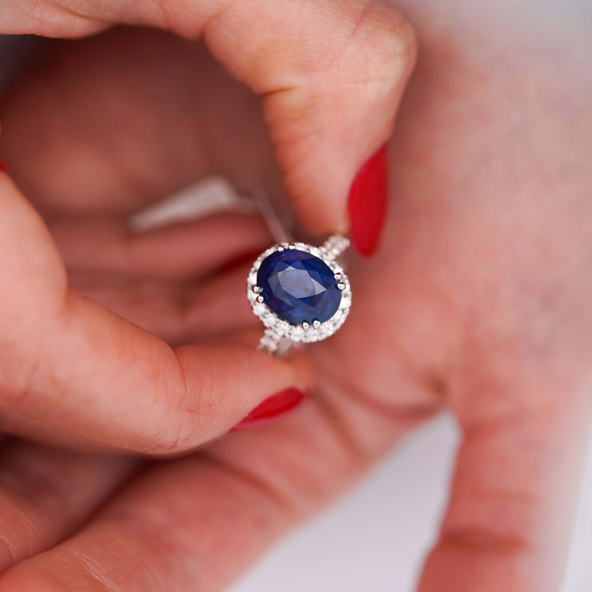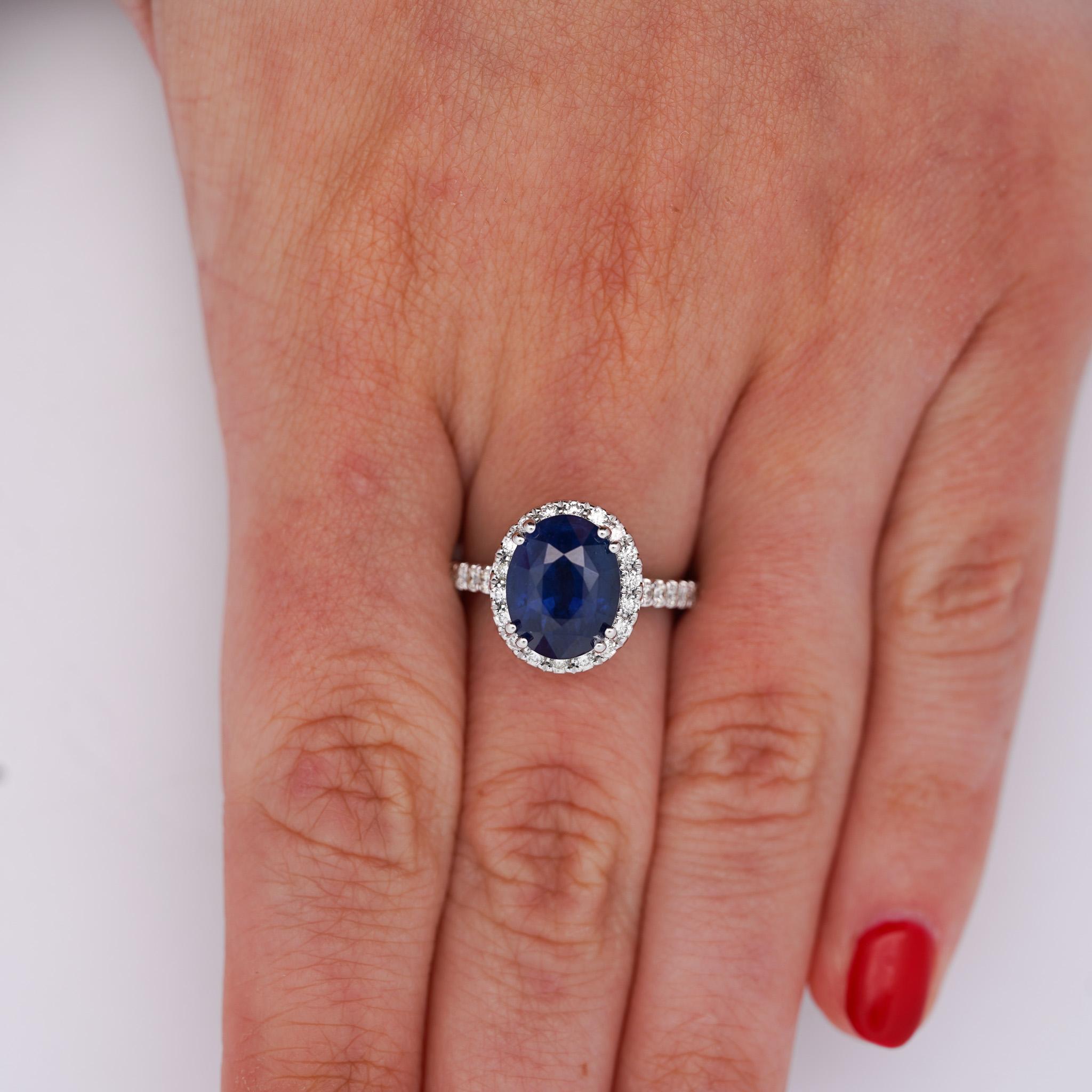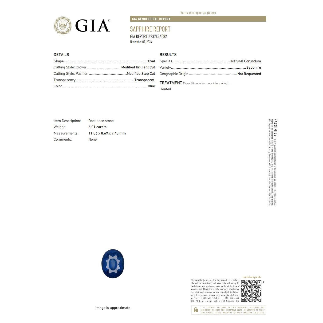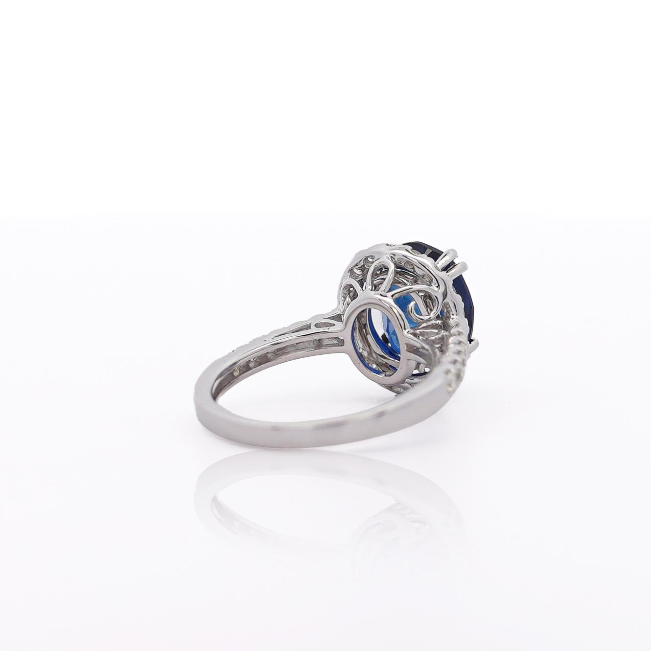 GIA certified 6.01-carat oval cut Blue Sapphire takes center stage in this 18K white gold engagement ring, encircled by 30 round cut white diamond halo and pave band.