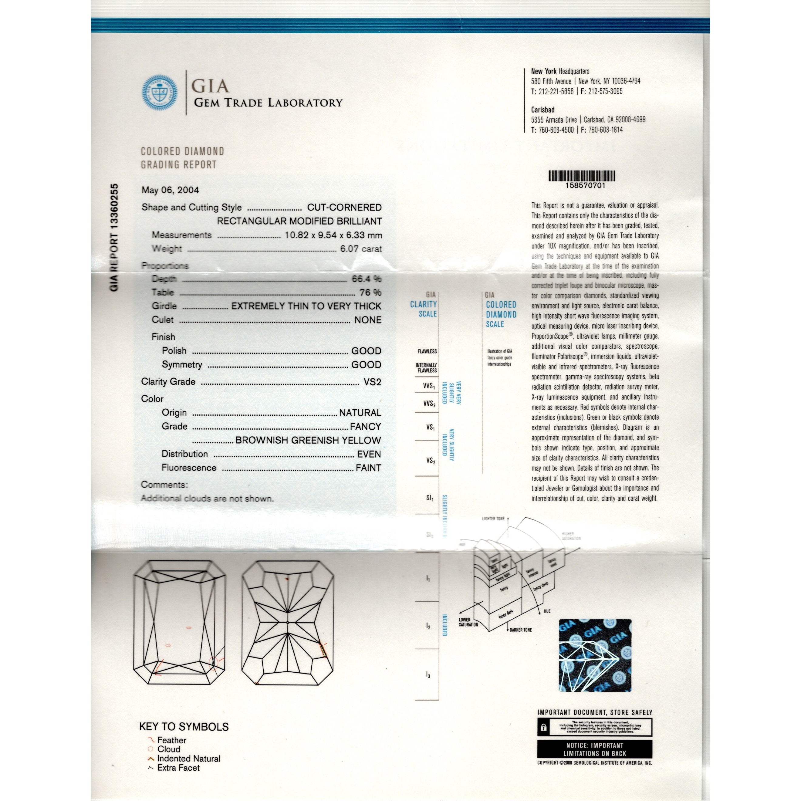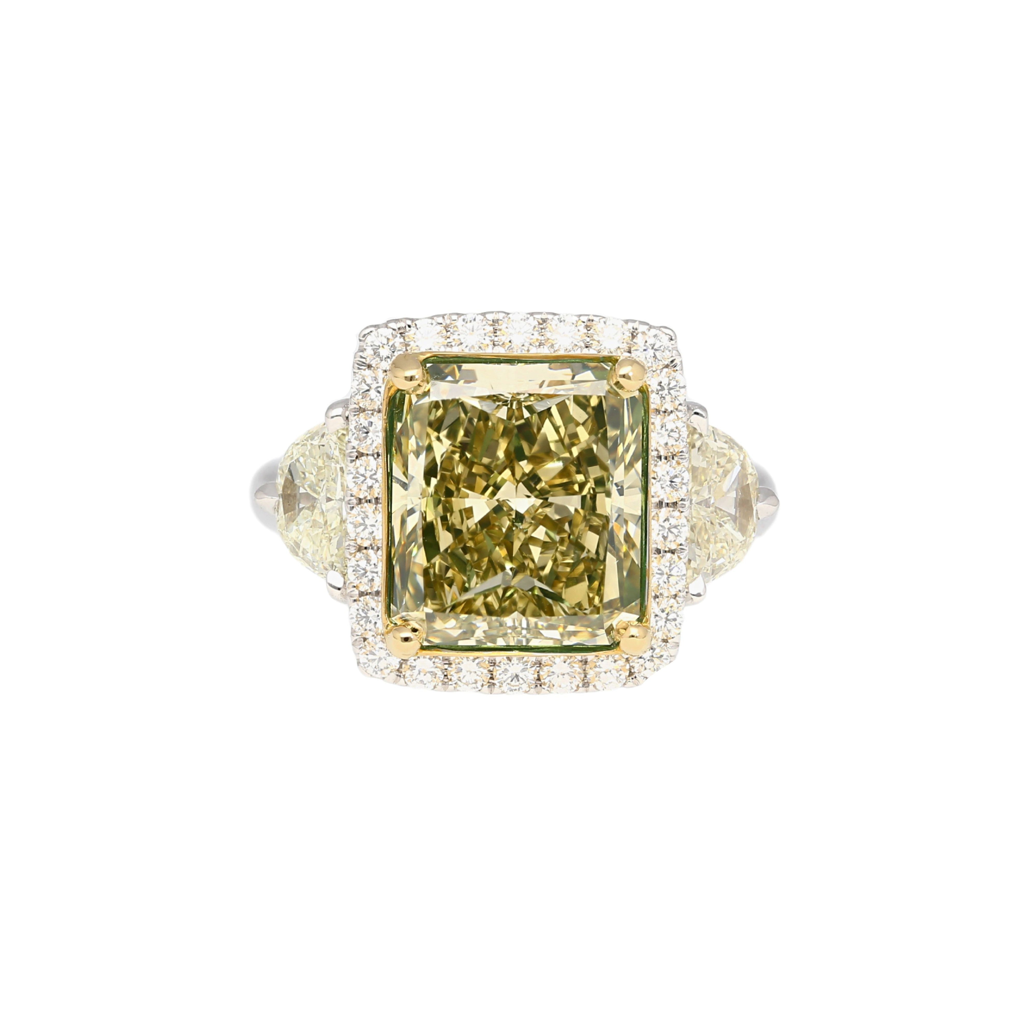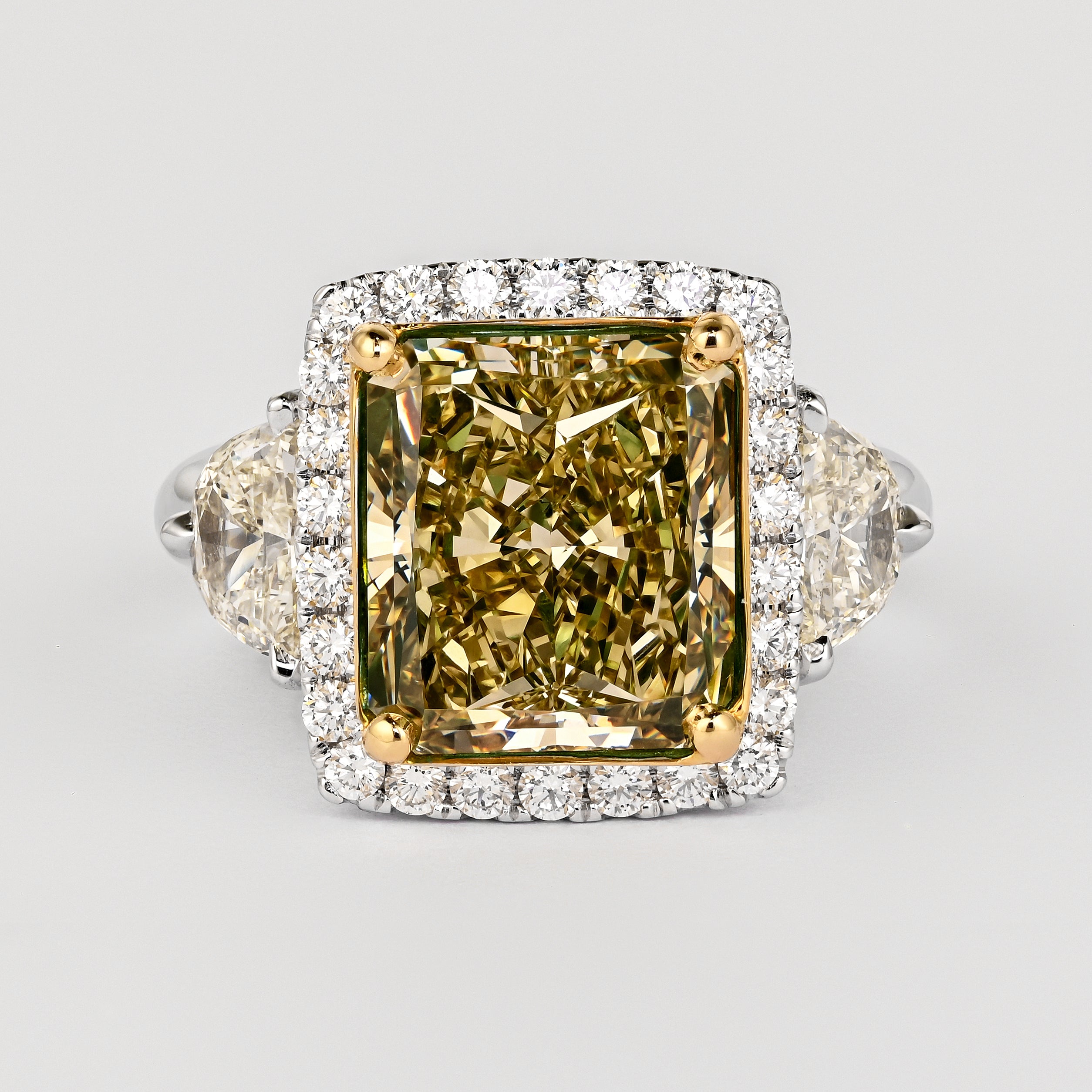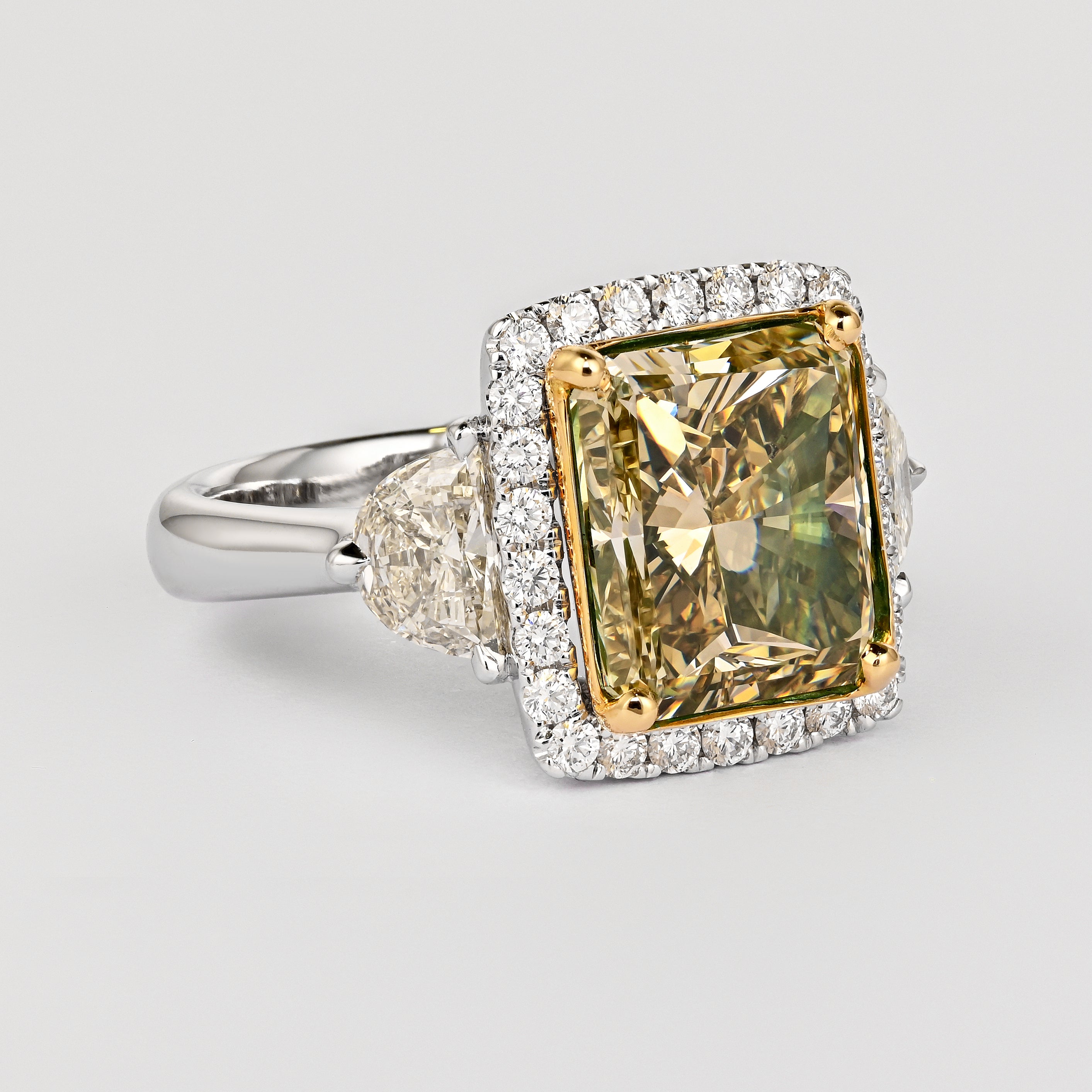 GIA certified 6.07 carat fancy brownish greenish yellow radiant cut diamond engagement ring. Set in 18k white and yellow gold. The ring features a round brilliant cut white diamond halo and pave set ring shank, yellow gold prongs, and an open back on the culet, allowing for the stone's natural color to be on full display. Adorned by 2 half-moon cut diamond side stones with a charming yellowish tint.