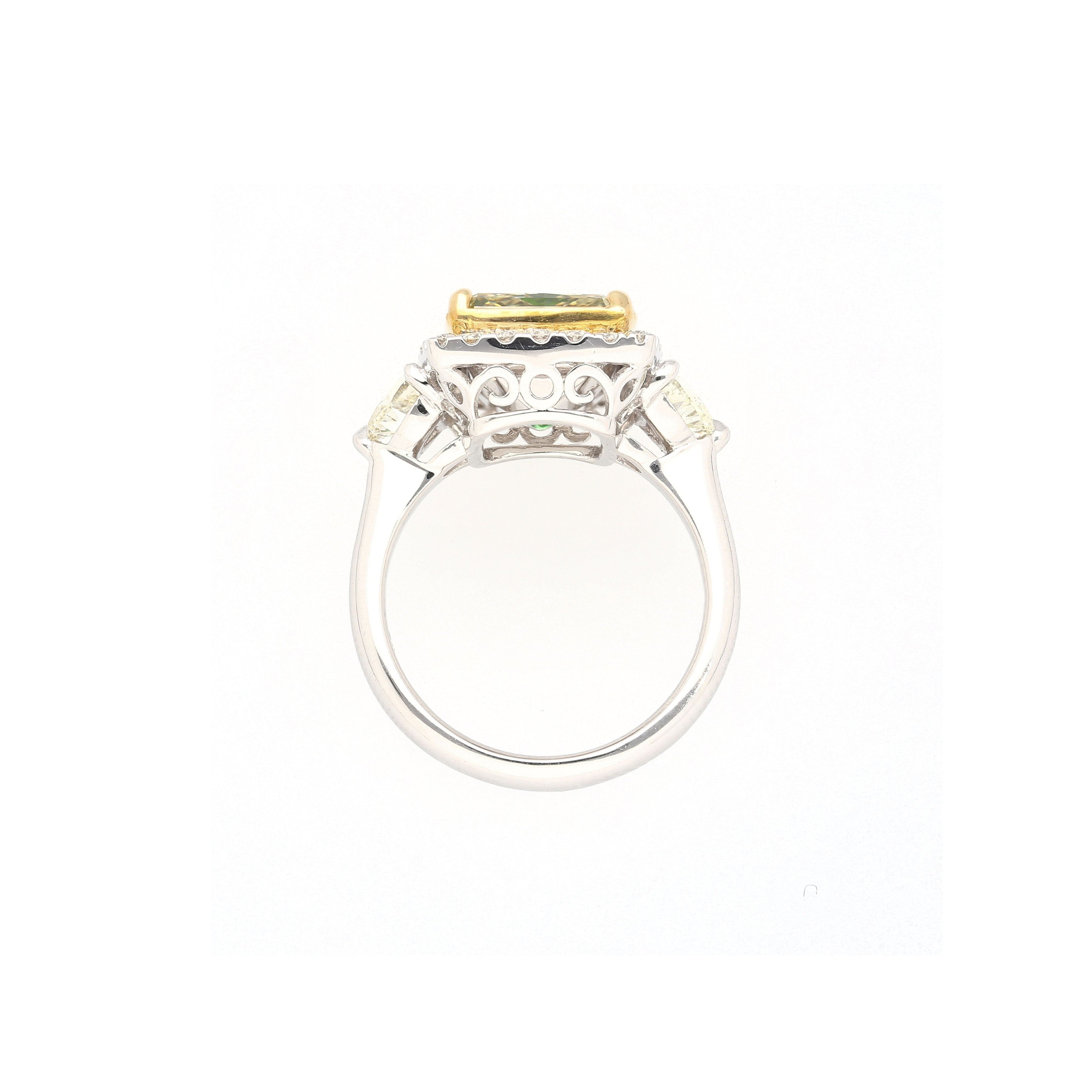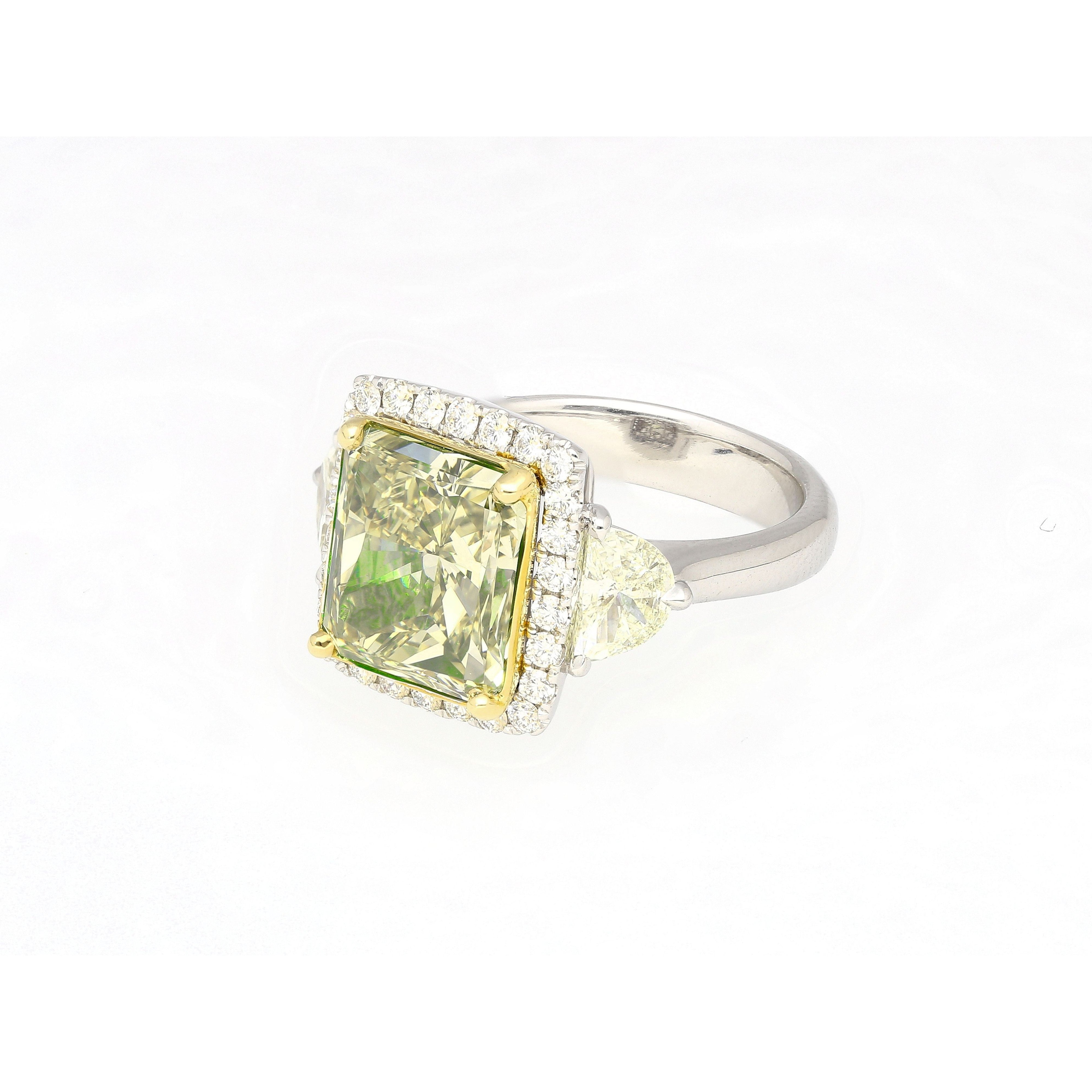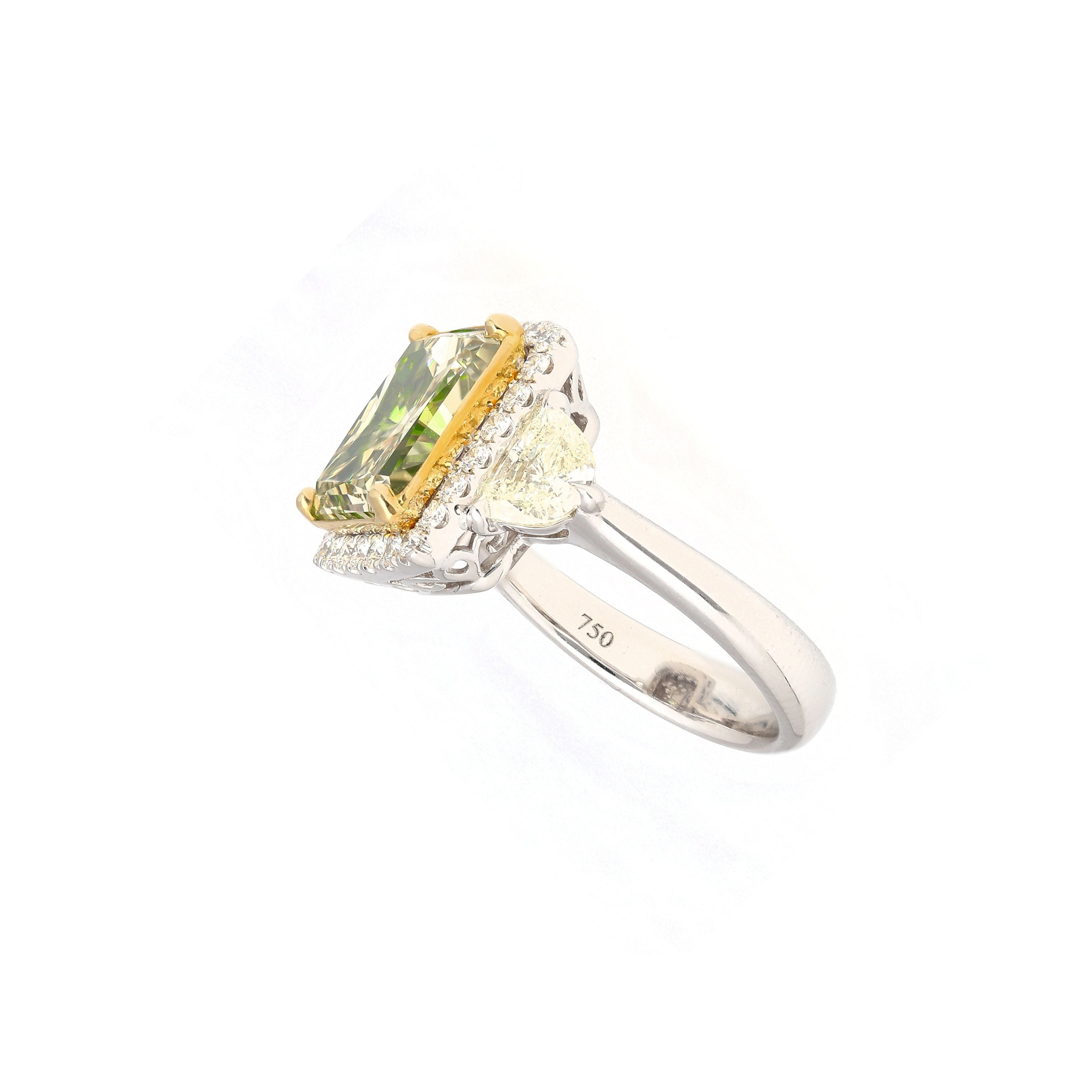 The center stone diamond is remarkably brilliant, with a slightly elongated radiant cut, even distribution, and more than eye-clean clarity. The fancy color origin is 100% natural, untreated, or enhanced in any way. The GIA certified color sequence reports all the varying colors in the stone. With the naked eye, the stone is predominantly green in hue.