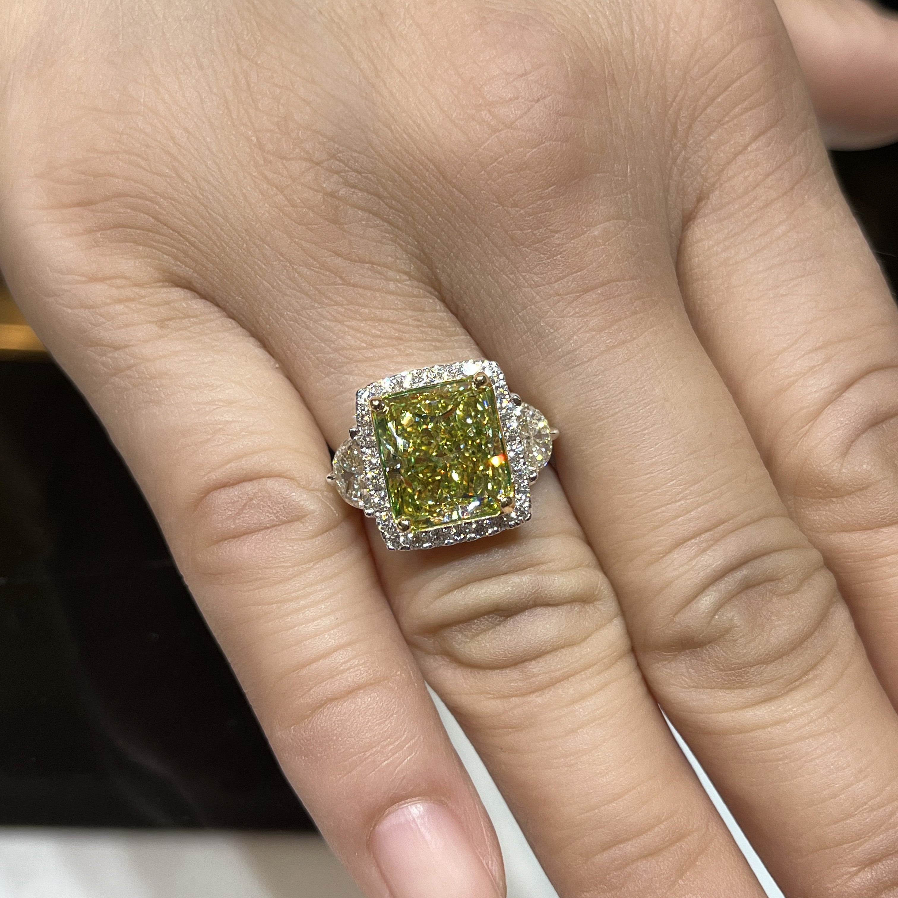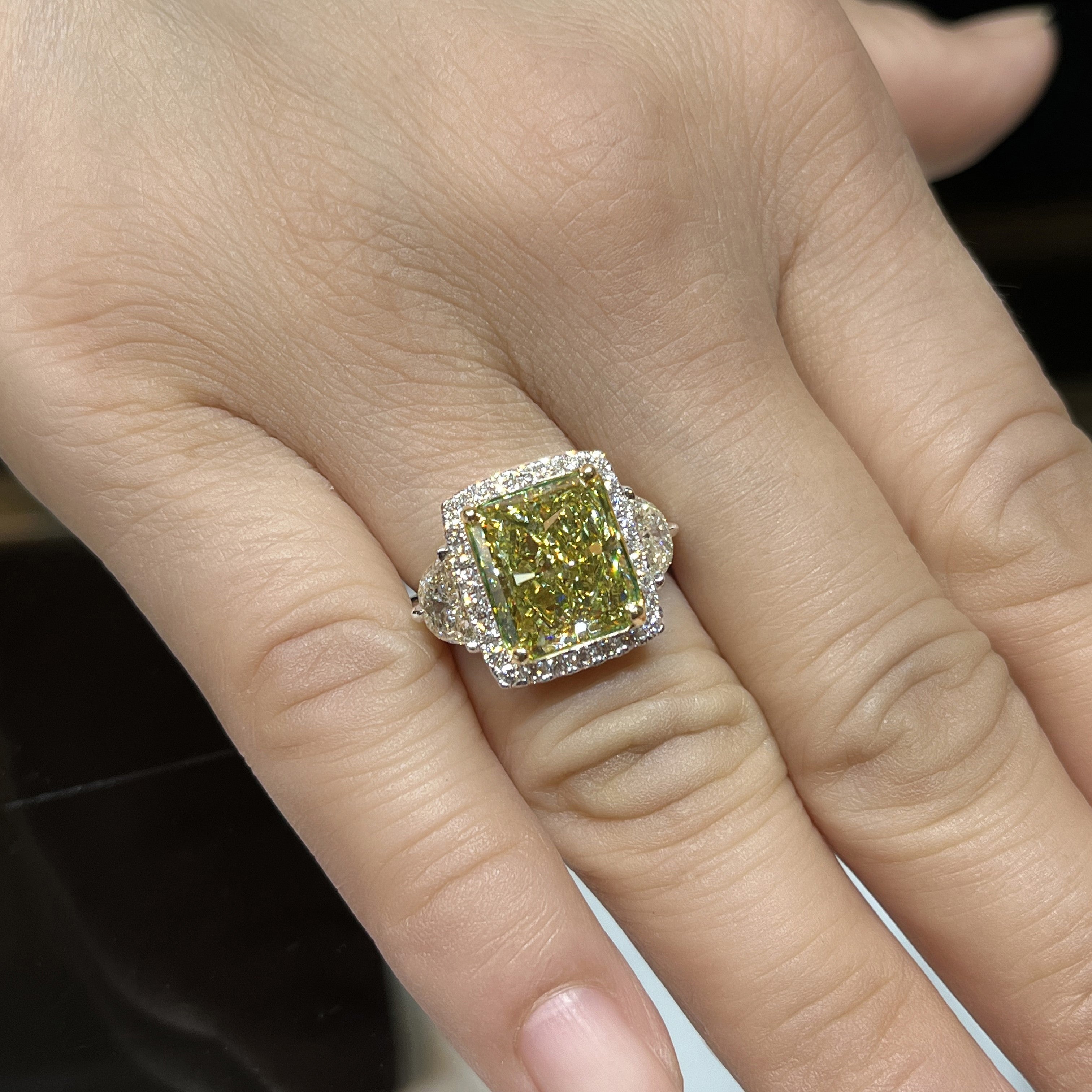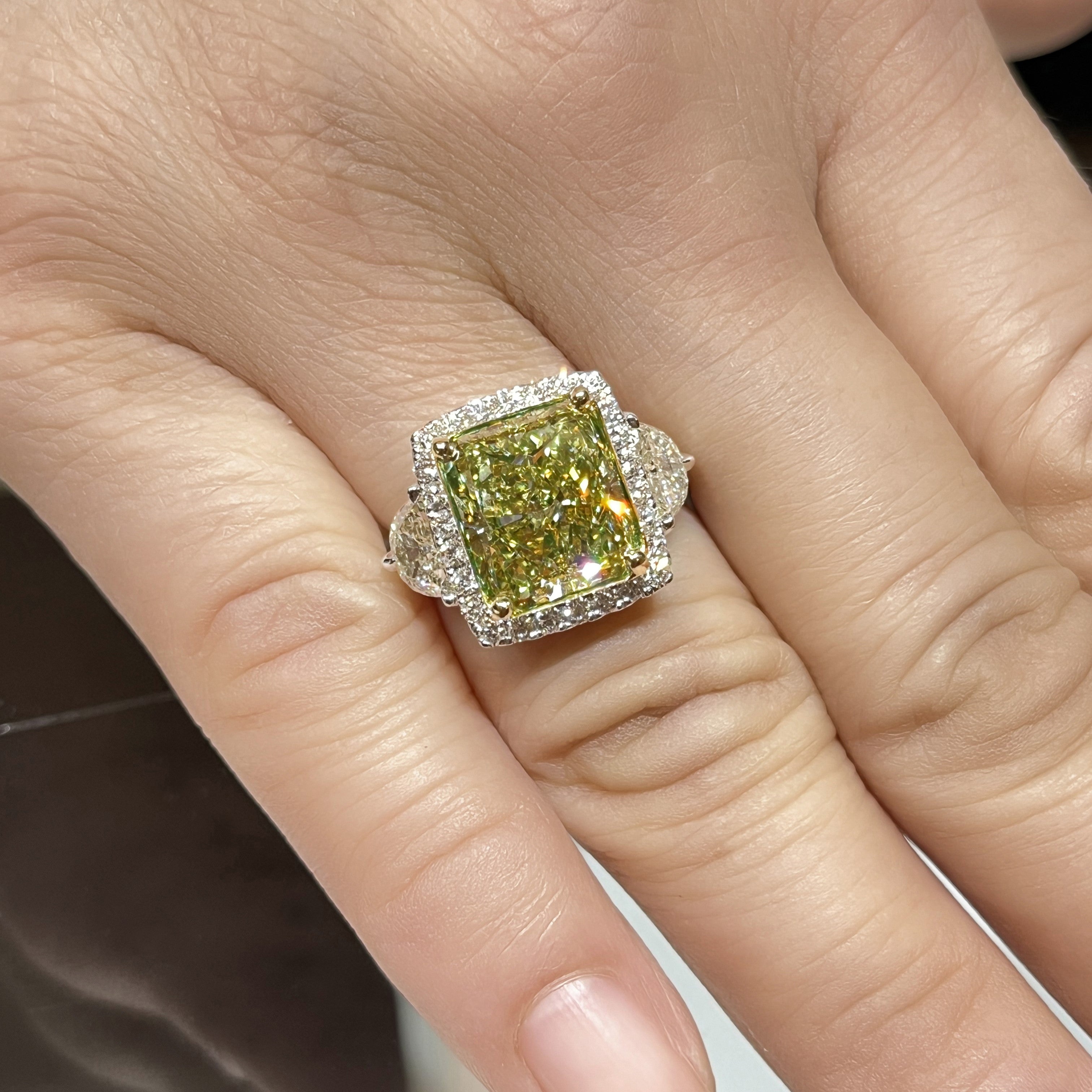 The center stone diamond is remarkably brilliant, with a slightly elongated radiant cut, even distribution, and more than eye-clean clarity. The fancy color origin is 100% natural, untreated, or enhanced in any way. The GIA certified color sequence reports all the varying colors in the stone. With the naked eye, the stone is predominantly green in hue.