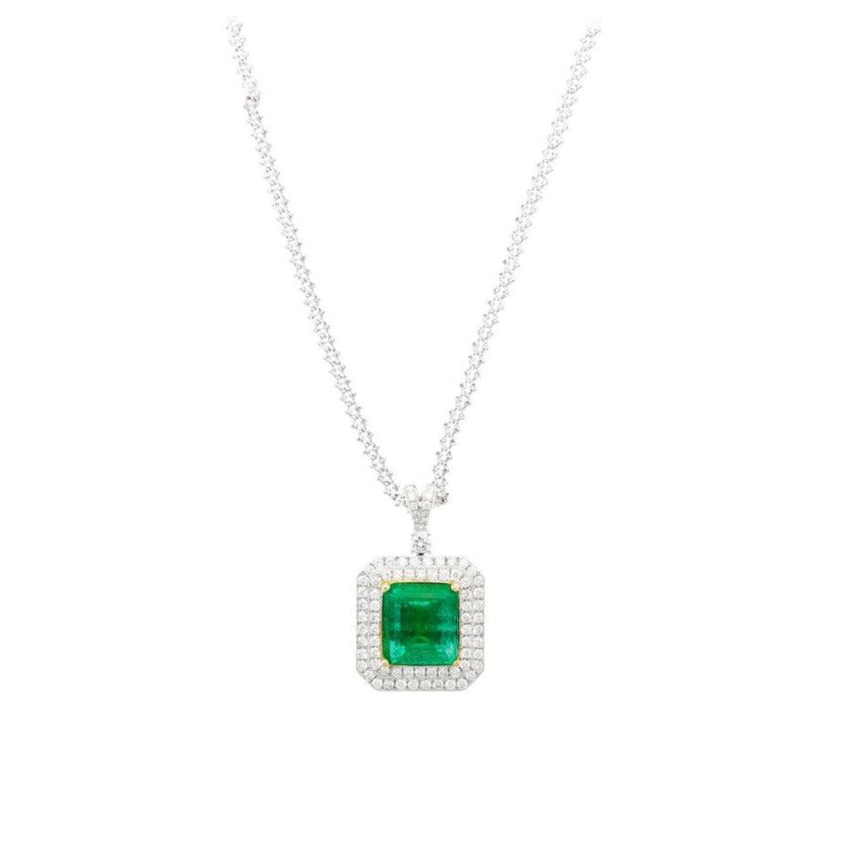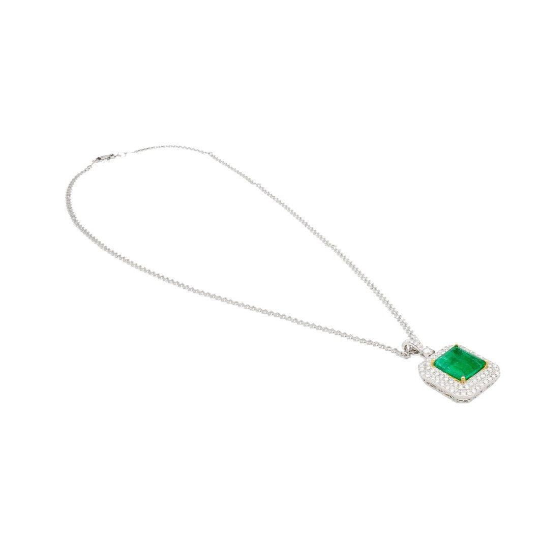 6.33 Carat Emerald Cut Colombian Emerald Round Diamond Pendant Necklace 18K White Yellow Gold Cable Chain Minor Oil