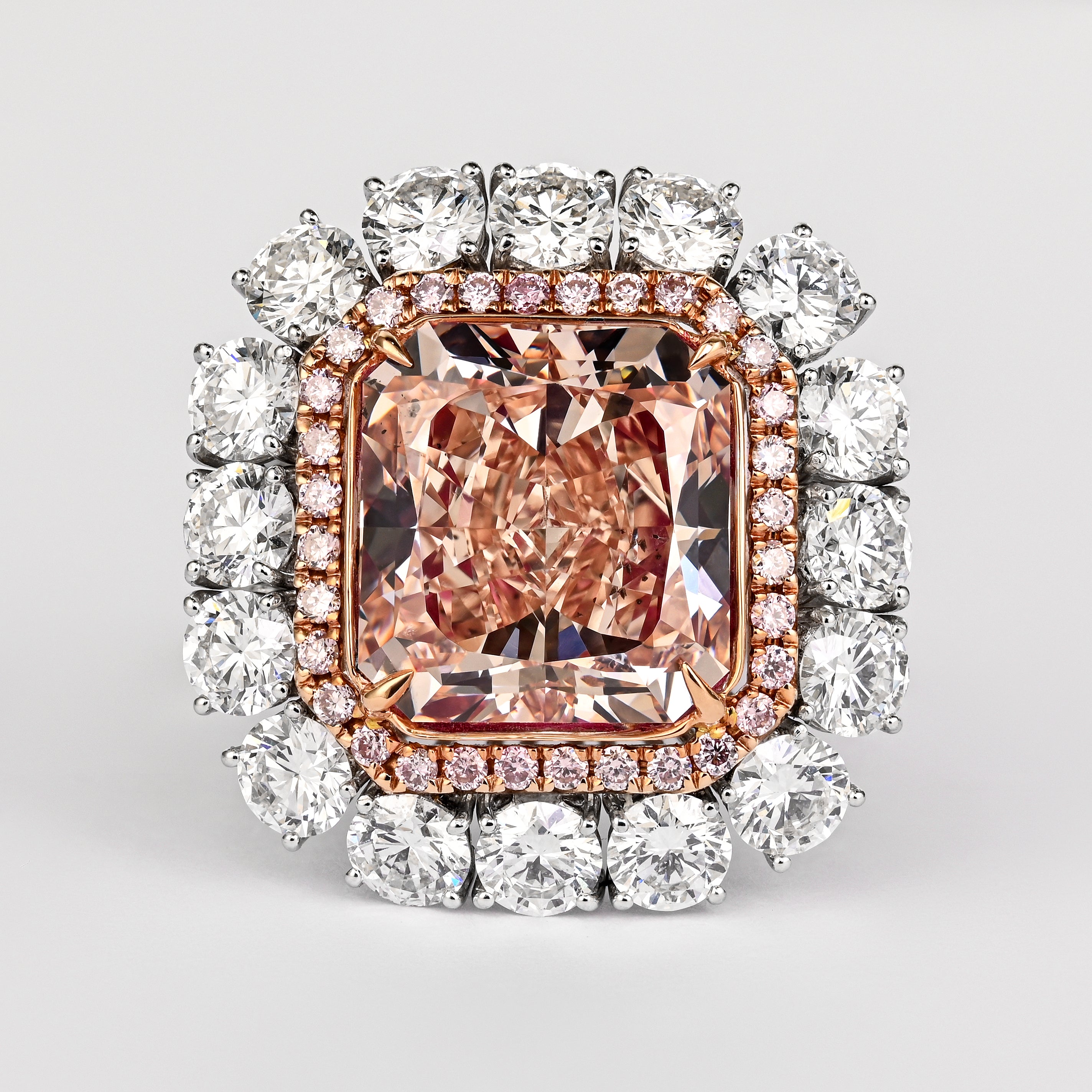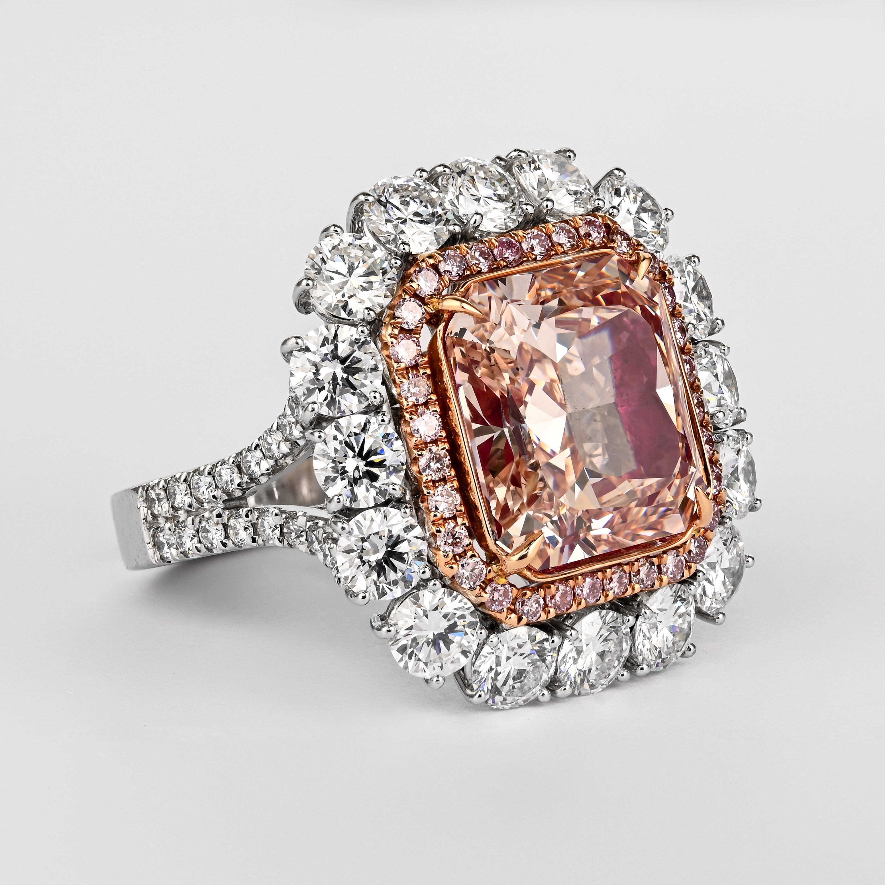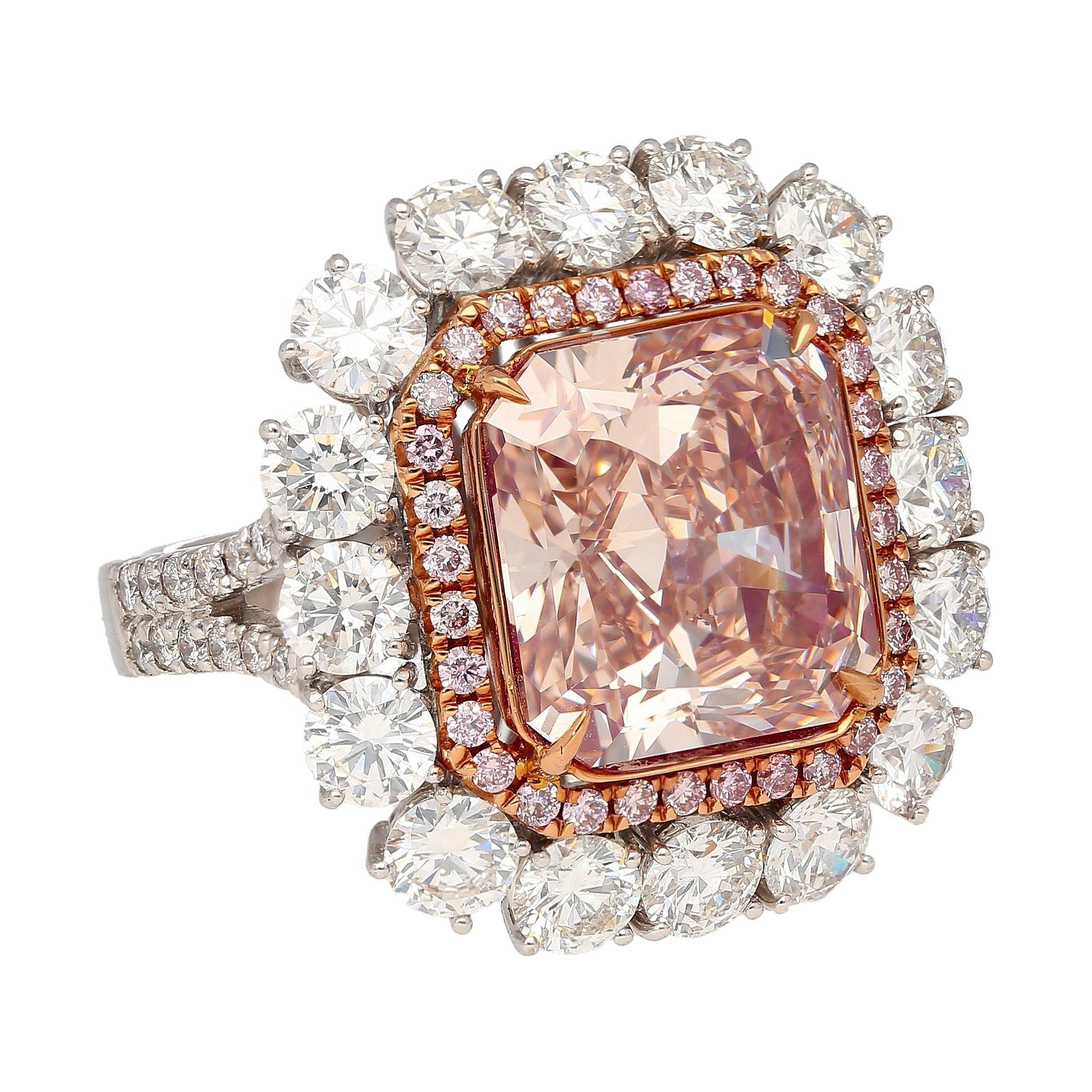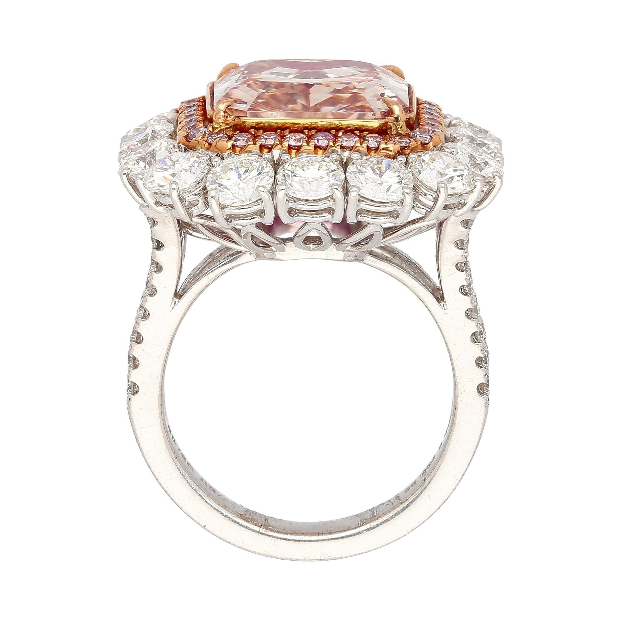 GIA certified 6.53 carat natural fancy color diamond ring set in 18K white and rose gold. Engagement ring set with a cut corner rectangular fancy pink brown diamond and layered white and pink diamond accents.