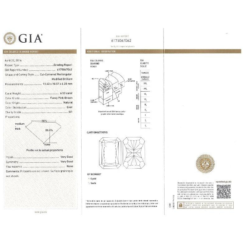 Accompanied by GIA report no. 6175067062 stating the diamond is natural, cut corner rectangular in shape, Fancy Pink-Brown in color, with listed measurements and carat weight.