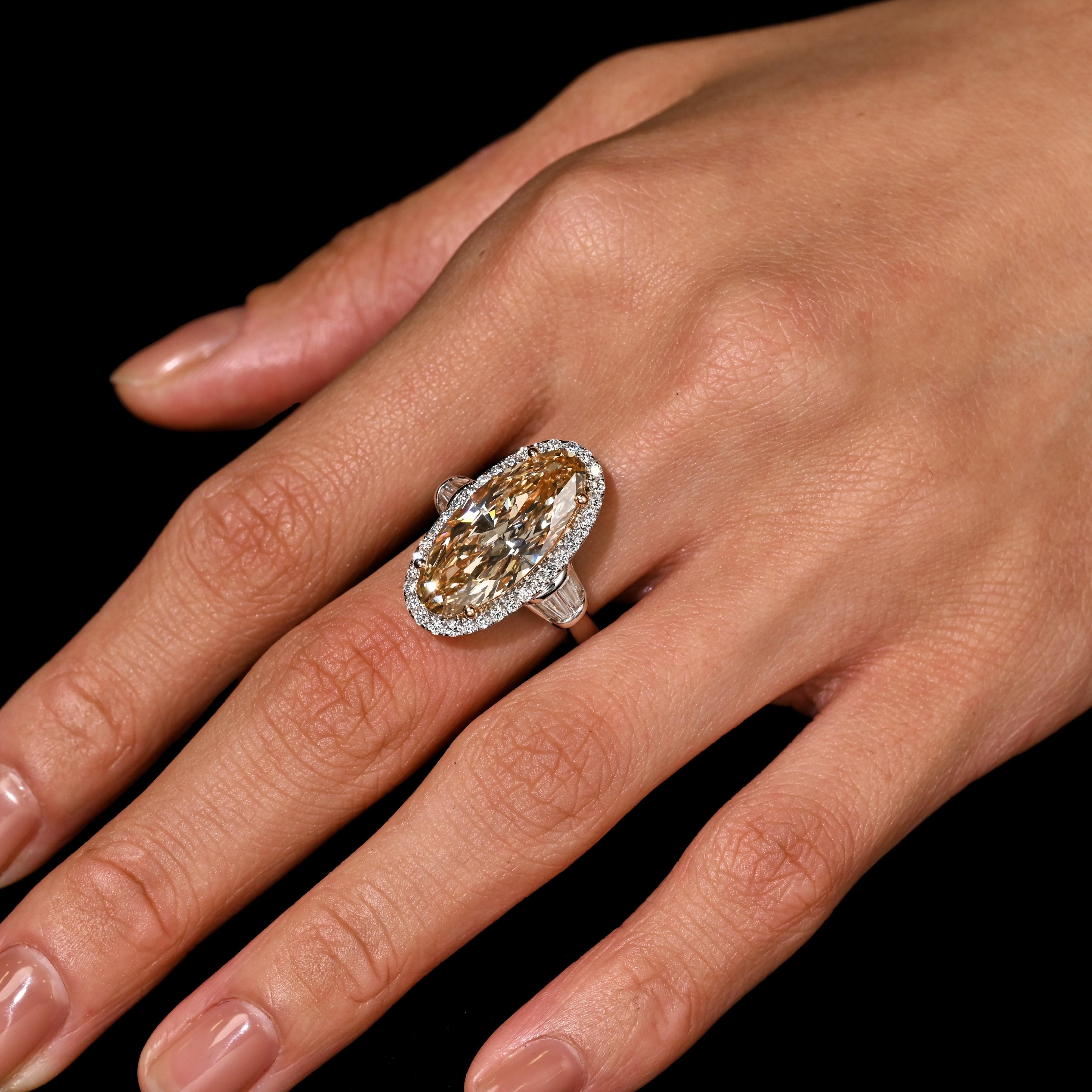 The diamond center stone is a clean 6.00 carats with VVS2 clarity and a superbly unique color that you will not find elsewhere. It features a delicious mix of yellow and brown to create a mesmerizing champagne orange color with a whispering hint of pink. The stone also bears a very pronounced elongated shape with the carat weight exceptionally present when worn. Giving the optics of a 8 or 9 carat stone. It is quite rare to find an oval cut with so much length, elongating the finger and offering superb coverage on the finger.