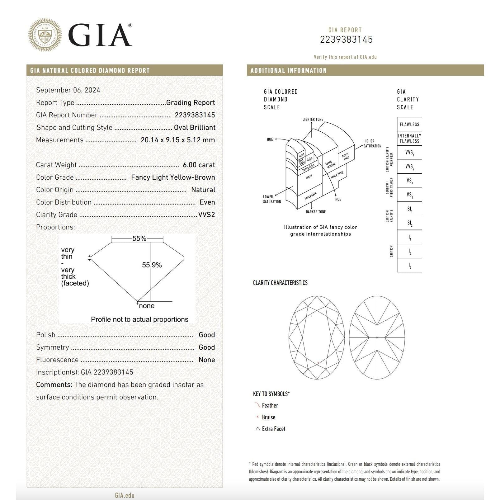 GIA Certified 6.00 carat Oval Cut Fancy Light Yellow-Brown Diamond Engagement Ring. Sets 34 round cut white diamond halo and... Read more