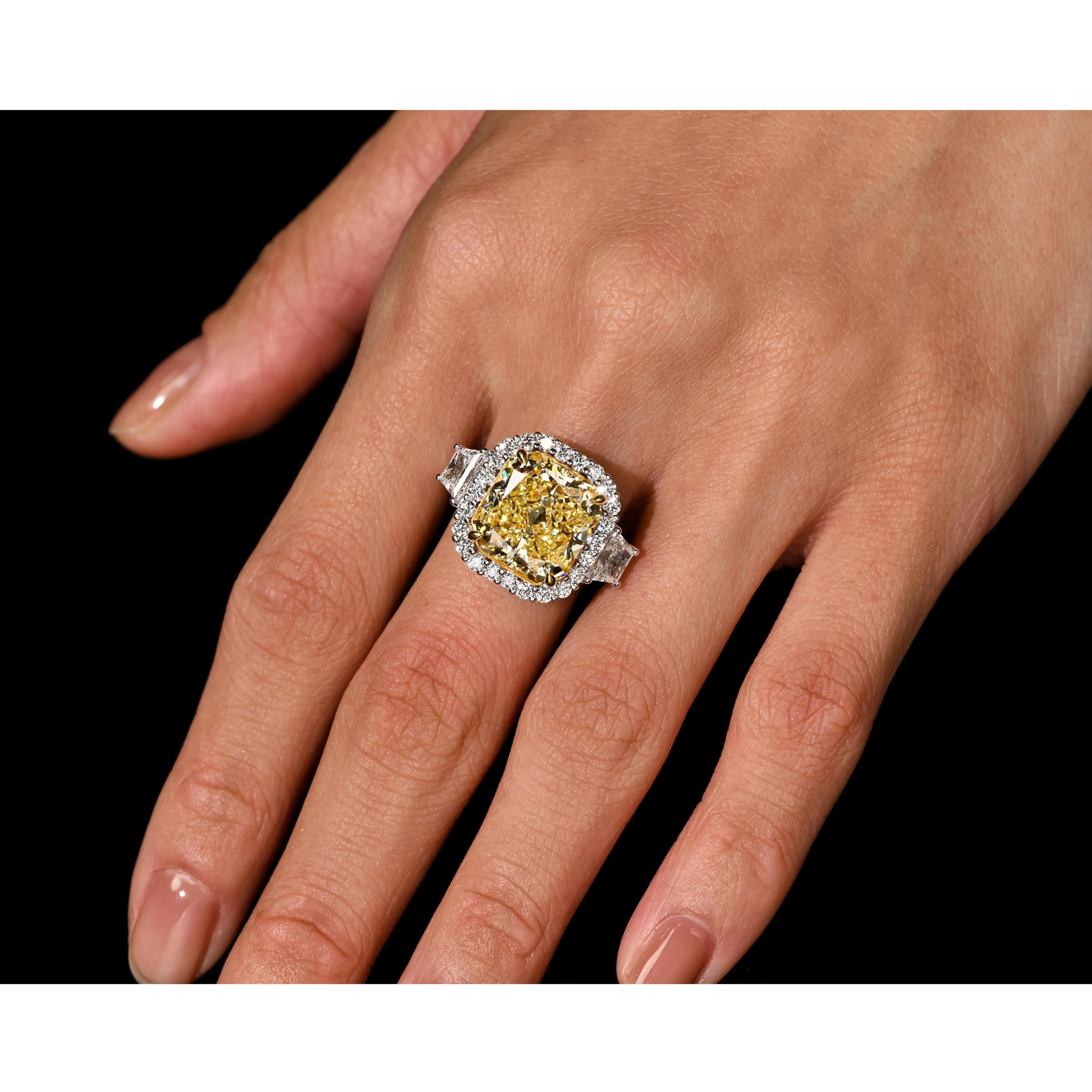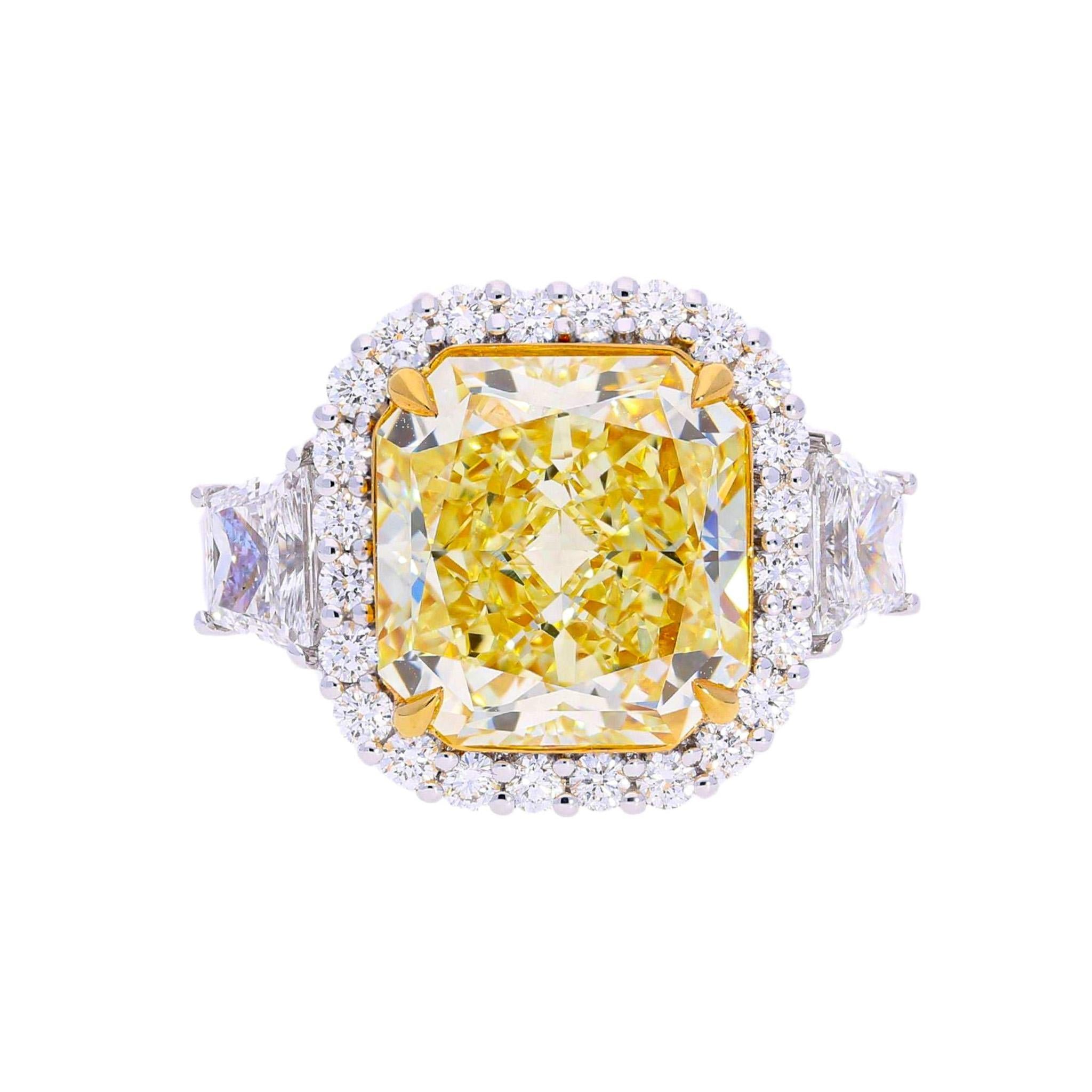 Substantial and breathtaking GIA certified 8.39 carat radiant cut fancy intense yellow diamond ring. Featuring 2 trapezoid cut diamond side stones and a round cut diamond halo and ring shank. Set in 18k white gold with yellow gold prongs. The ring setting also bears stunning floral motif curvature along the basket.