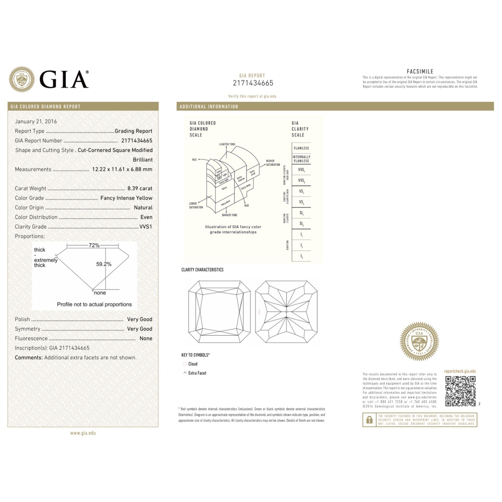Over 8 carats and 12 x 11mm in face up size, this diamond command a strong presence on the finger with a rich, intense yellow that is every bit as advertised by GIA. The stone has strong and pronounced facets forming a radiant cut with optimal brilliance. It's a true investment piece for serious collector.