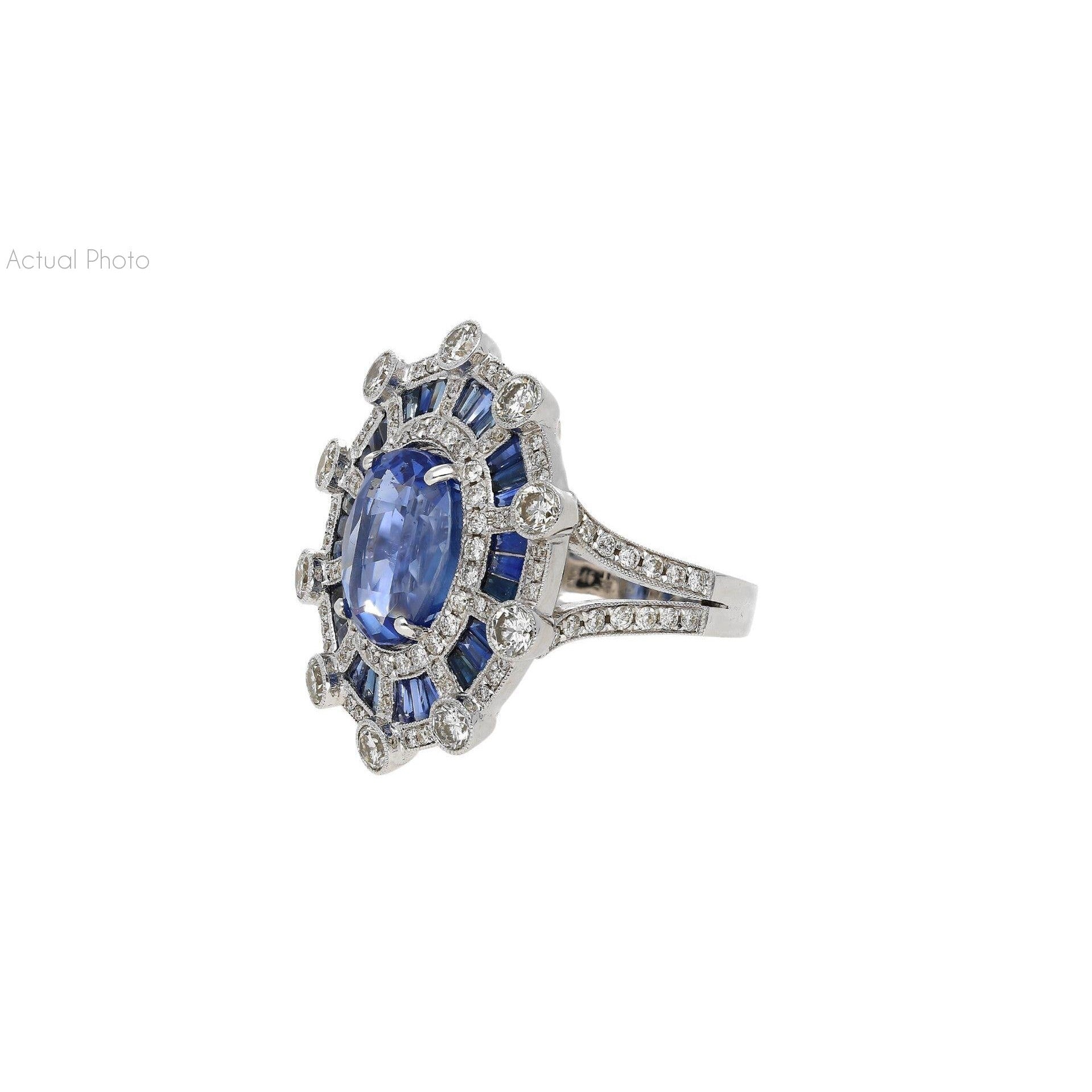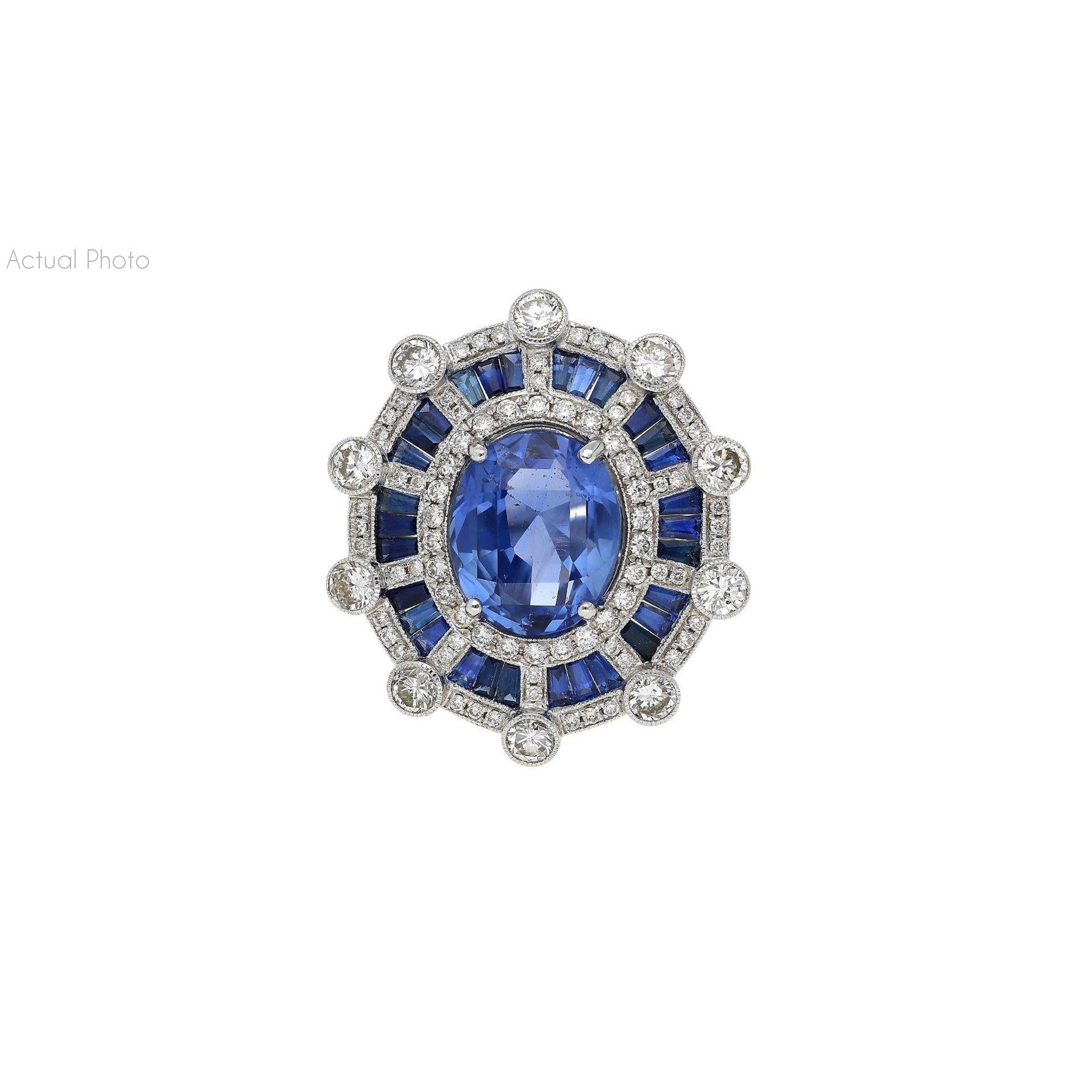 GIA certified 8.46 carat natural blue sapphire set in an 18K white gold geometric Art Deco diamond halo ring. This is an oval cut no heat Sri Lanka sapphire ring with baguette cut sapphire accents and round cut diamond detailing.