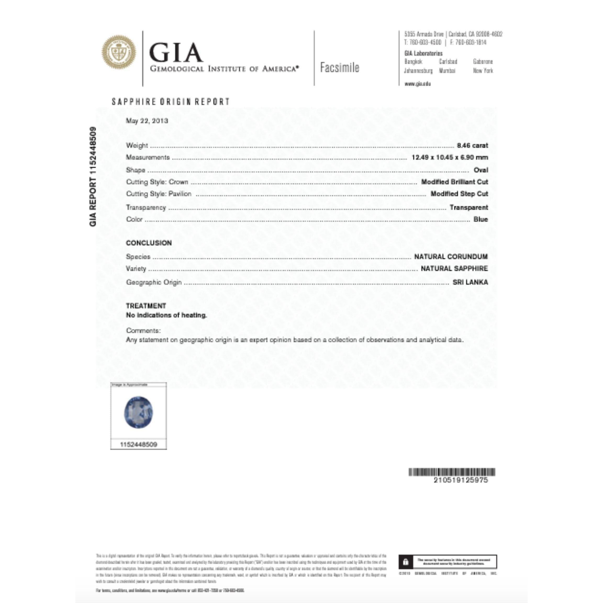 - Accompanied by GIA report no. 1152448509 stating the sapphire is natural, Sri Lanka origin, blue color, oval cut, and unheated